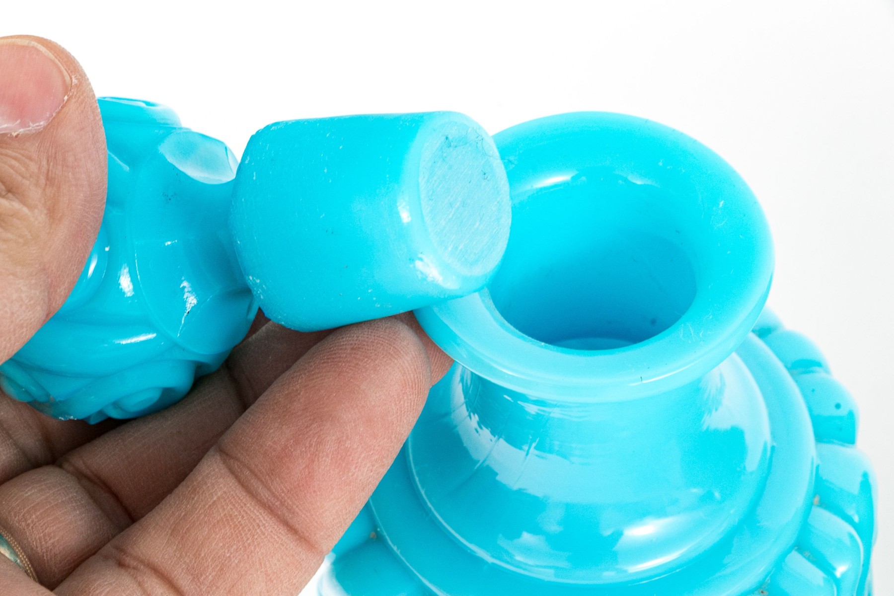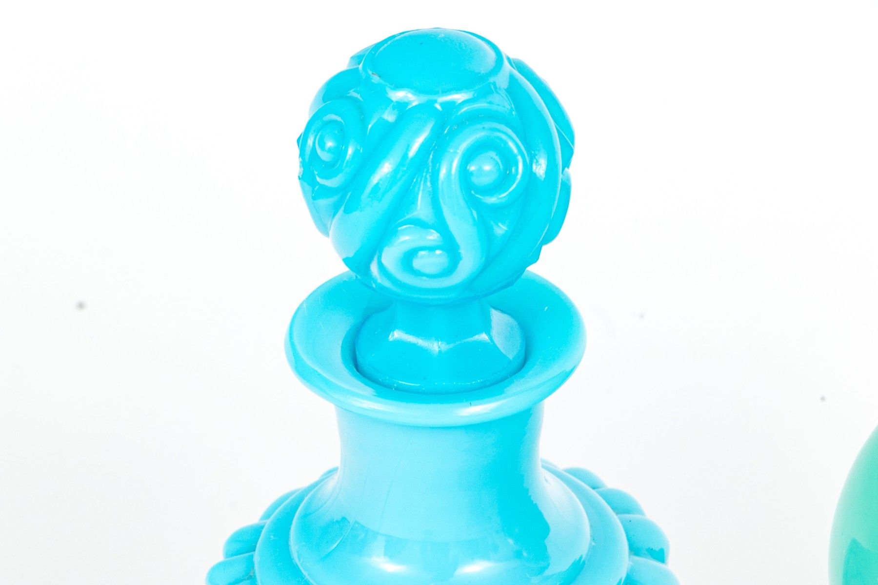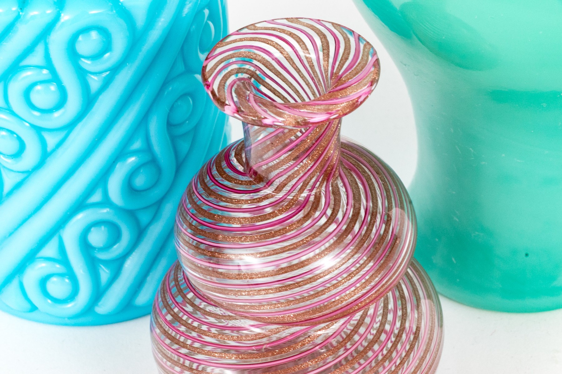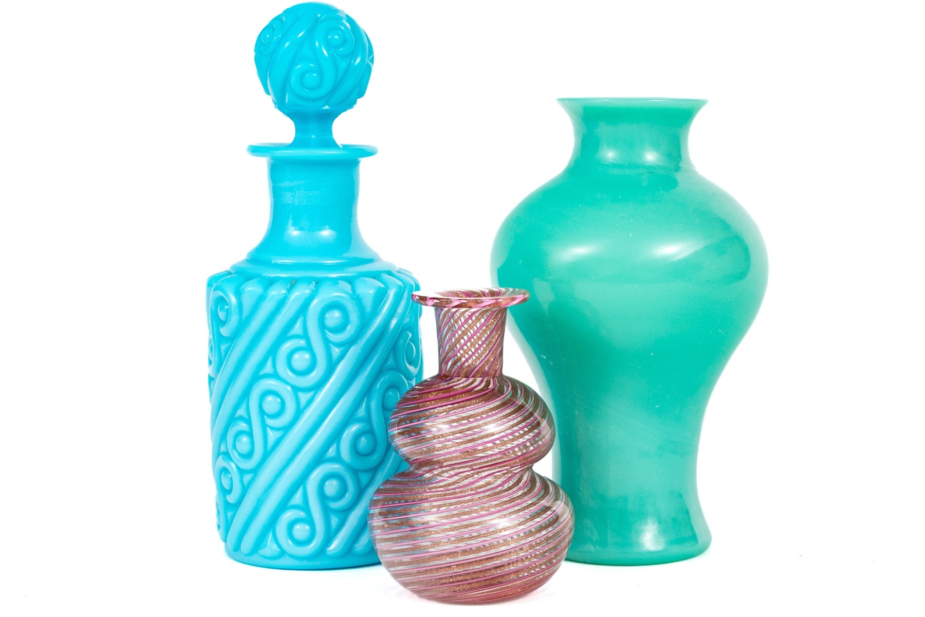 A wonderful group of vintage glass including a blue opaline milk glass decanter with a sphere finial and mallet form decorated with diagonal lines and borders of repeating infinity motifs, a teal green baluster vase with a flared rim and wide upper body tapering to the foot, and a pretty pink and gilt spiraled clear glass vase in the form of a double gourd with a raised neck.