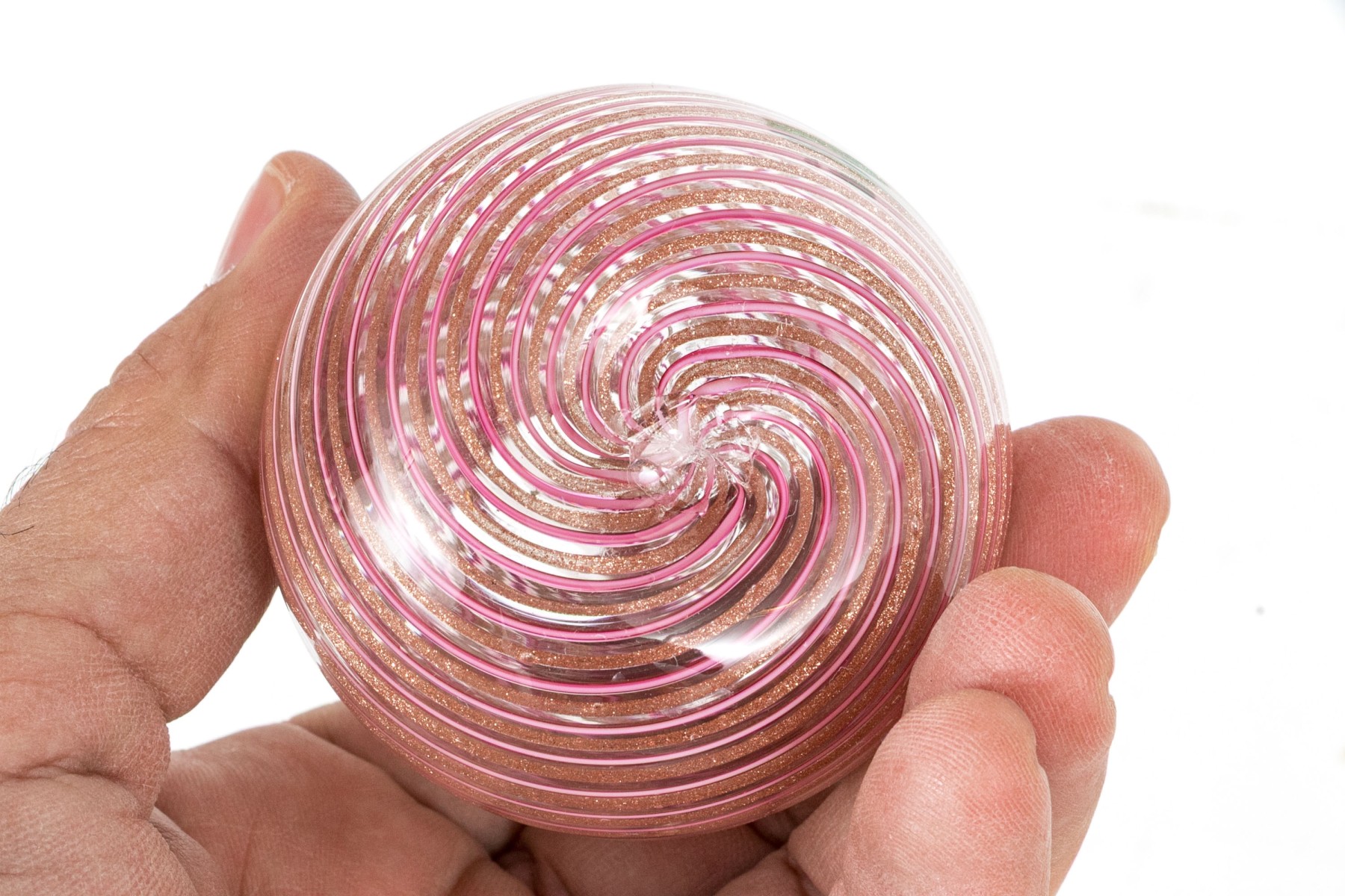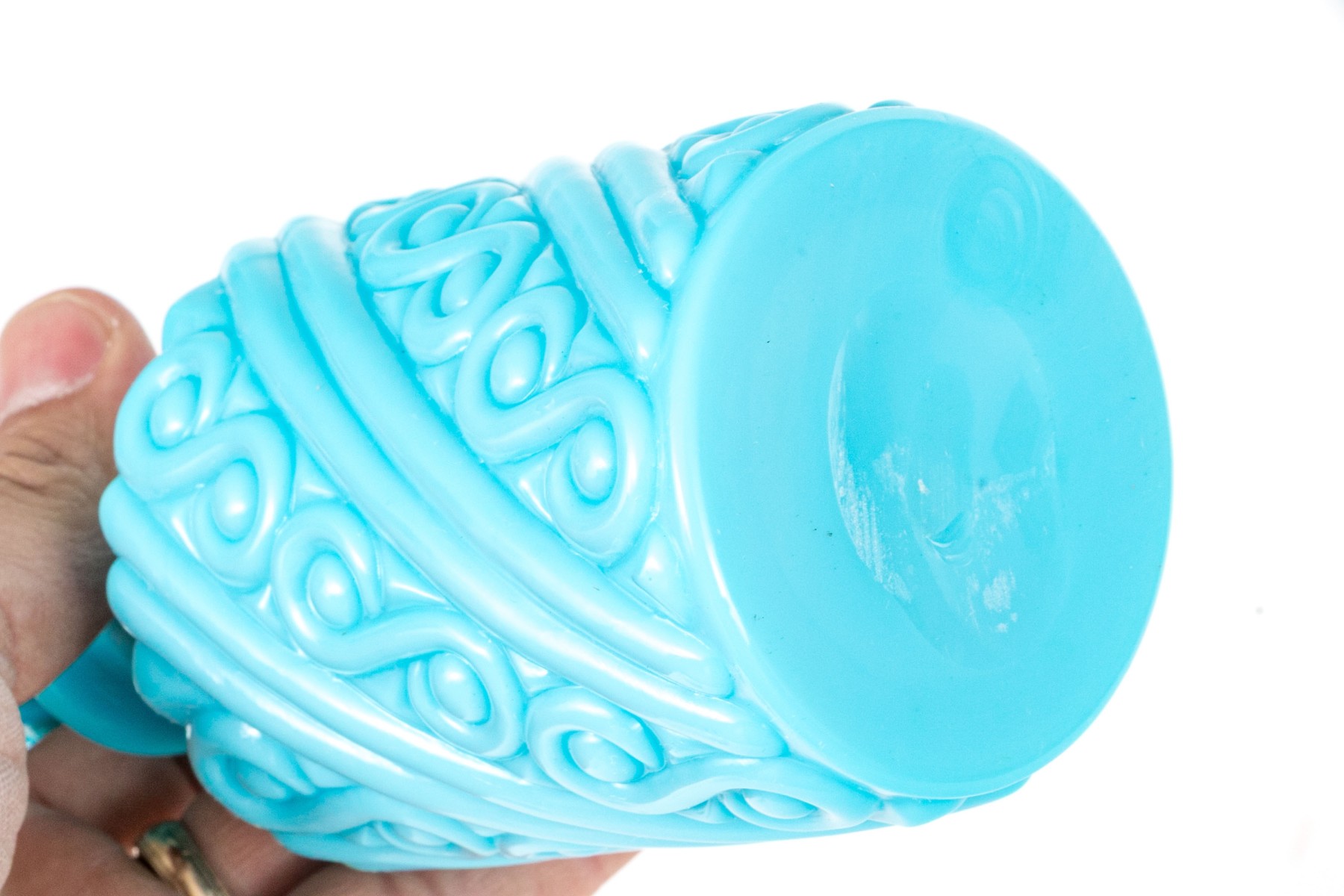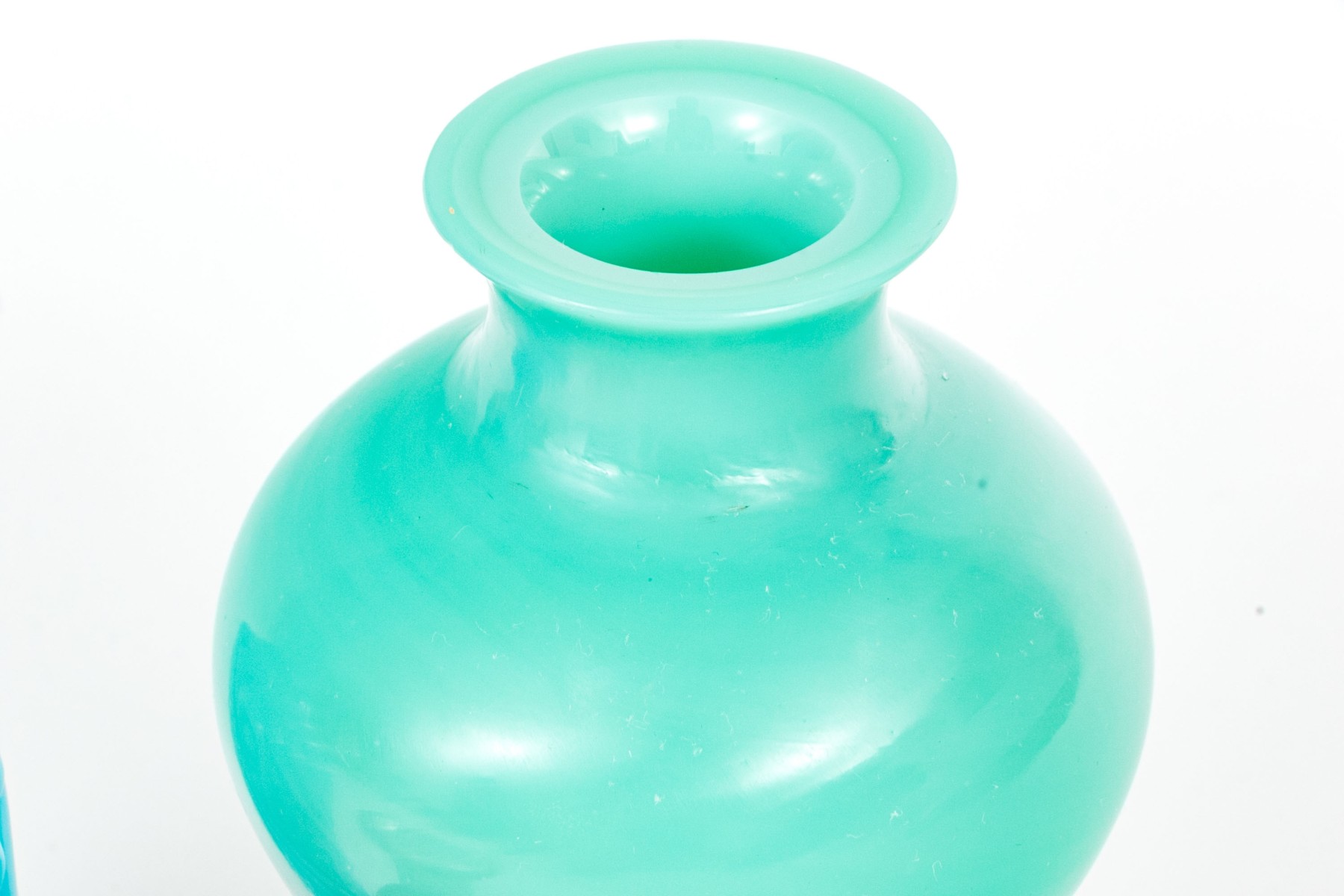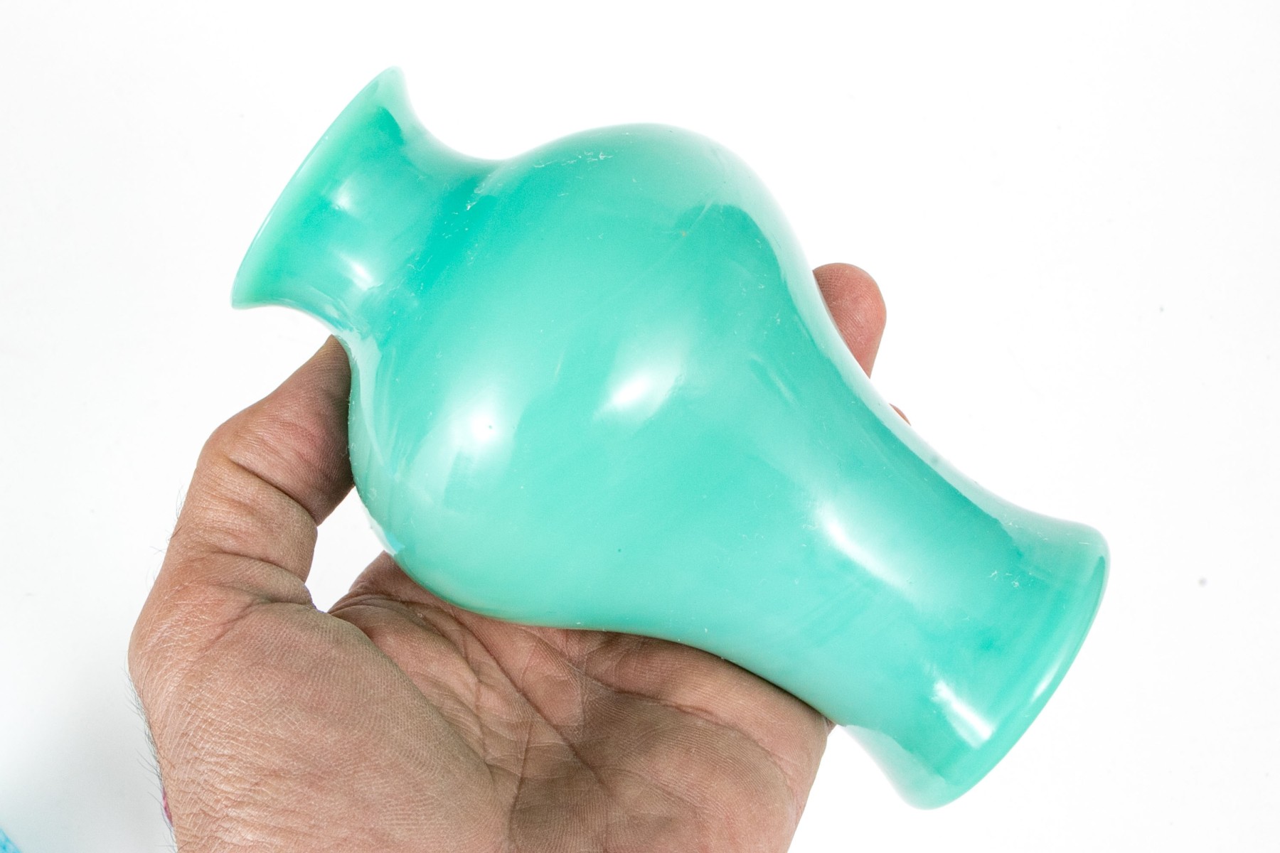 A wonderful group of vintage glass including a blue opaline milk glass decanter with a sphere finial and mallet form decorated with diagonal lines and borders of repeating infinity motifs, a teal green baluster vase with a flared rim and wide upper body tapering to the foot, and a pretty pink and gilt spiraled clear glass vase in the form of a double gourd with a raised neck.