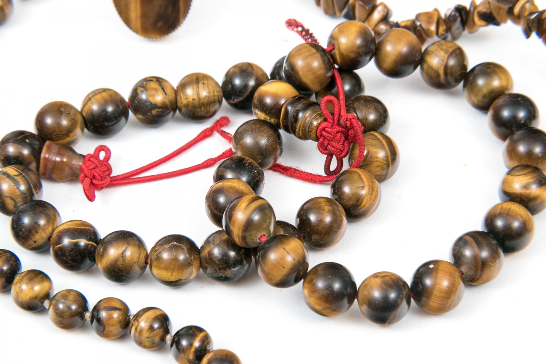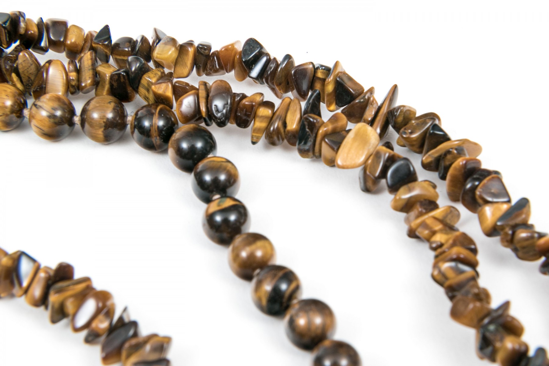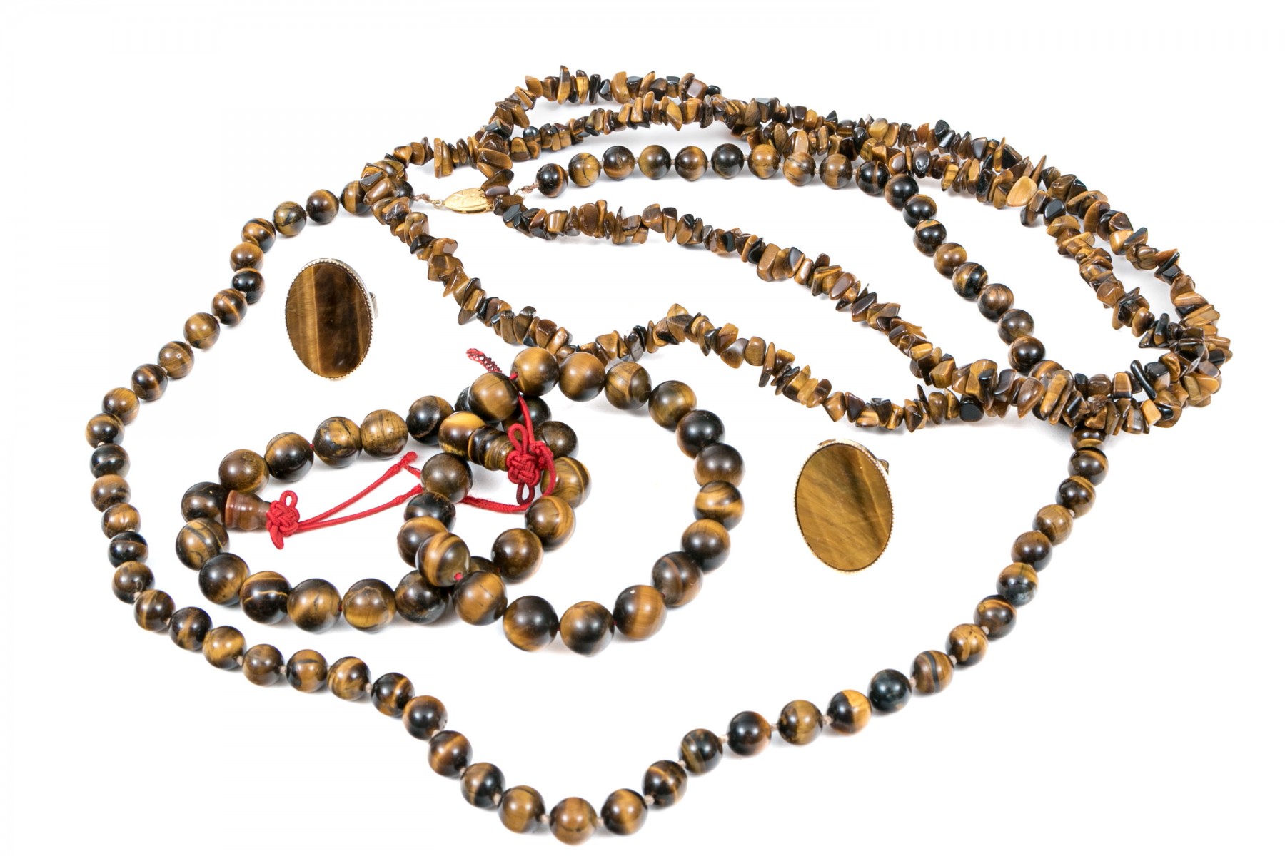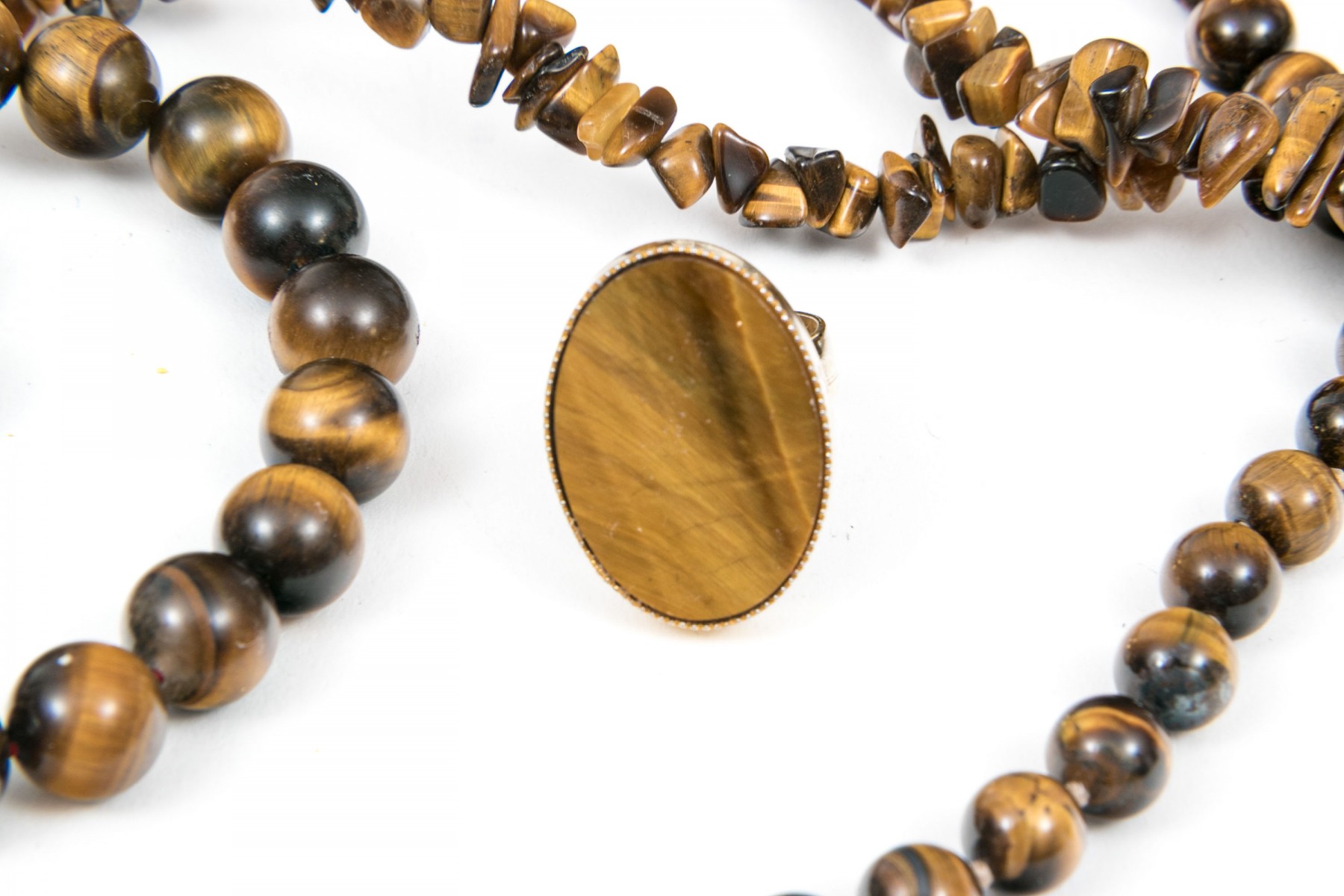 A collection of tiger's eye jewelry. Strung beads of tiger's eye necklaces and bracelets. With these are two rings. Necklace of round beads secures with a silver fish hook clasp. The rings both have adjustable bands.