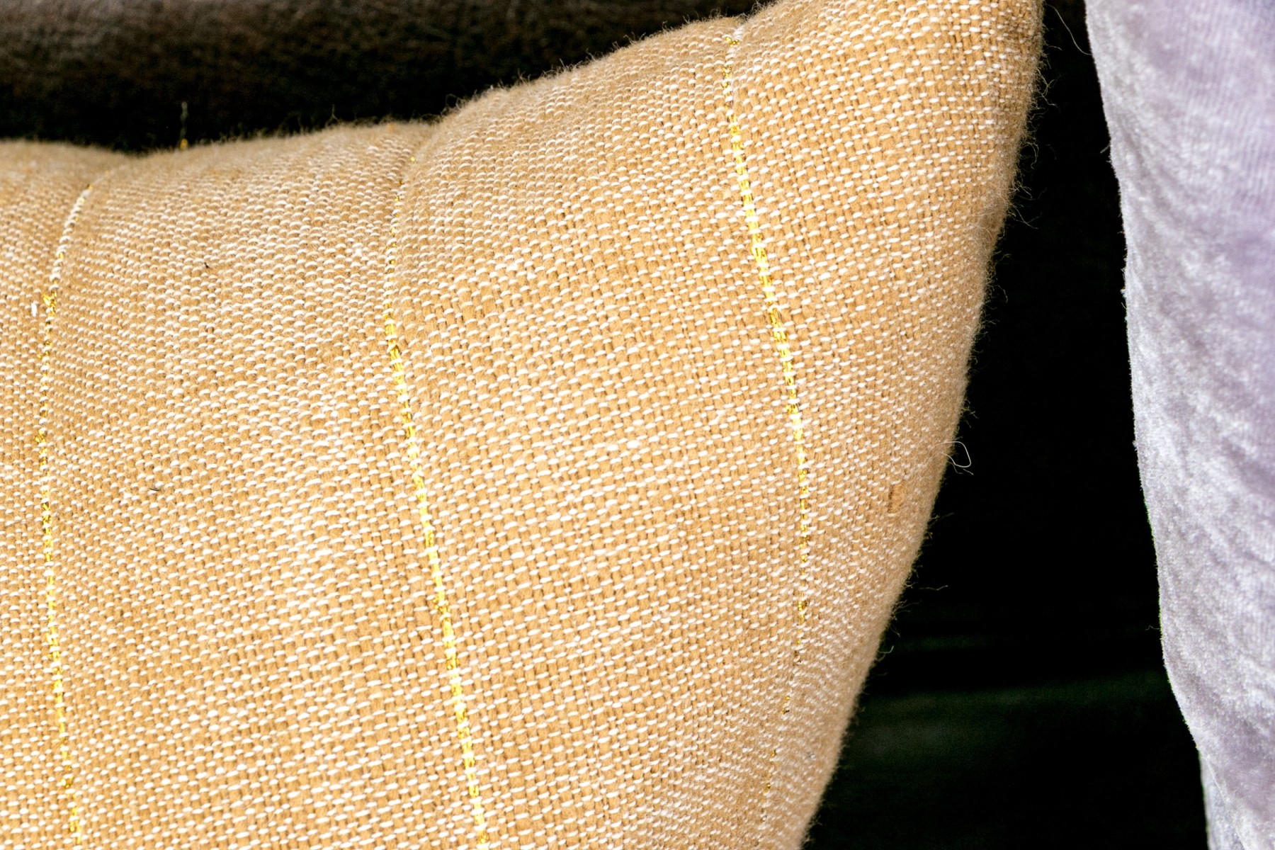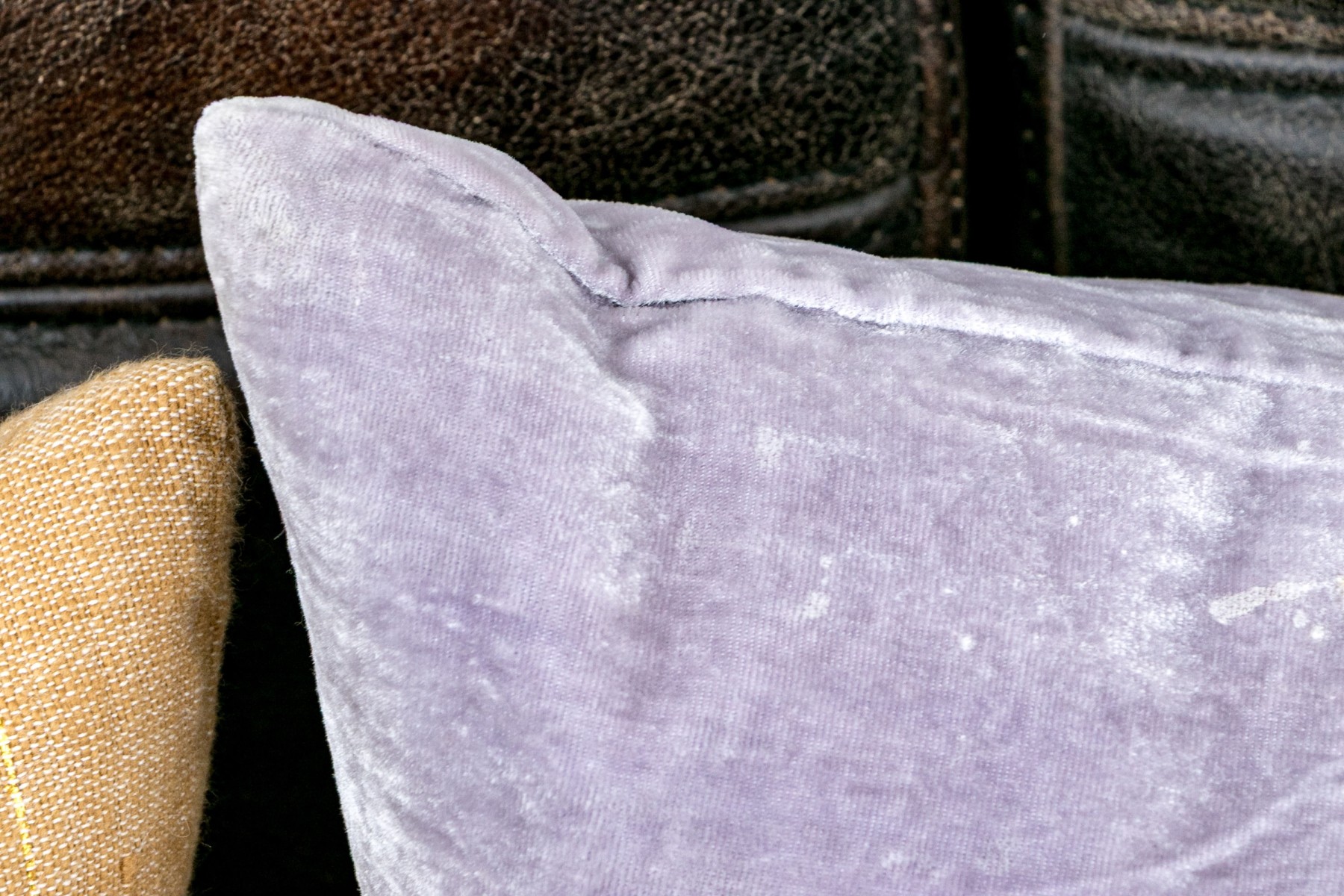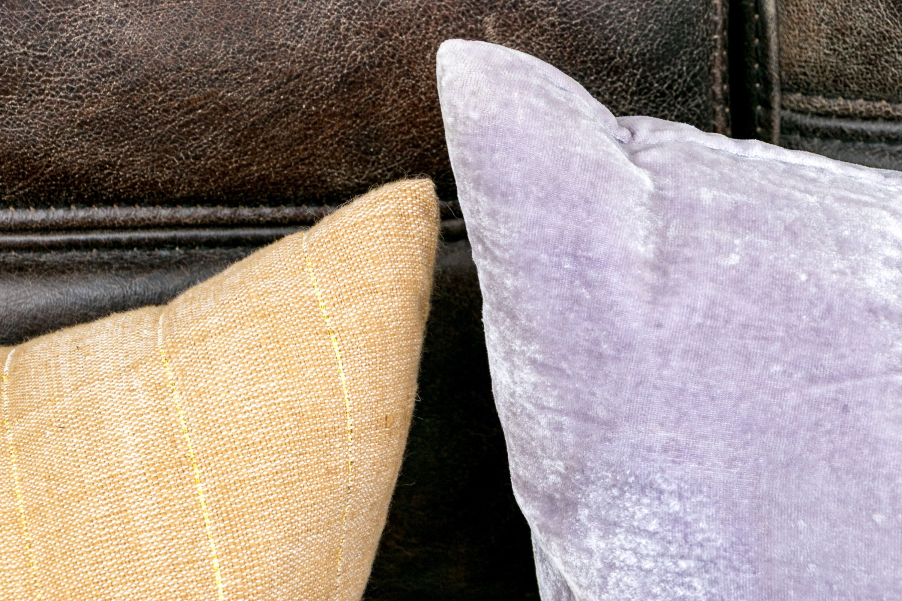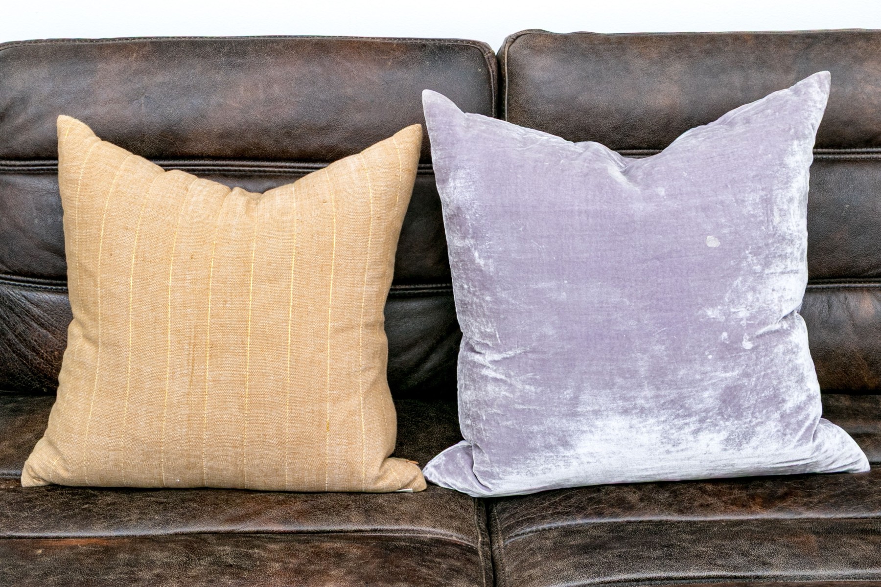 A fabulous duo of luxurious down-filled accent pillows including a BoleĢ Road Textiles pillow in beautiful creamsicle orange with fine yellow vertical stripes. Accompanied by a chic abcDNA pillow in gray-purple corded velvet. Both with zippers for easy cleaning.