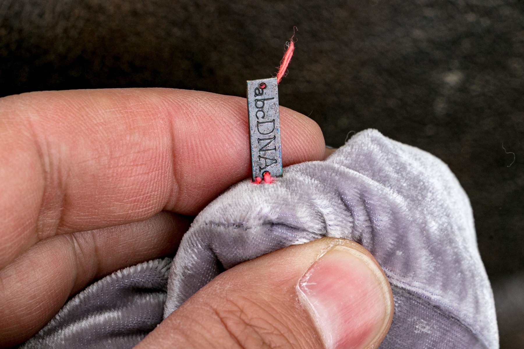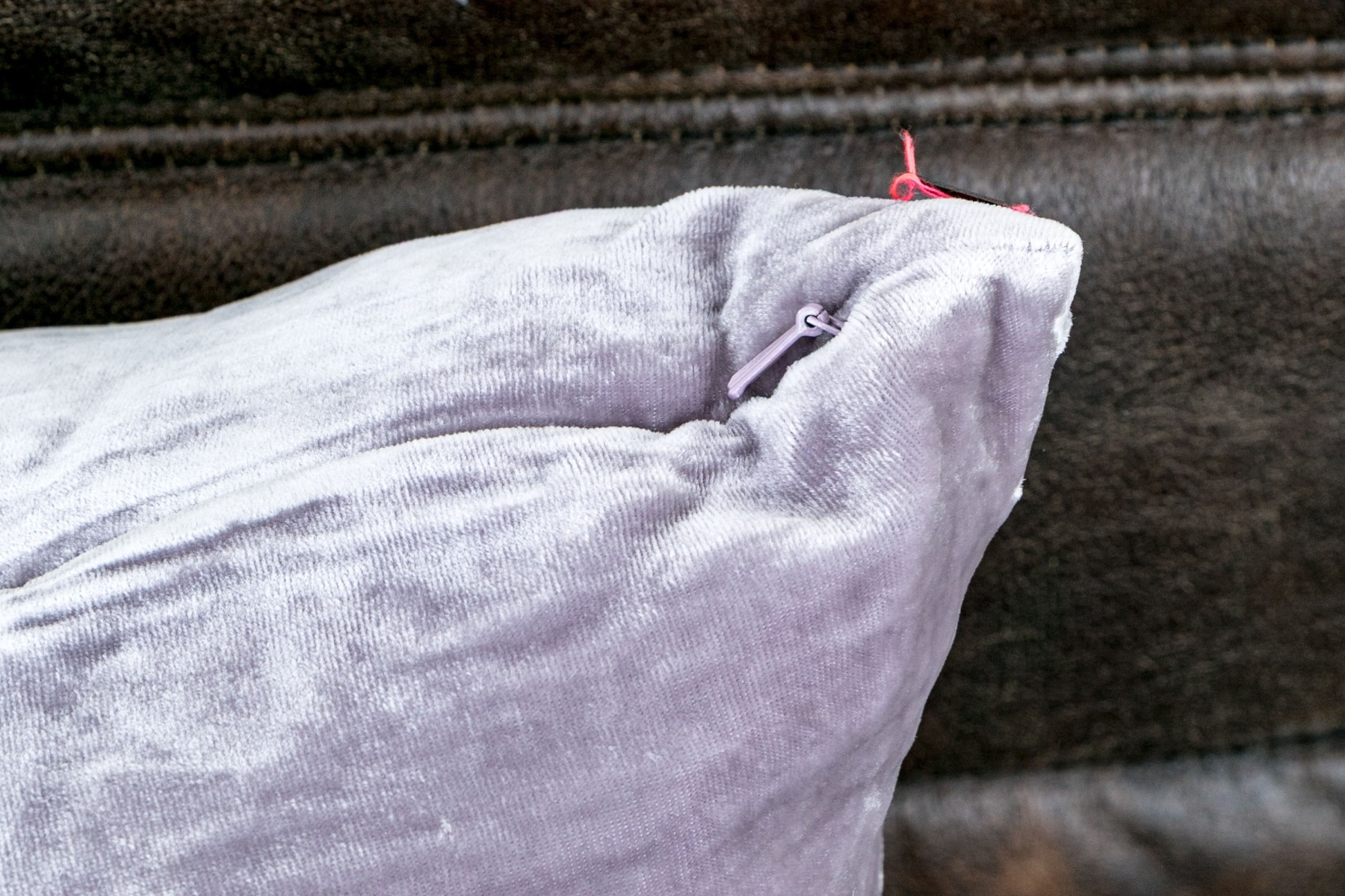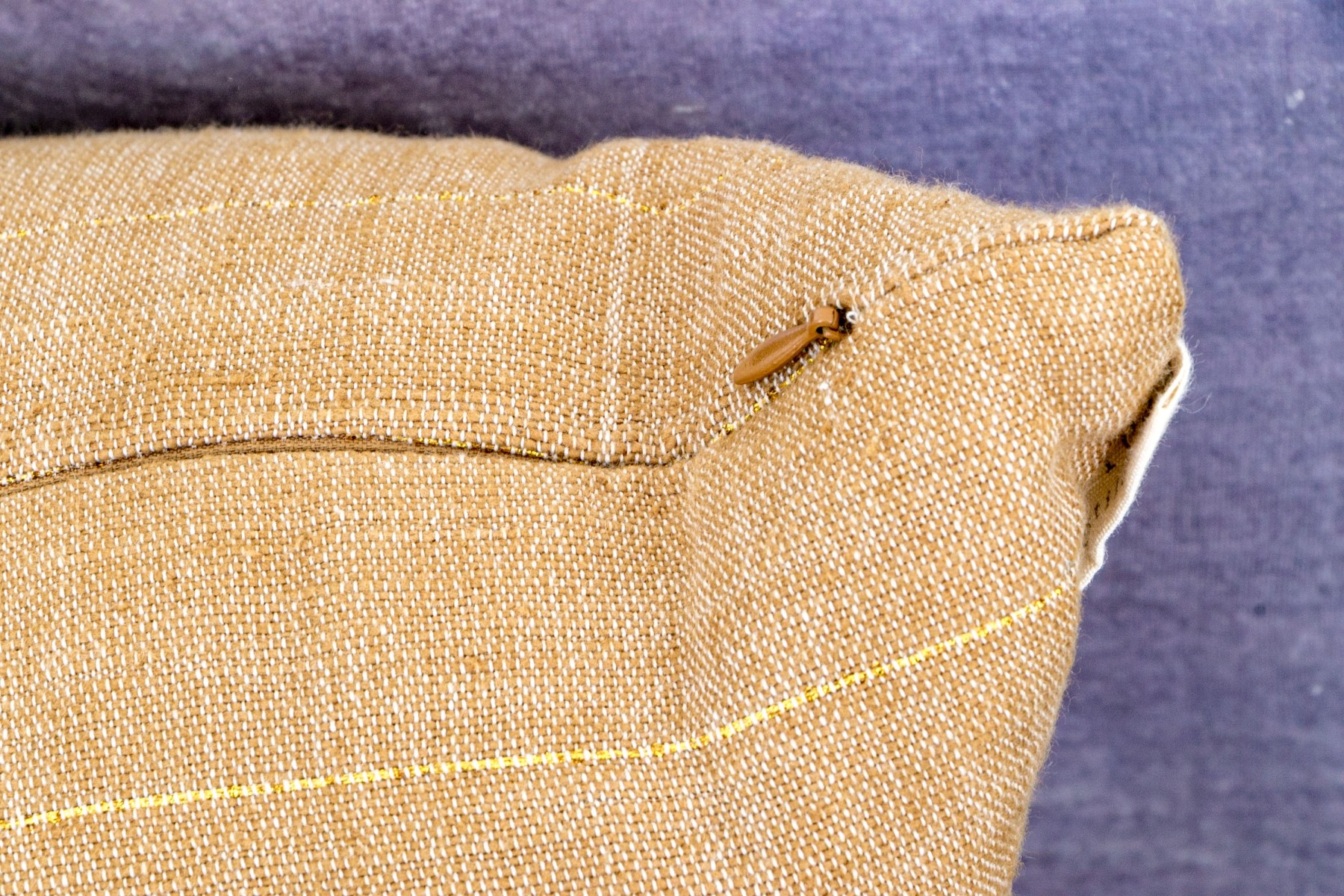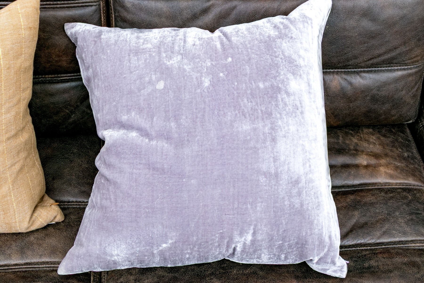 A fabulous duo of luxurious down-filled accent pillows including a BoleĢ Road Textiles pillow in beautiful creamsicle orange with fine yellow vertical stripes. Accompanied by a chic abcDNA pillow in gray-purple corded velvet. Both with zippers for easy cleaning.