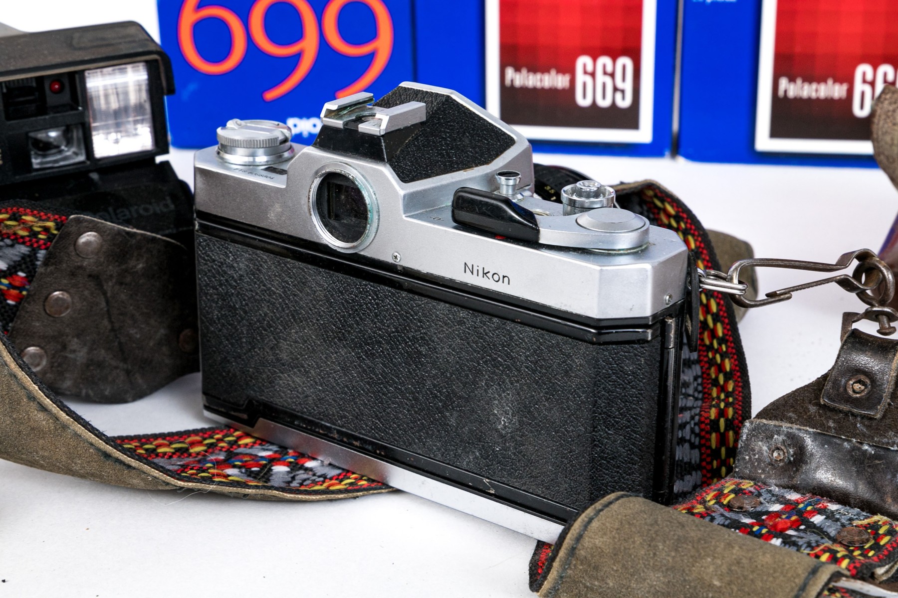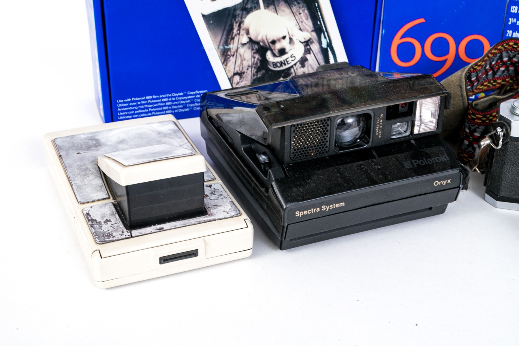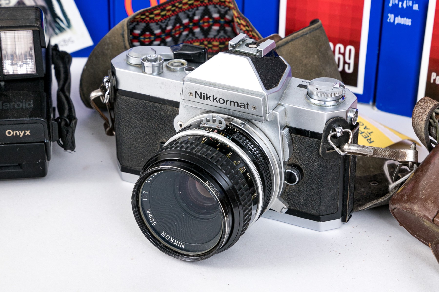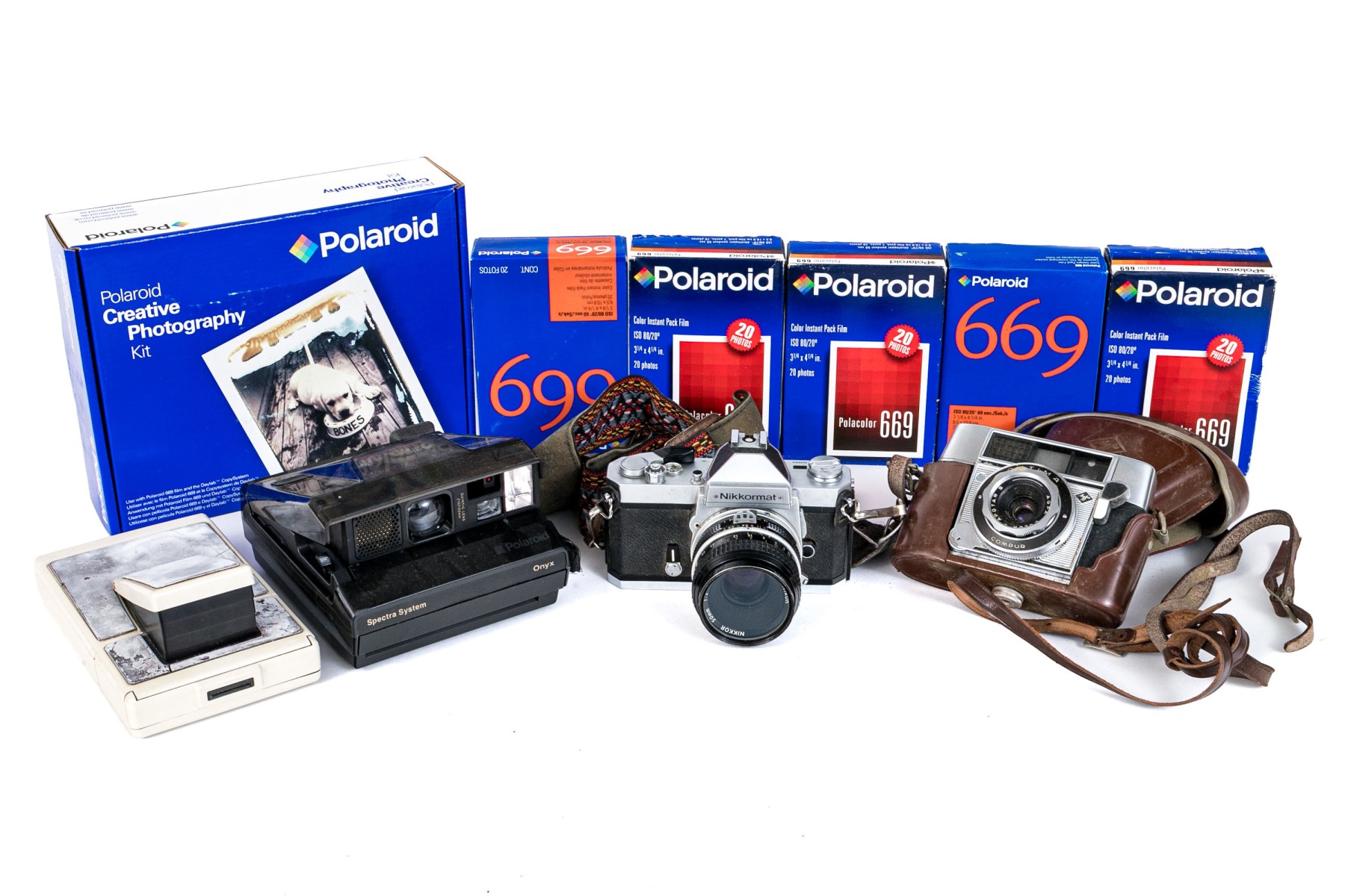 Comprised of an Agfa Optima Compur in leather case, a Nikkormat Nikon Camera, a Polaroid Spectra system onyx folding flash camera, a polaroid manual to manipulations, a Poloroid land camera with instructions and leather case, a polaroid creative photography kit, and five boxes of polaroid film.