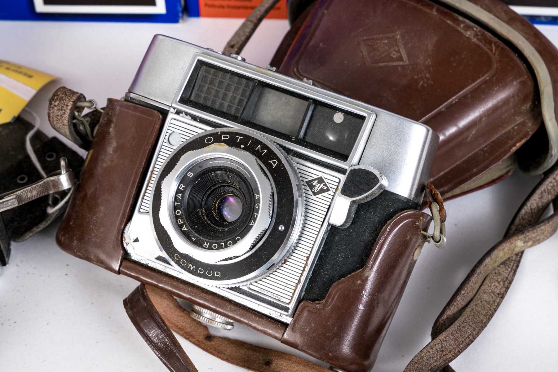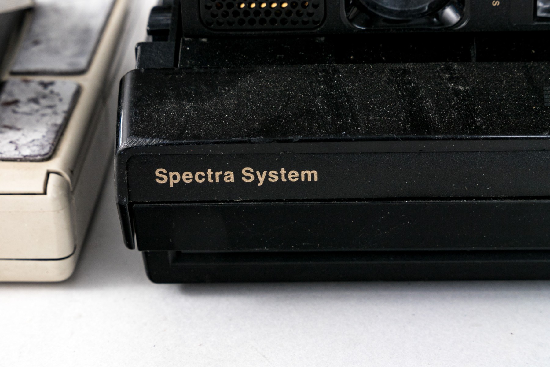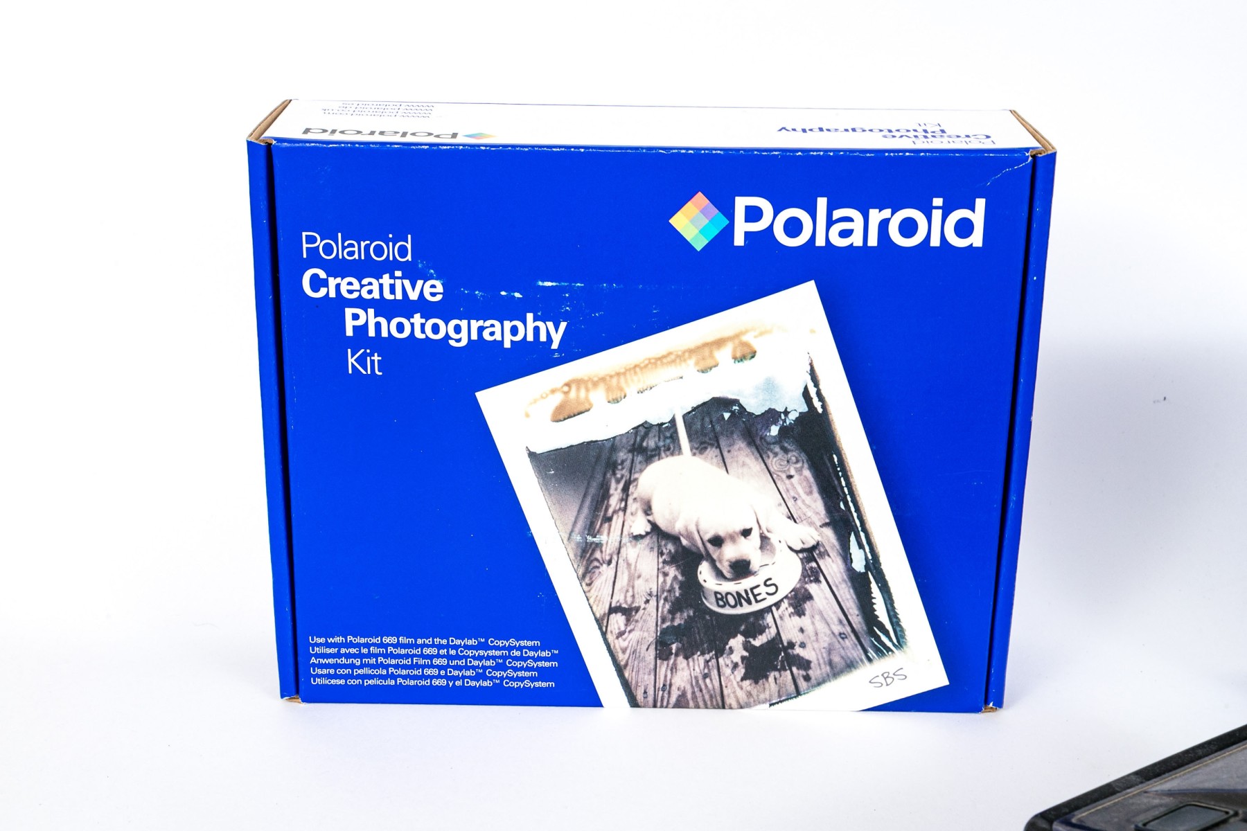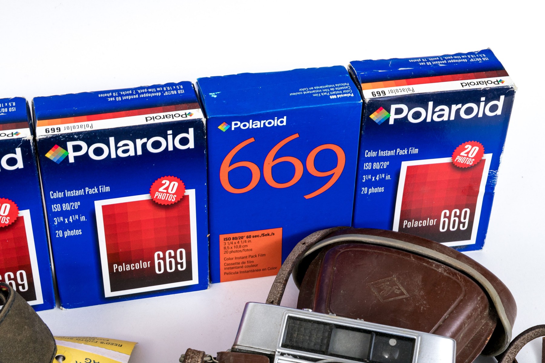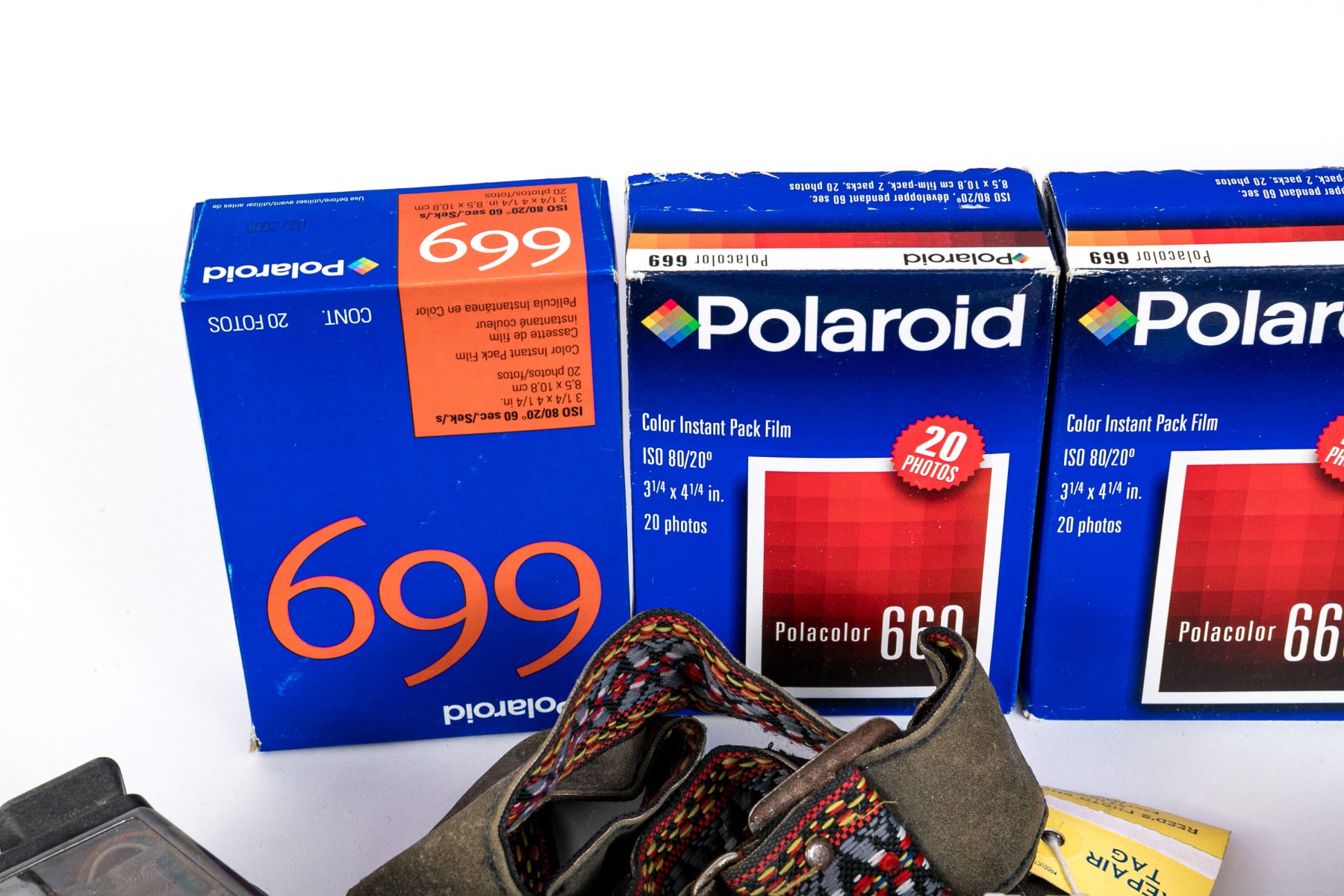 Comprised of an Agfa Optima Compur in leather case, a Nikkormat Nikon Camera, a Polaroid Spectra system onyx folding flash camera, a polaroid manual to manipulations, a Poloroid land camera with instructions and leather case, a polaroid creative photography kit, and five boxes of polaroid film.