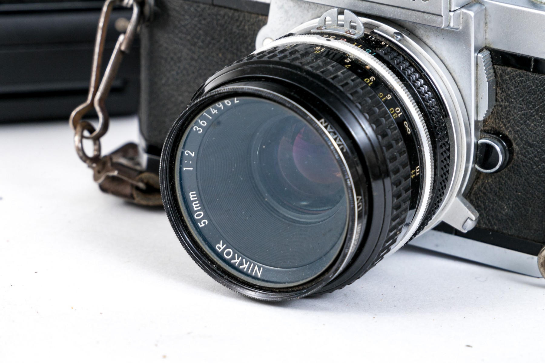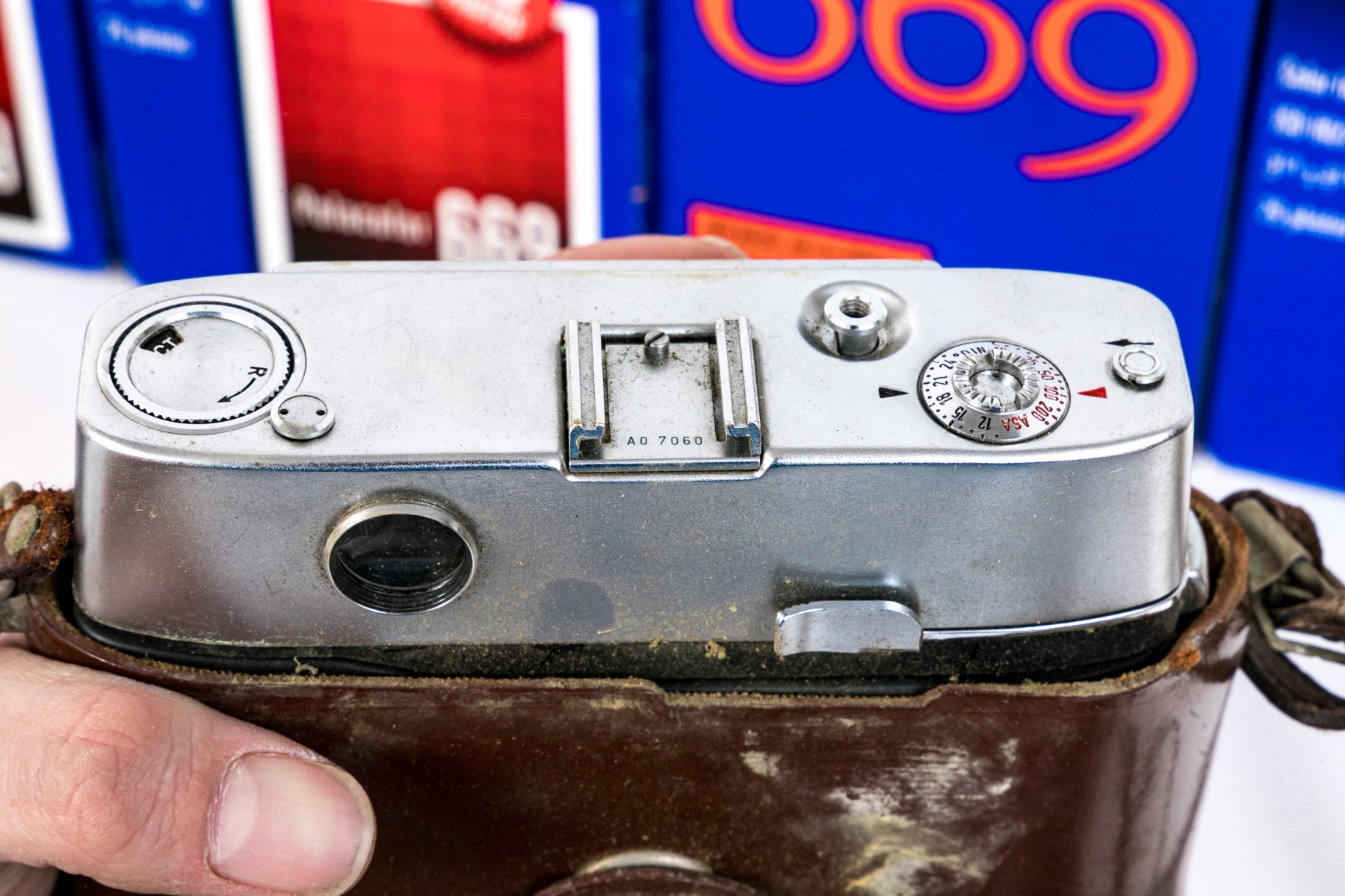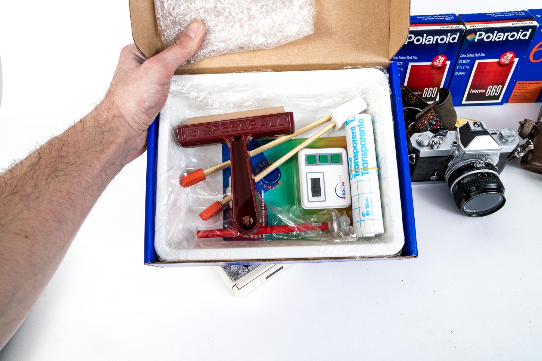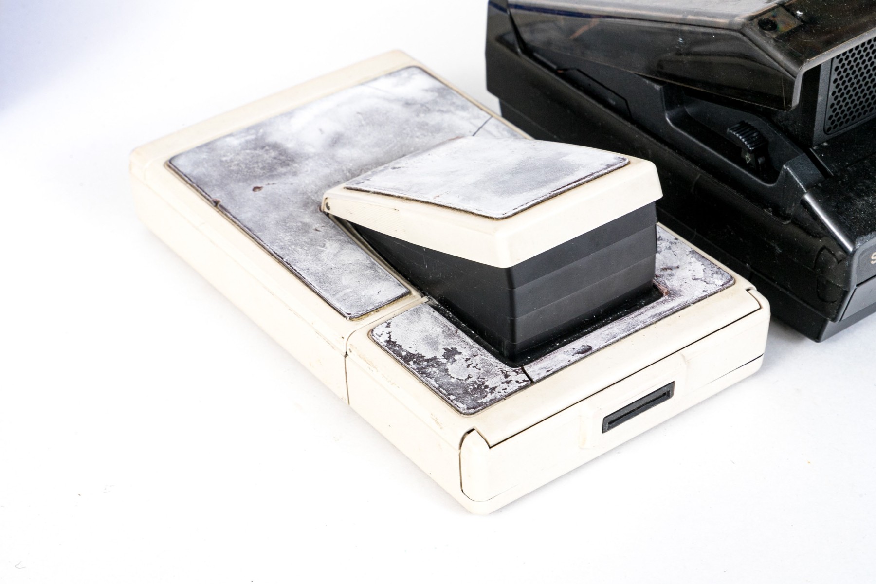 Comprised of an Agfa Optima Compur in leather case, a Nikkormat Nikon Camera, a Polaroid Spectra system onyx folding flash camera, a polaroid manual to manipulations, a Poloroid land camera with instructions and leather case, a polaroid creative photography kit, and five boxes of polaroid film.