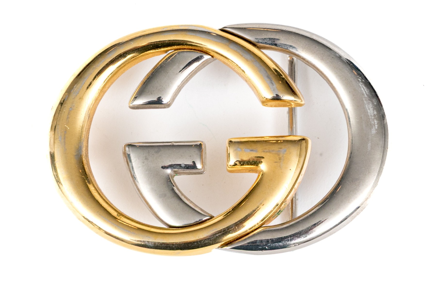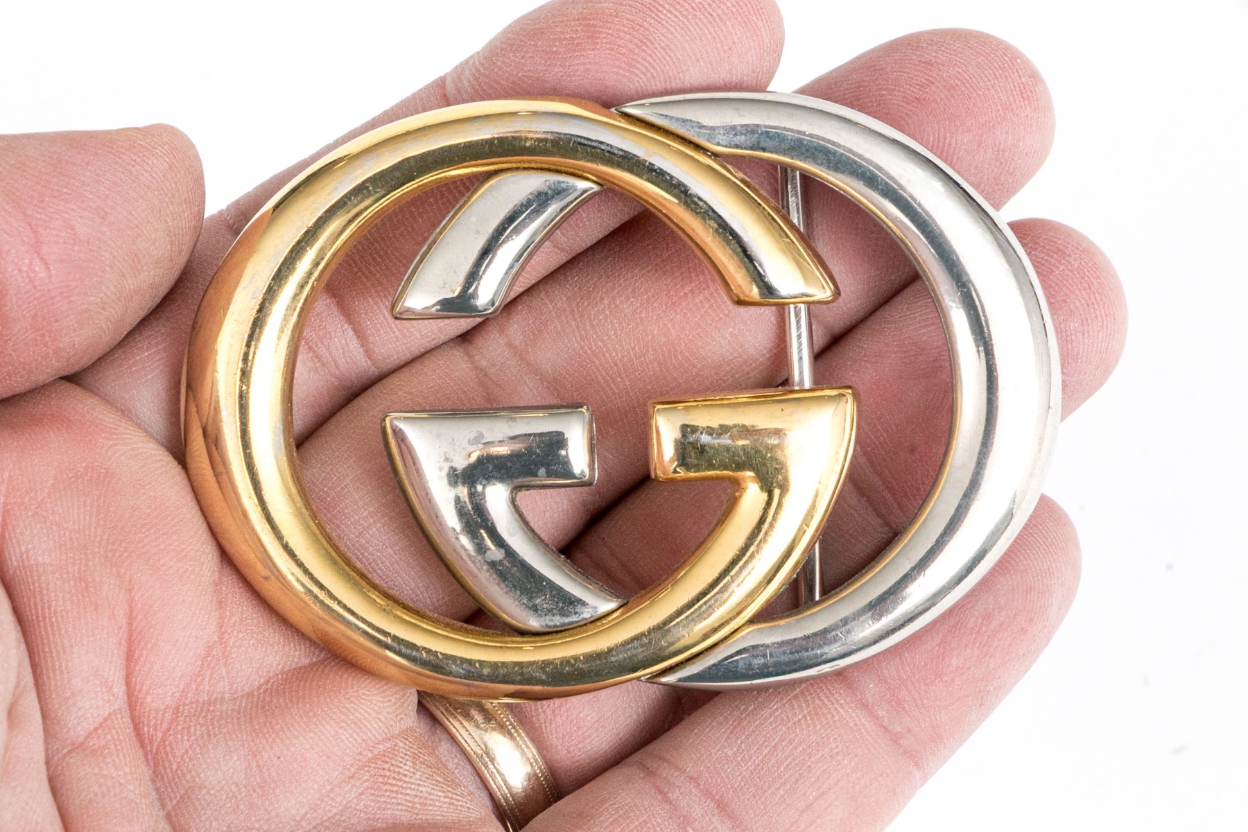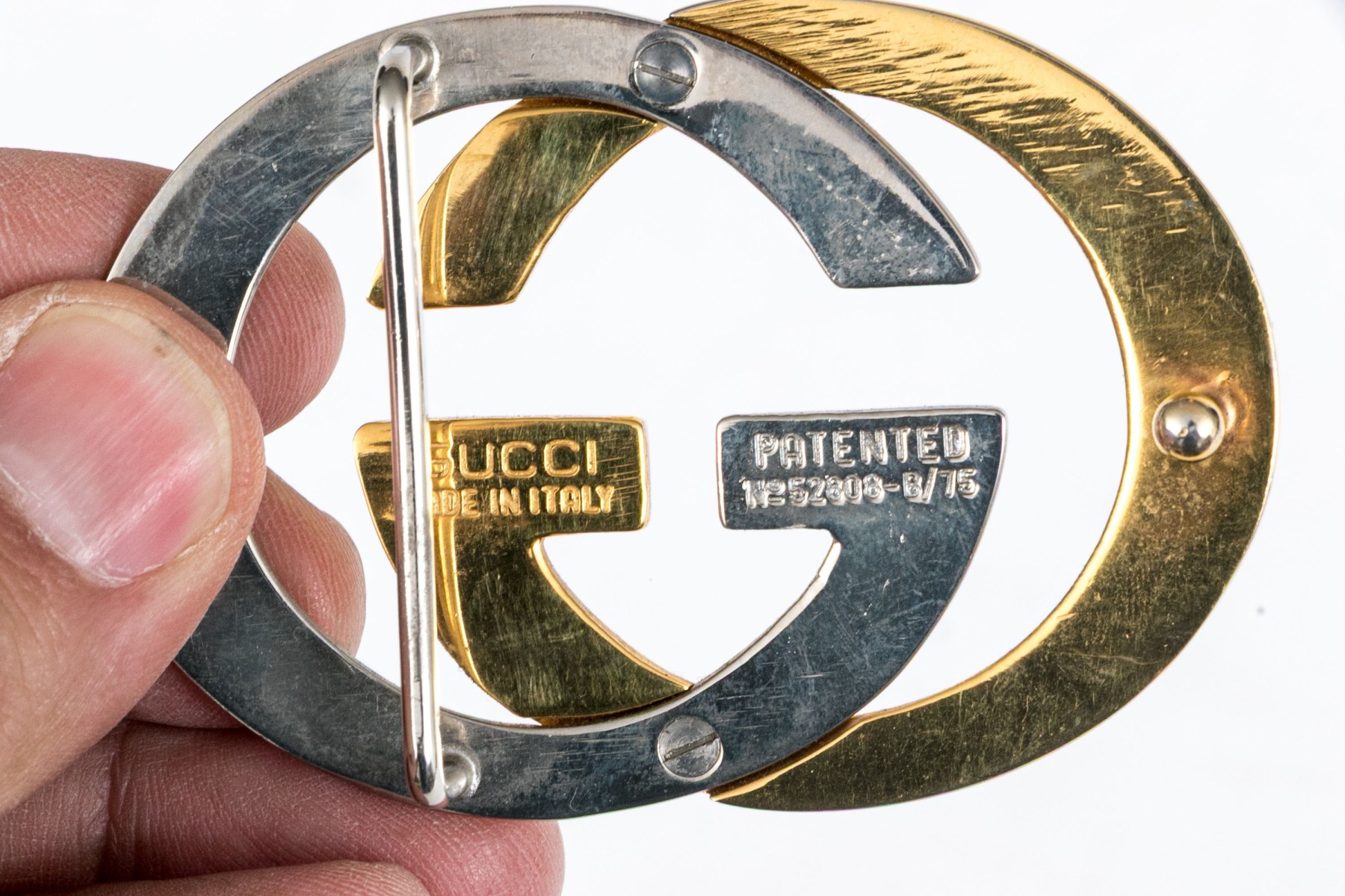 A classic Italian made Gucci belt buckle showcasing the logo in gray and yellow metal. Marked on the verso.