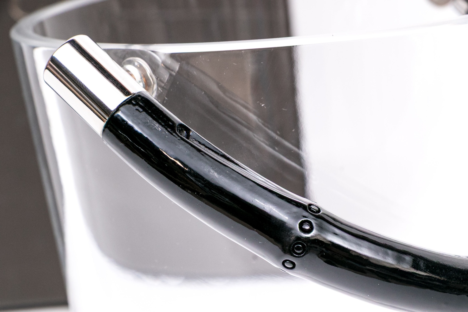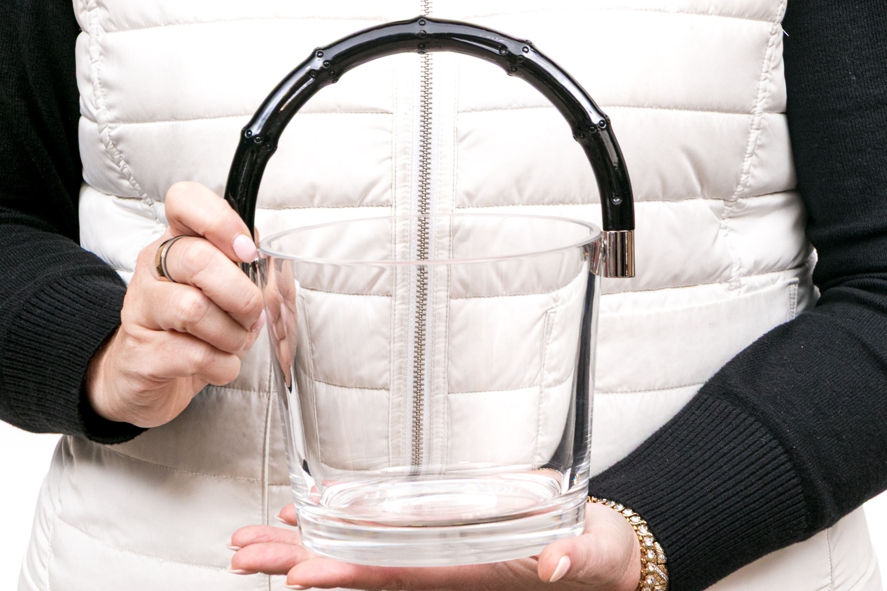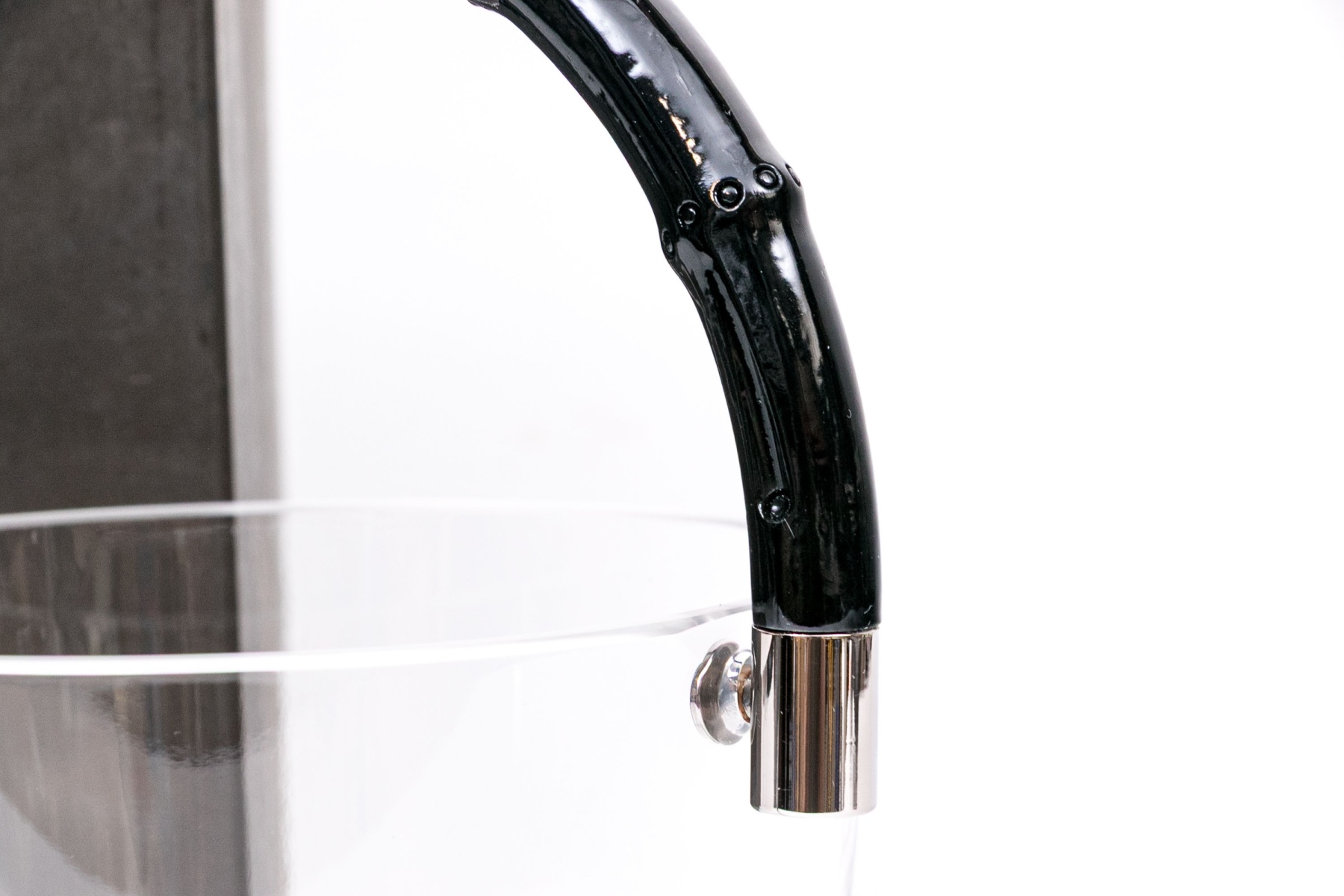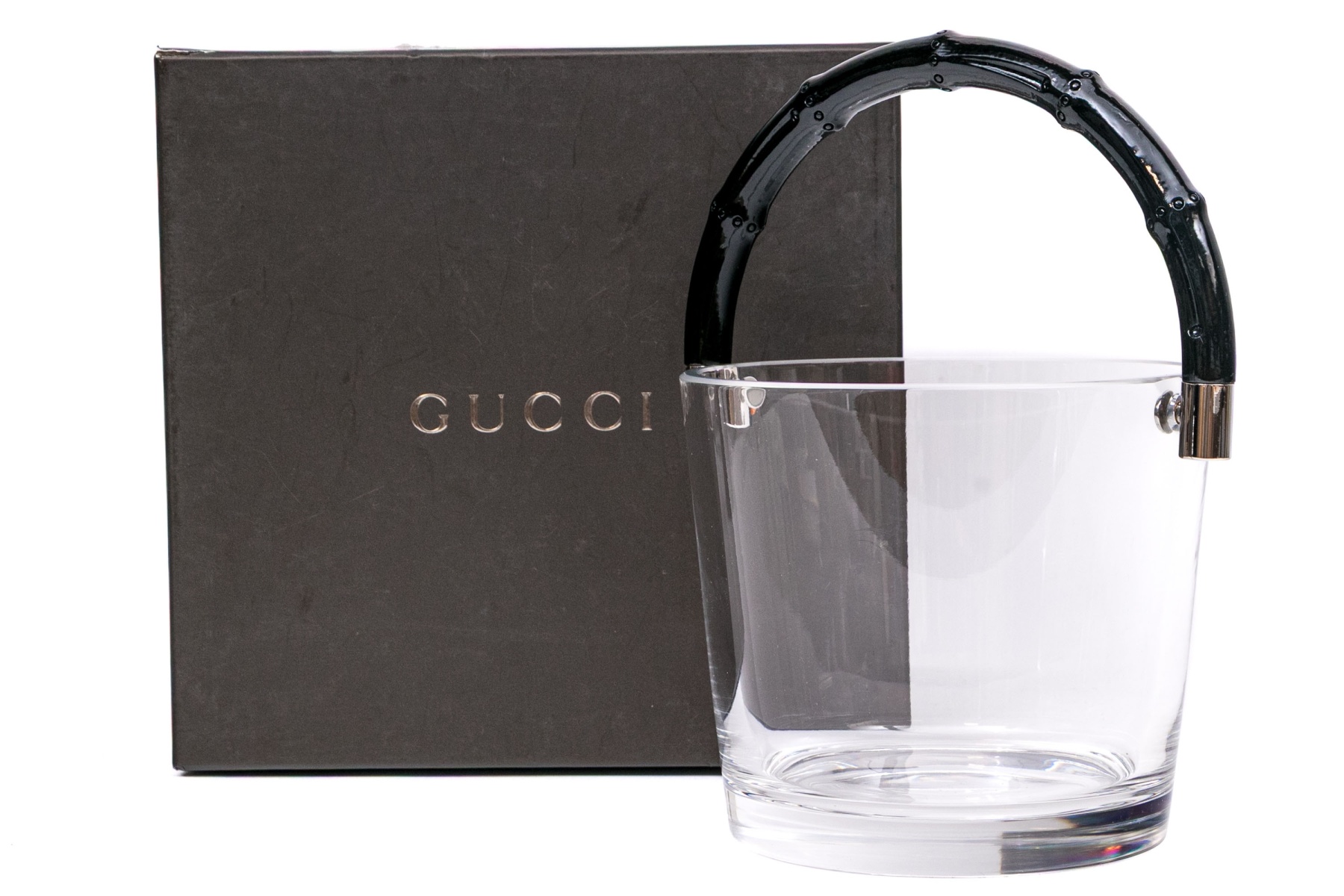 This stunning contemporary ice bucklet features a sleek, smooth glass body, and is decorated with a simple black laquered bamboo motif handle. Accompanied by the original fitted box. $550 original retail