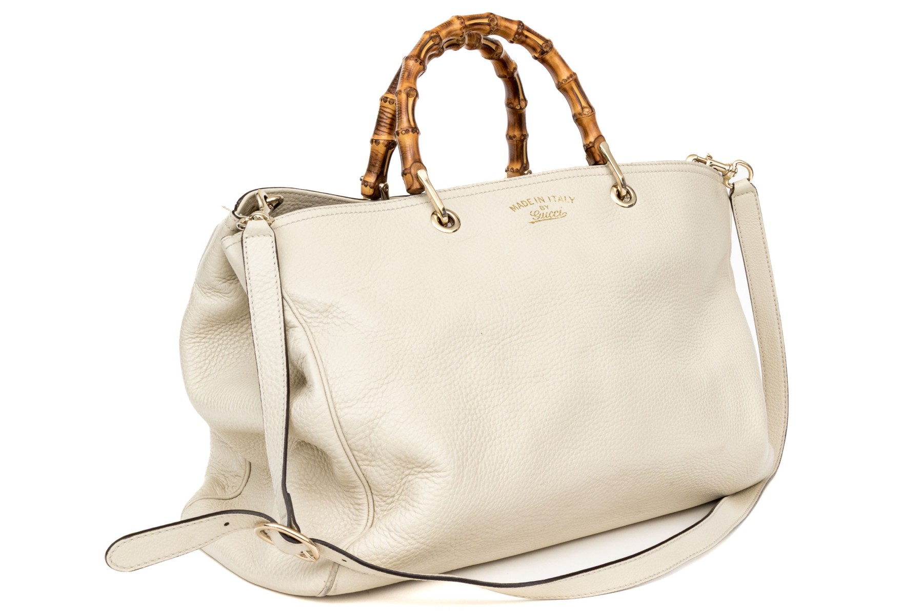 Crafted from supple, pebbled leather in a creamy off-white shade. The stars of the show are the signature Gucci arched bamboo top handles. The bag has a spacious, slightly slouchy rectangular body with soft edges—structured enough to keep form but relaxed enough for everyday use. and also includes a detachable/adjustable long shoulder strap in matching leather,. The front is embossed with “Made in Italy by Gucci".