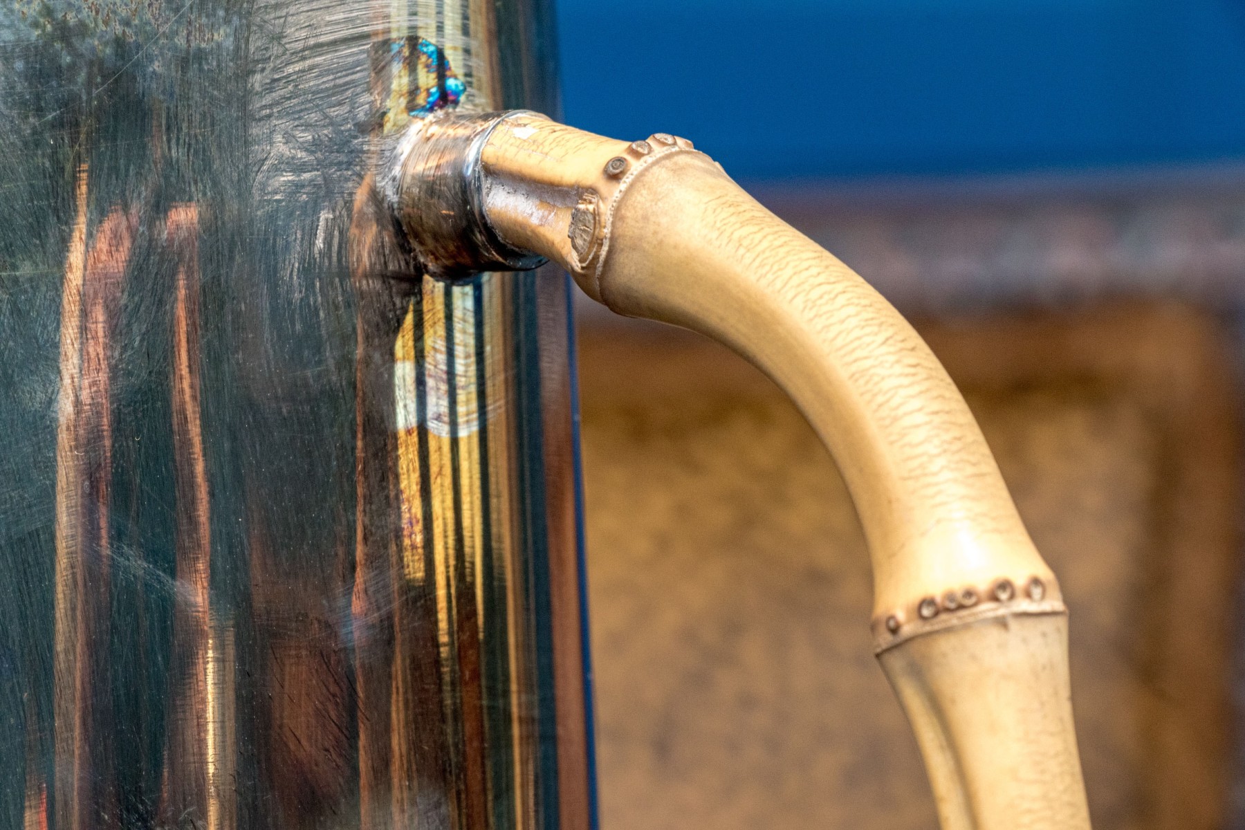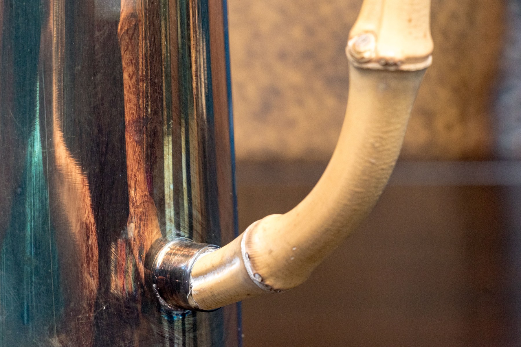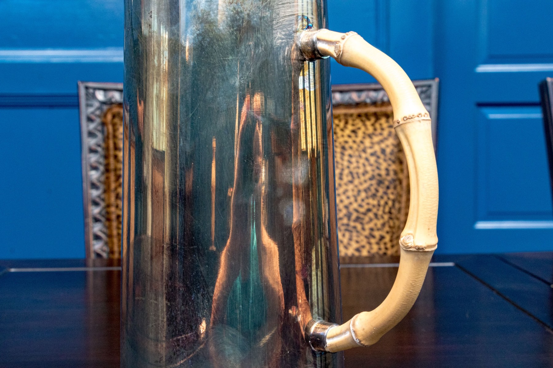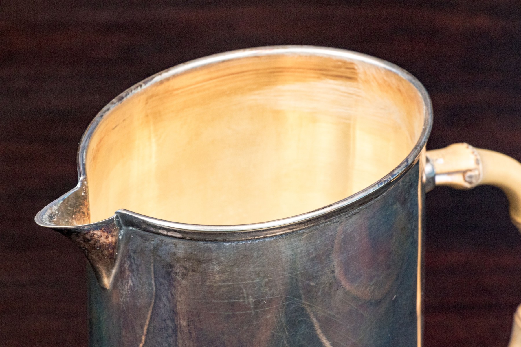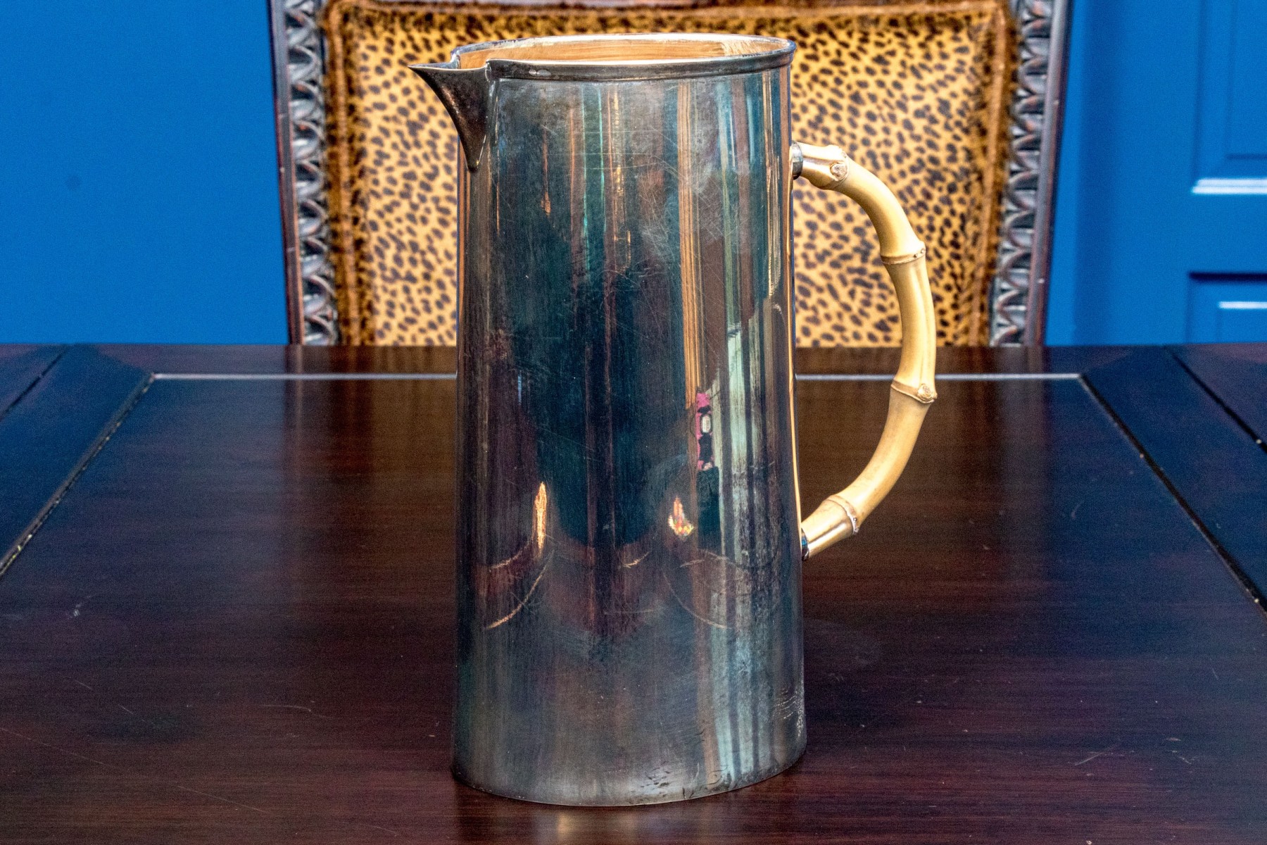 A wonderful Gucci silverplated pitcher with classic mid-century style, showcasing a small pointed spout over a tall and gently tapered cylindrical body affixed with an arched light brown bamboo handle. Marked underfoot.