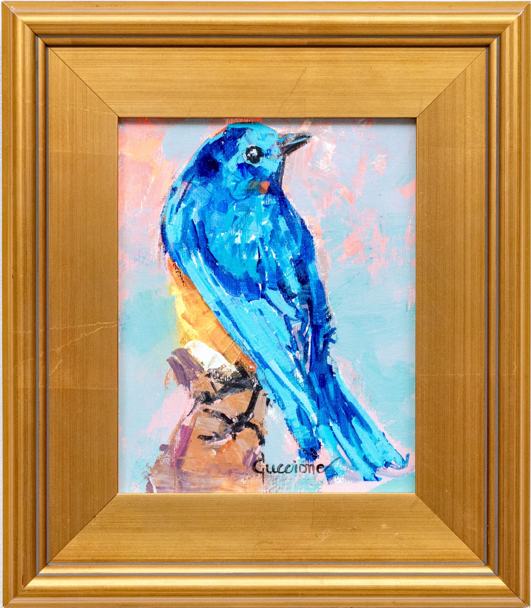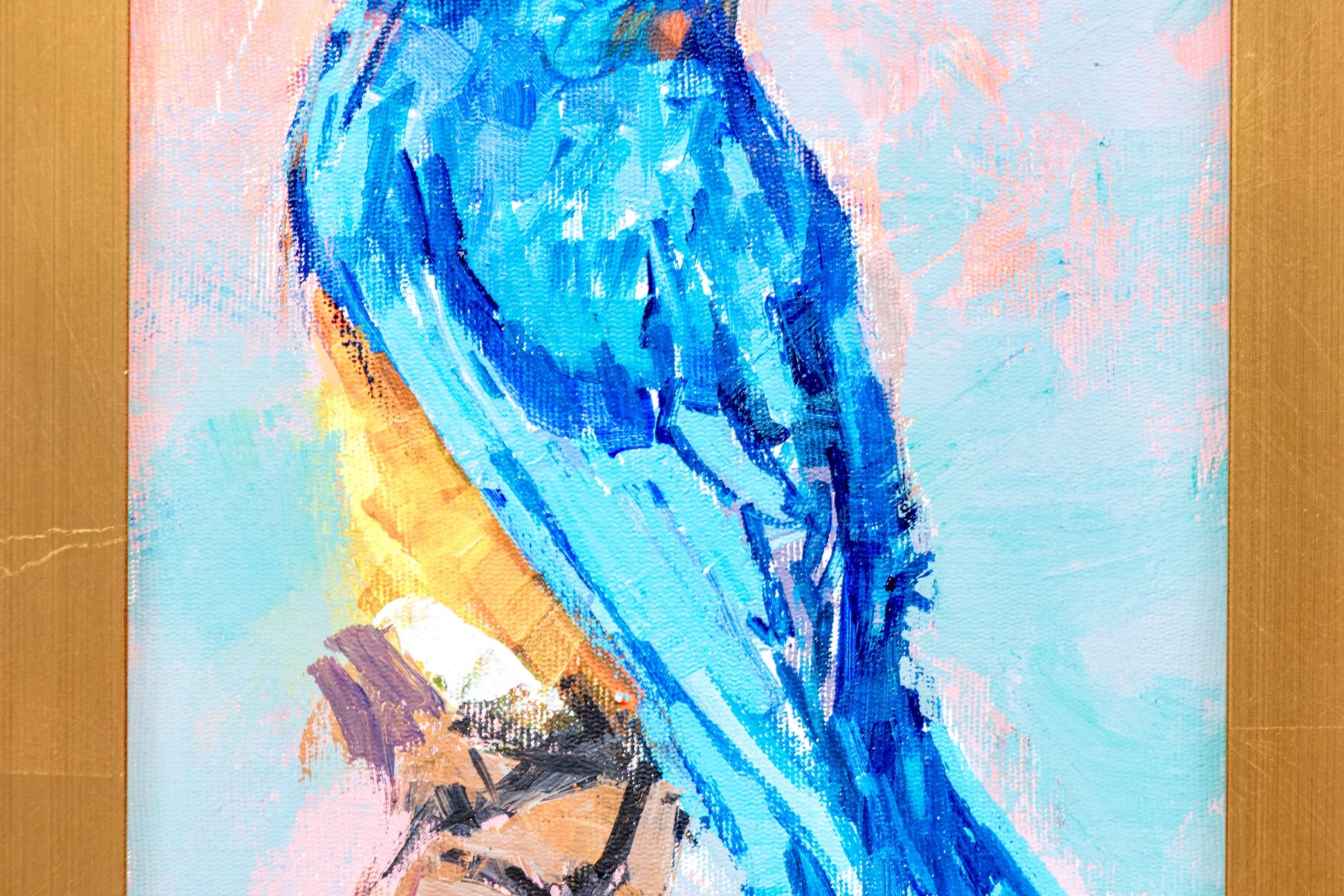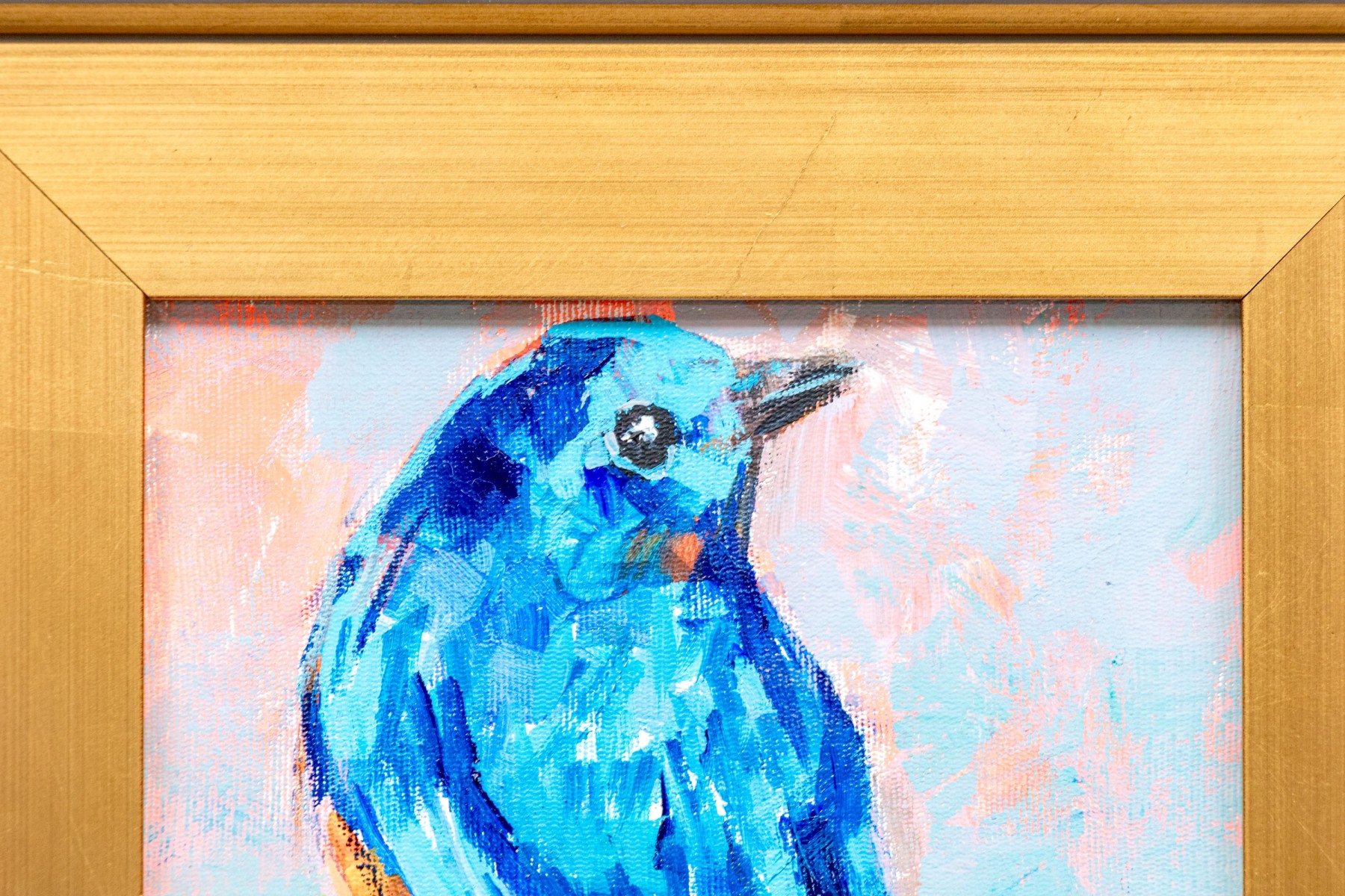 Signed lower right quadrant. Depicting a vibrantly painted blue bird, appearing perched on a tree branch with its head turned back. The background with an abstract motif with vibrant oranges and green-blue hues.