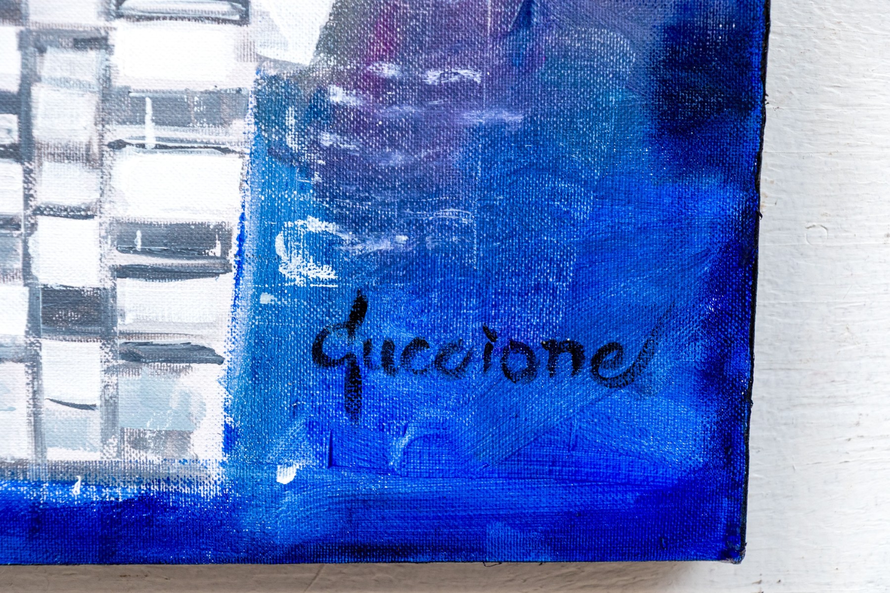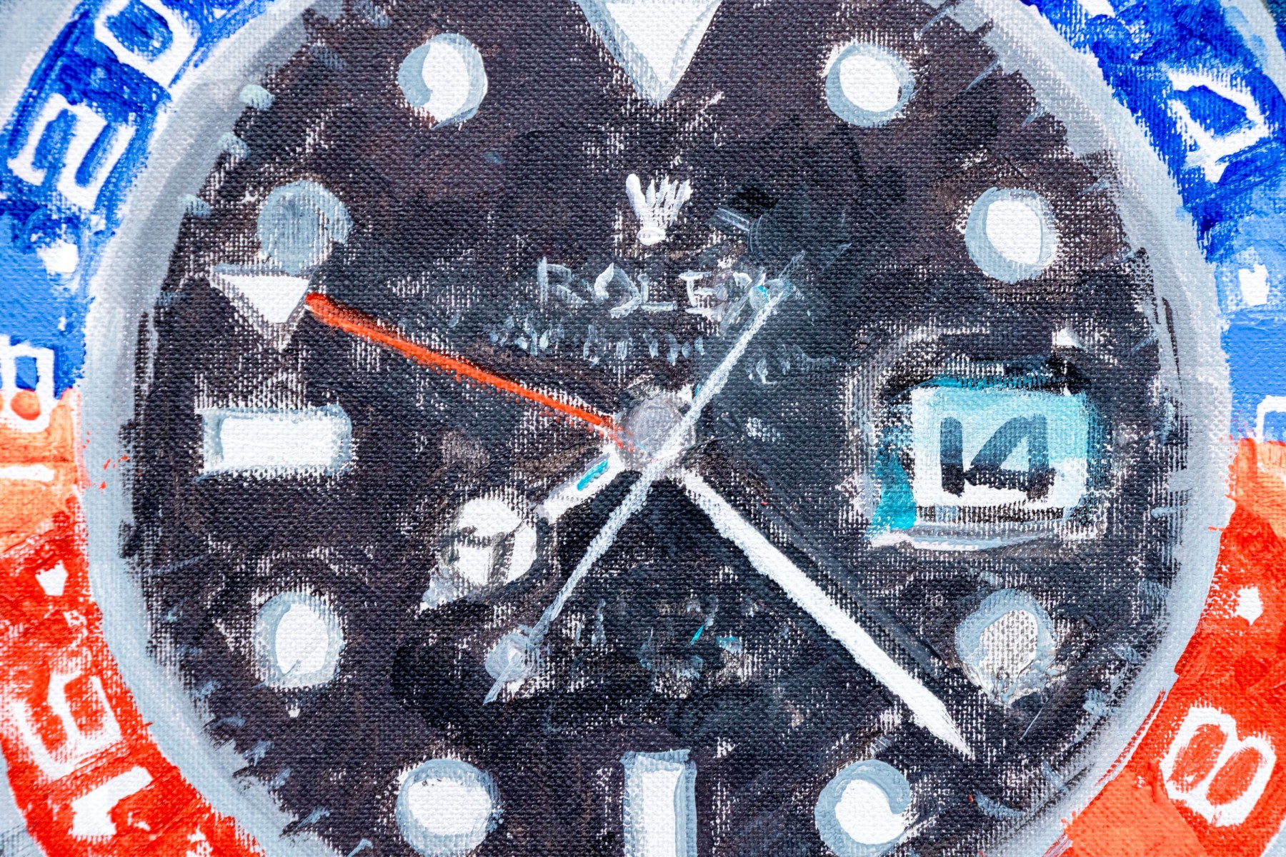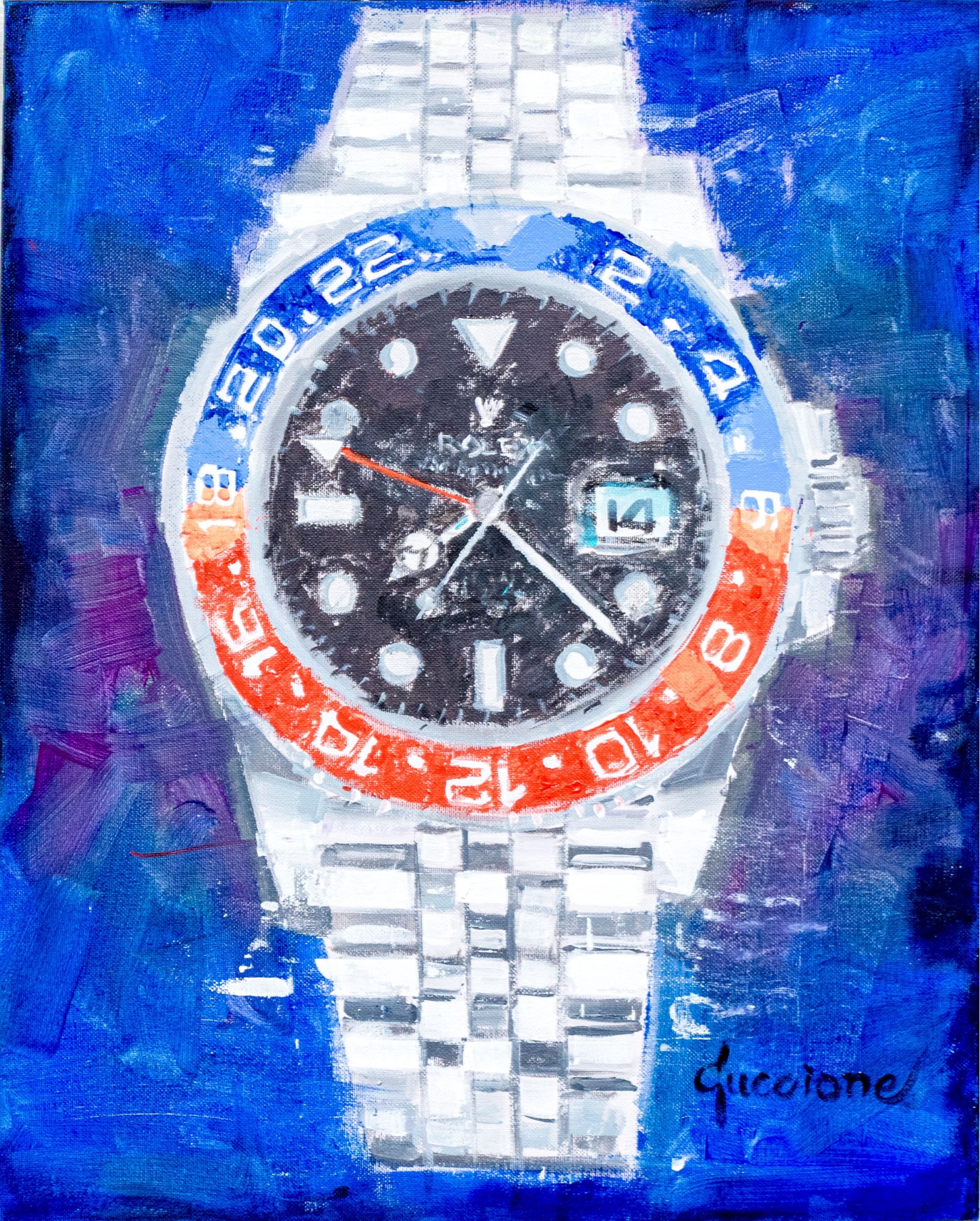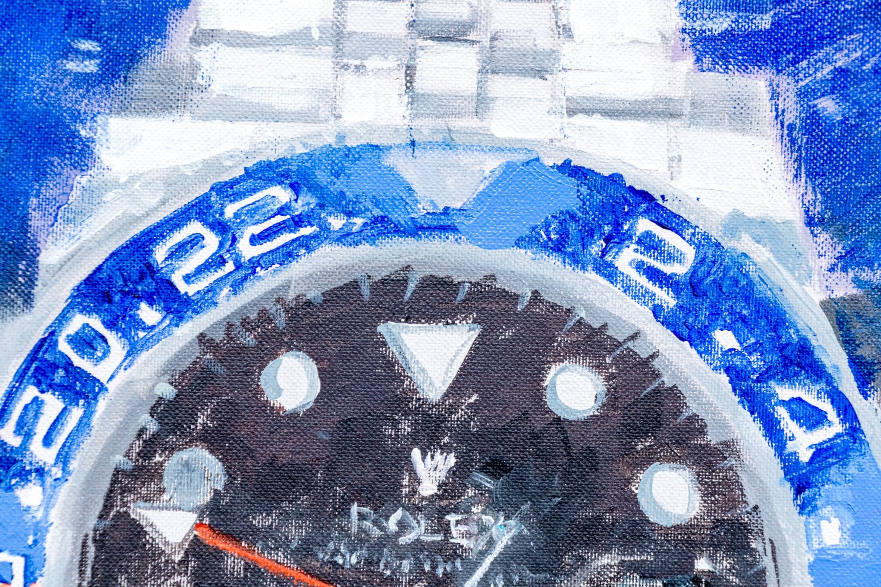 Signed lower right in black. Depicting a classic Rolex watch with red and blue bezel and chain link wrist band. Set against a blue and purple hued abstract ground.