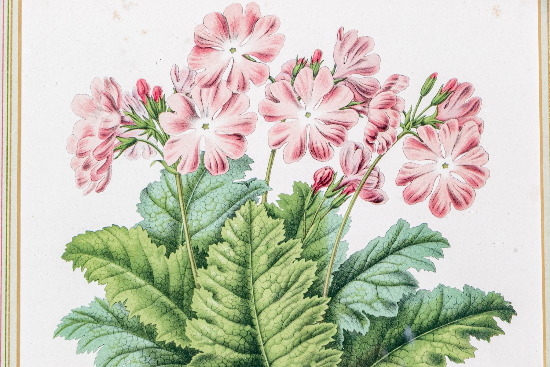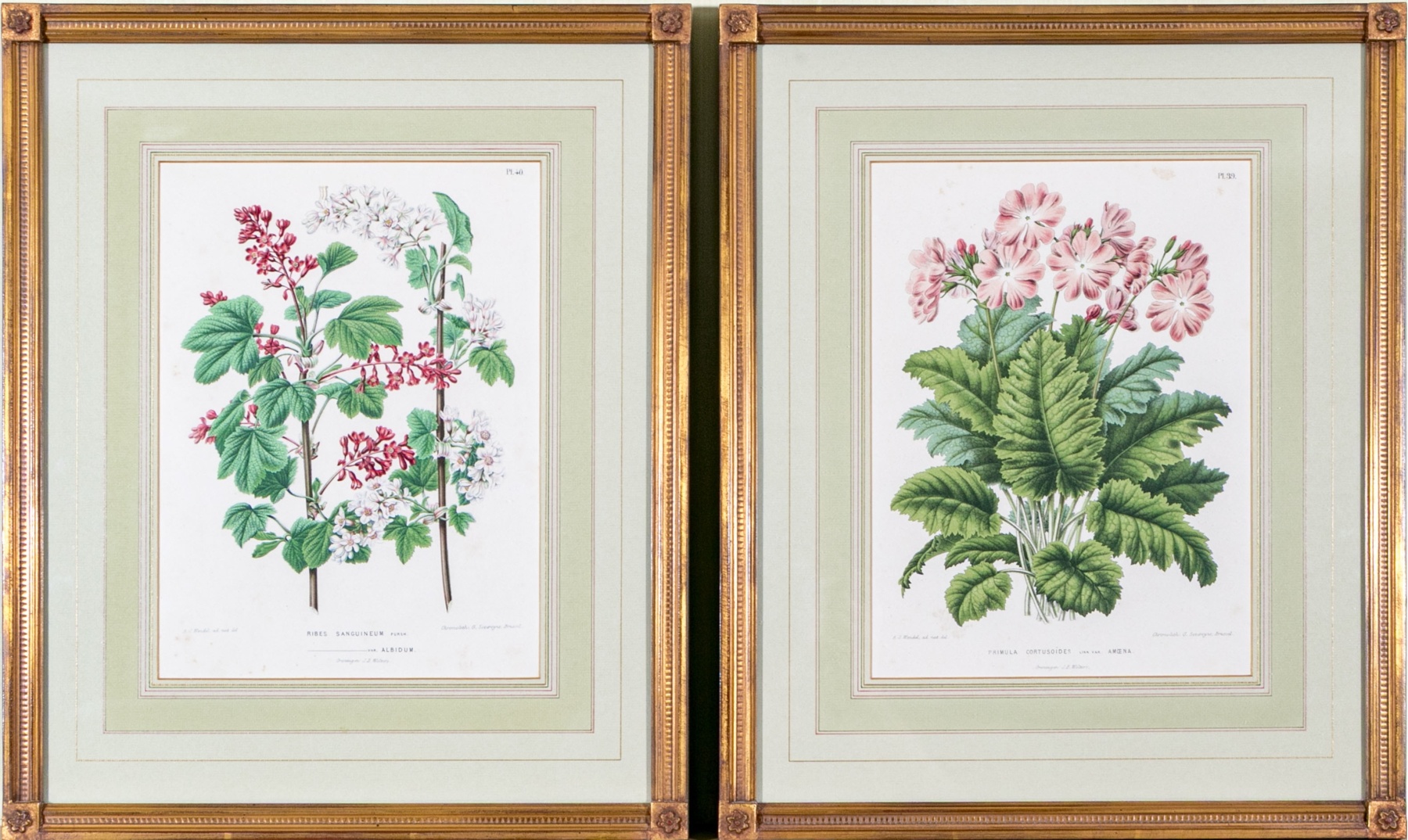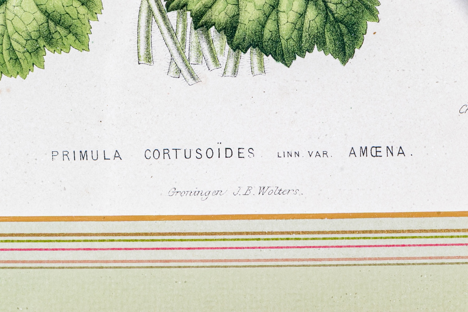 Guillaume Severeyns (Belgian, b. 1830) lithographs after the original artworks by Abraham Jacobus Wendel (Dutch, 1826-1915) "Rubes Sanguineum" depicting white and red flowers on tall, leafy stems and "Primula Cortusoides" depicting pink-red flowers with large green leaves.