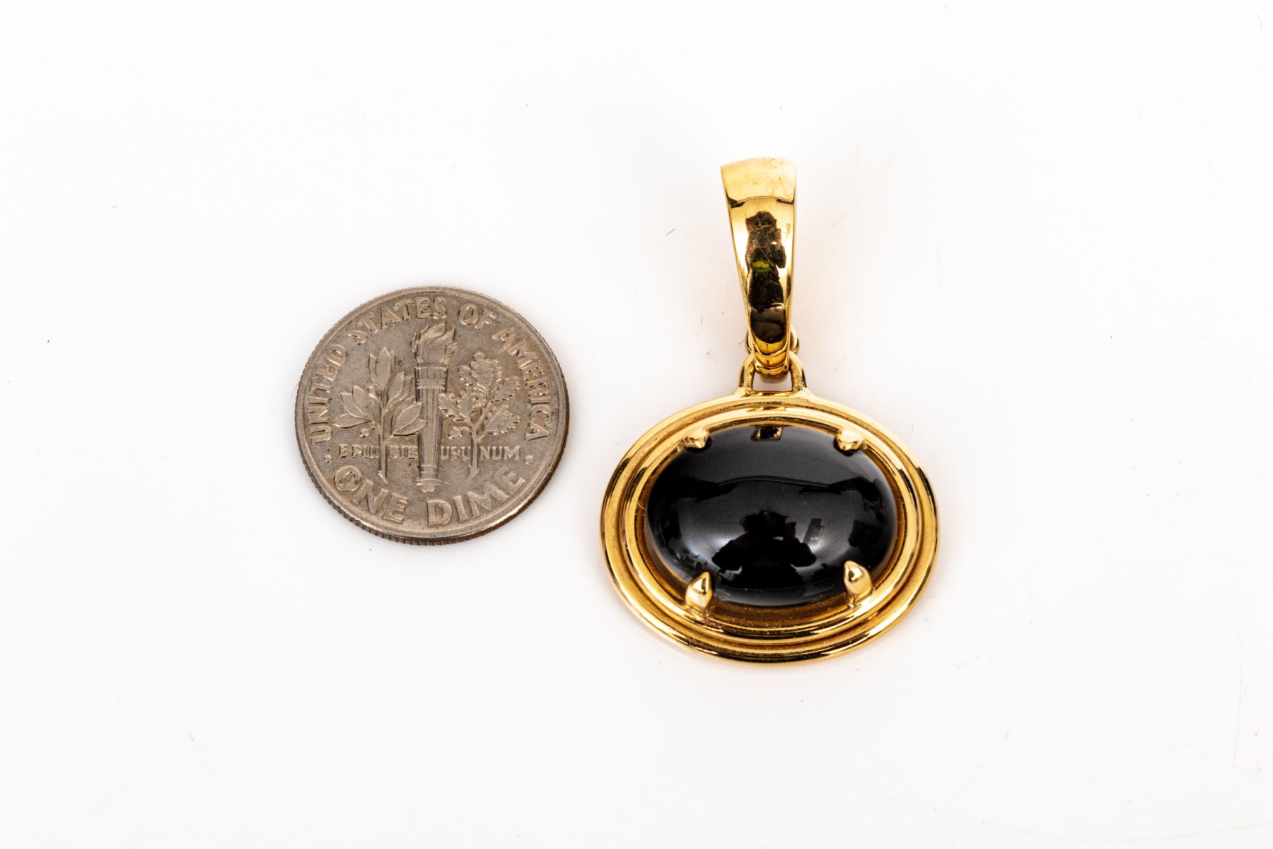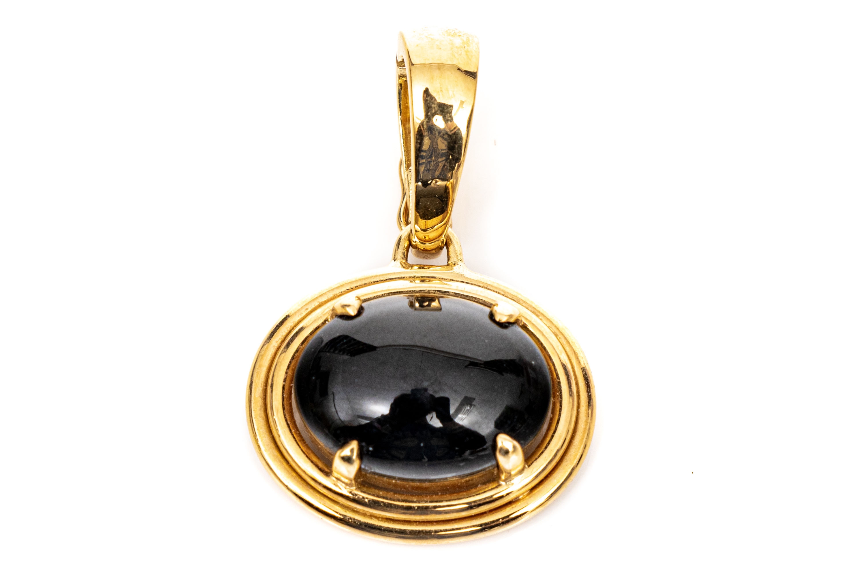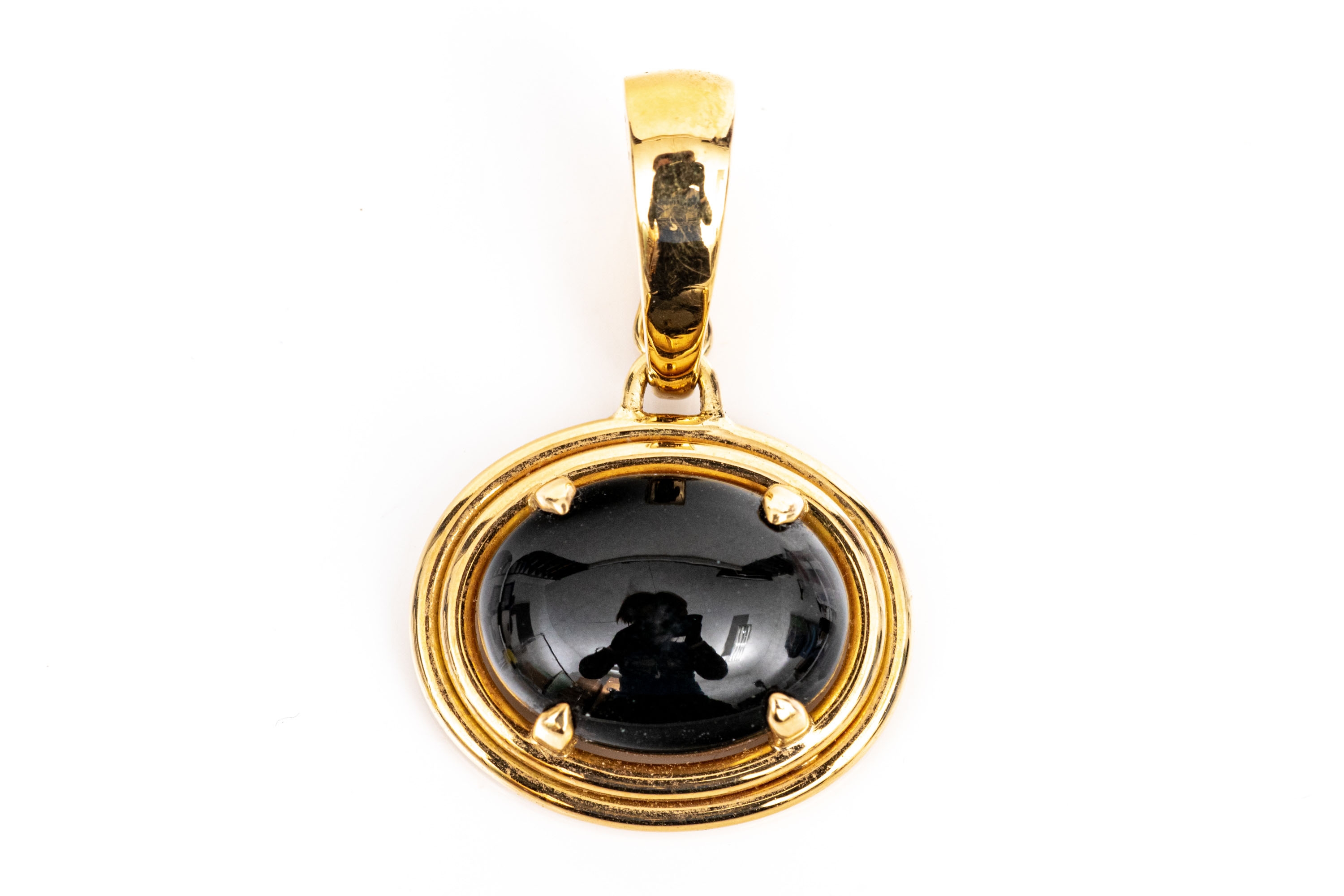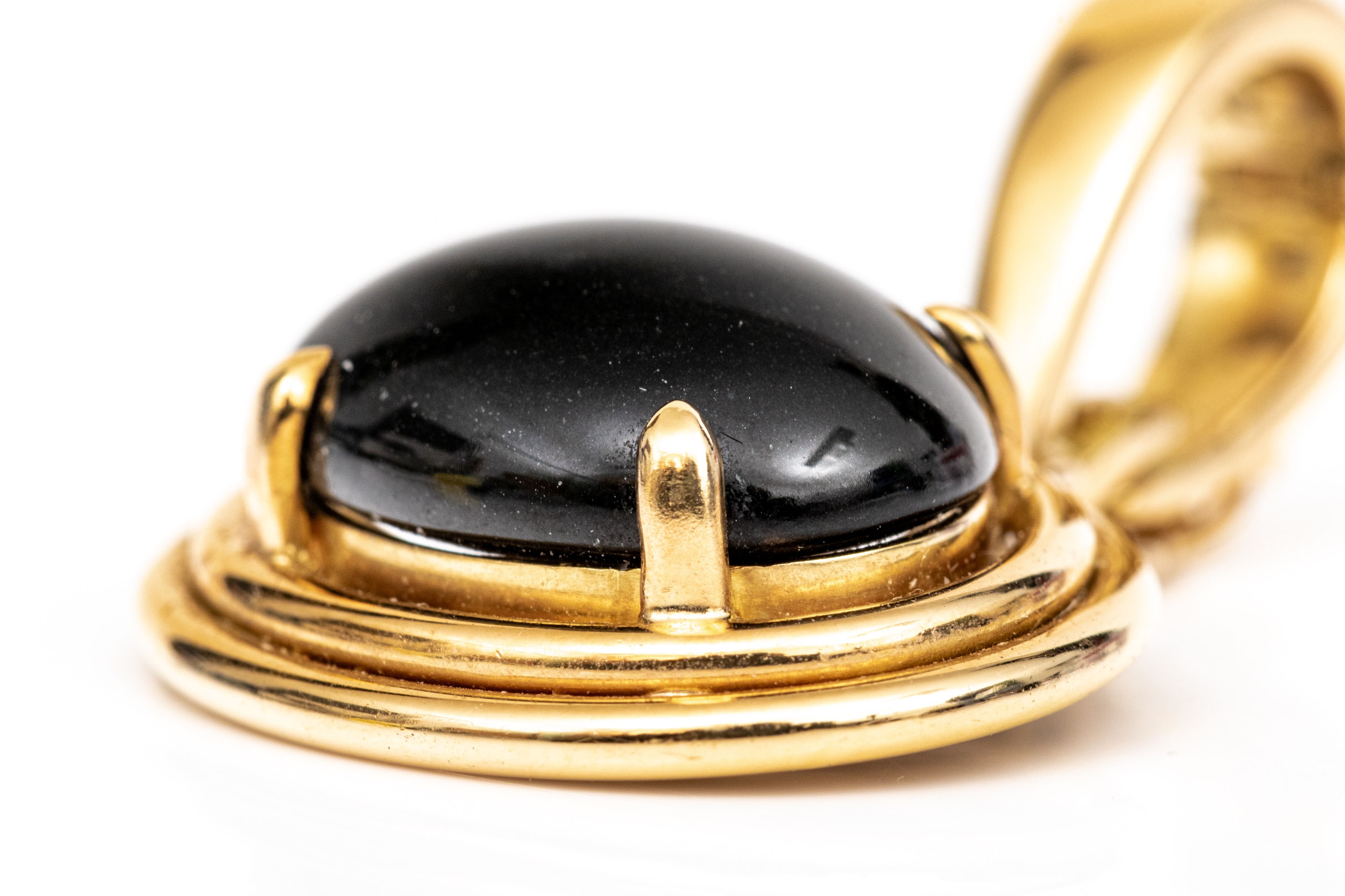 Gumps 18k yellow gold classic oval black onyx ribbed frame pendant/enhancer. This striking pendant features a cabachon black onyx, situated in a horizontal profile, prong set and decorated with a ribbed frame. The pendant is finished by an enhancer style bale.