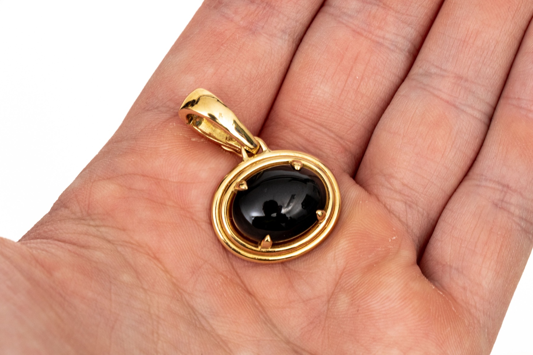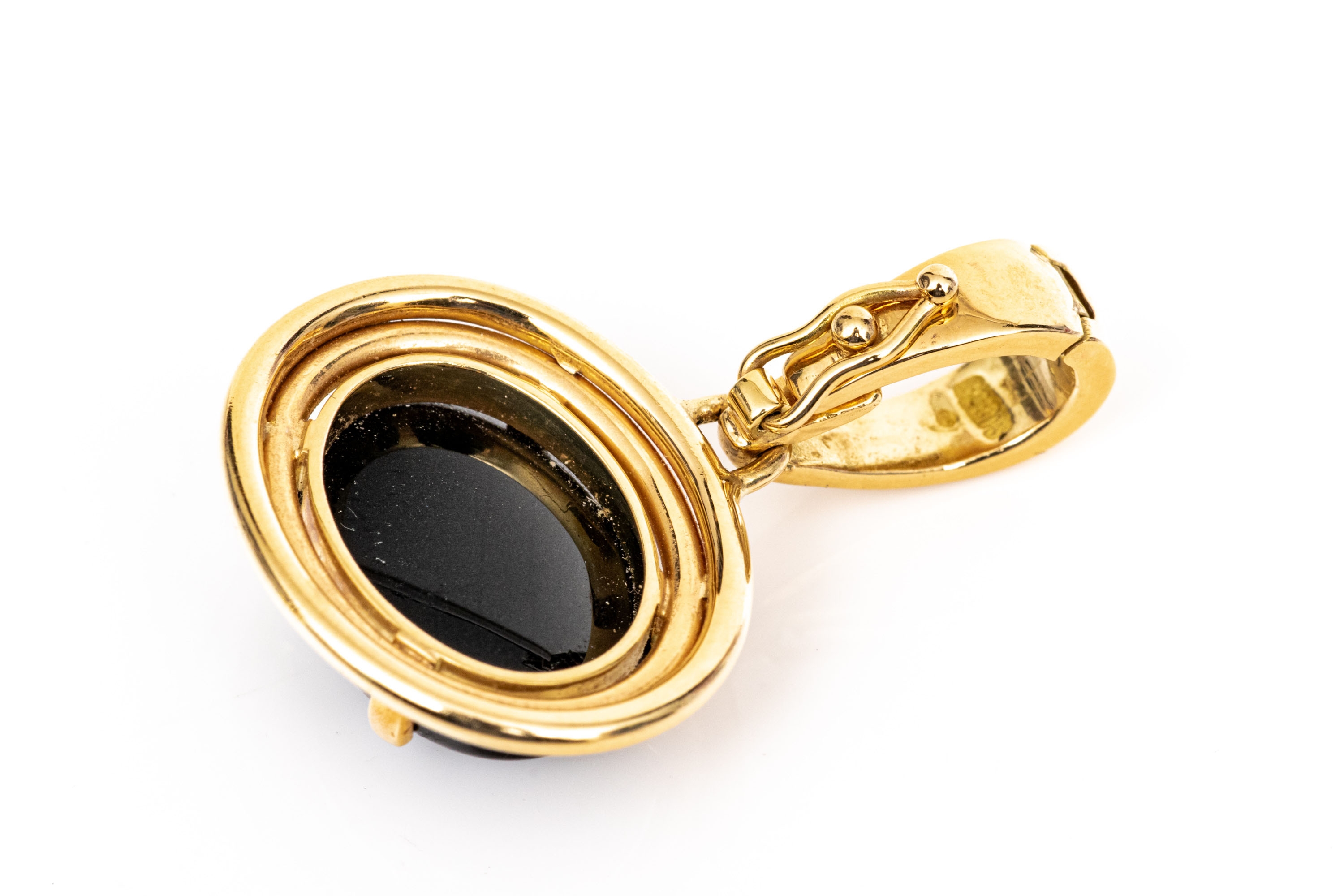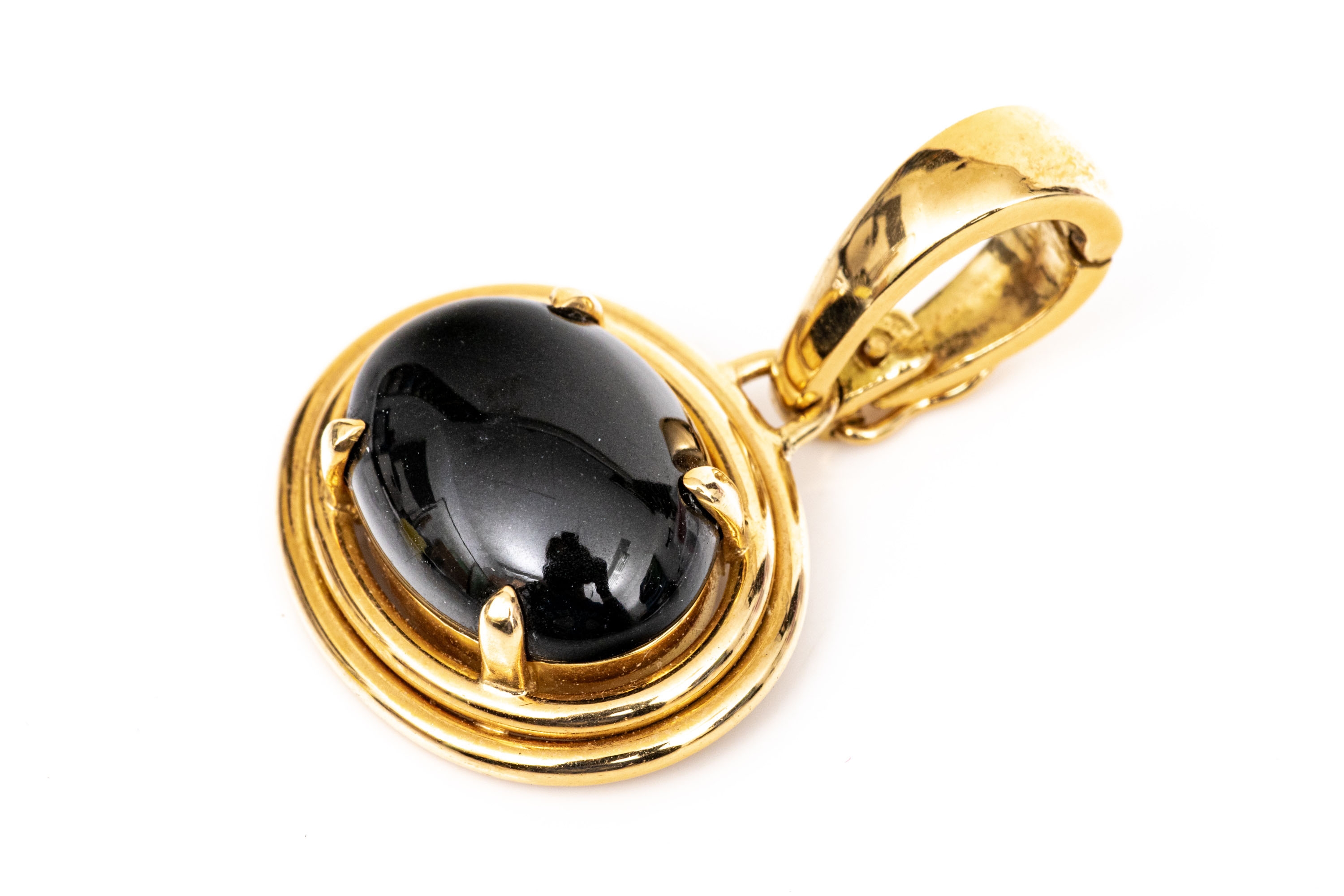 Gumps 18k yellow gold classic oval black onyx ribbed frame pendant/enhancer. This striking pendant features a cabachon black onyx, situated in a horizontal profile, prong set and decorated with a ribbed frame. The pendant is finished by an enhancer style bale.