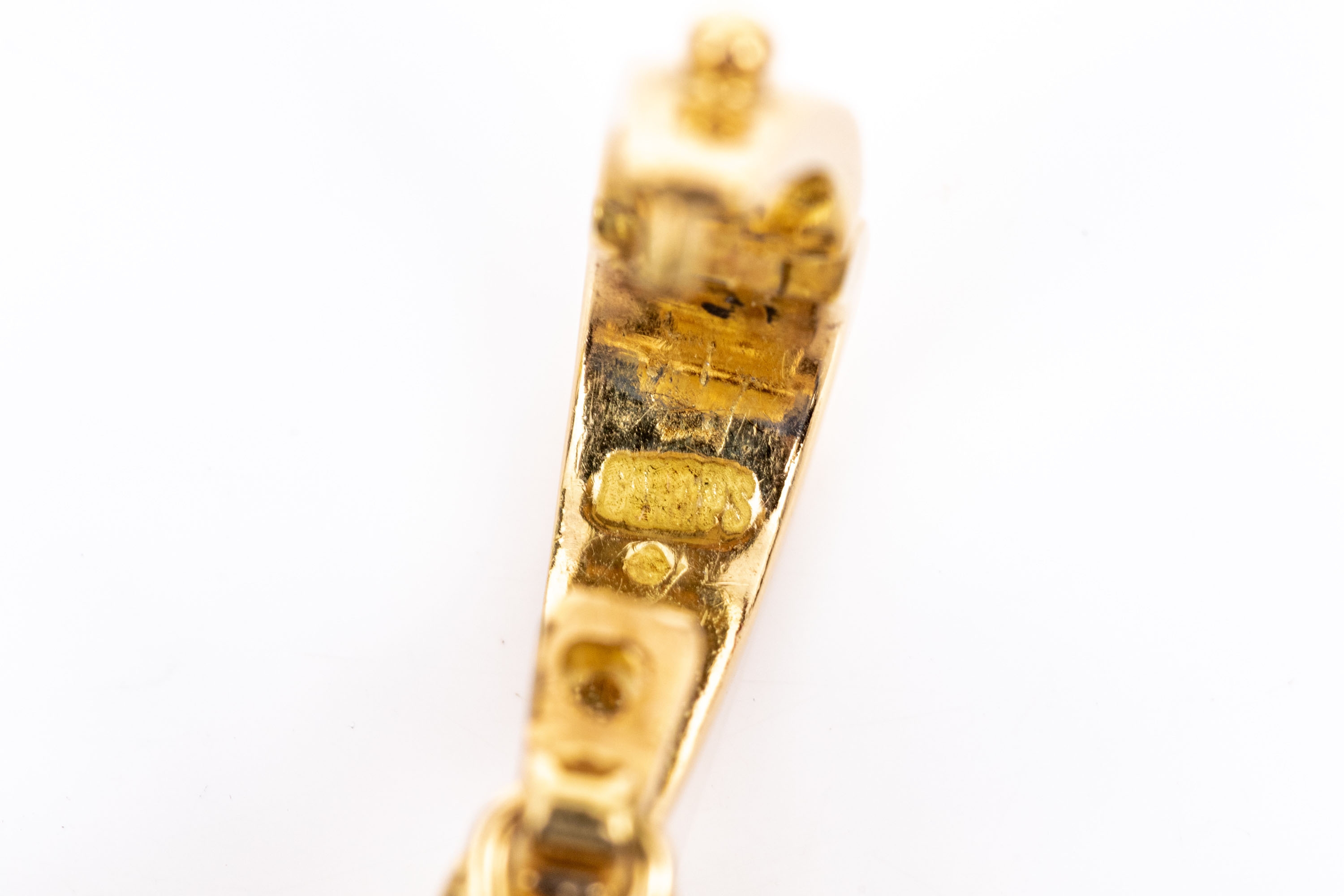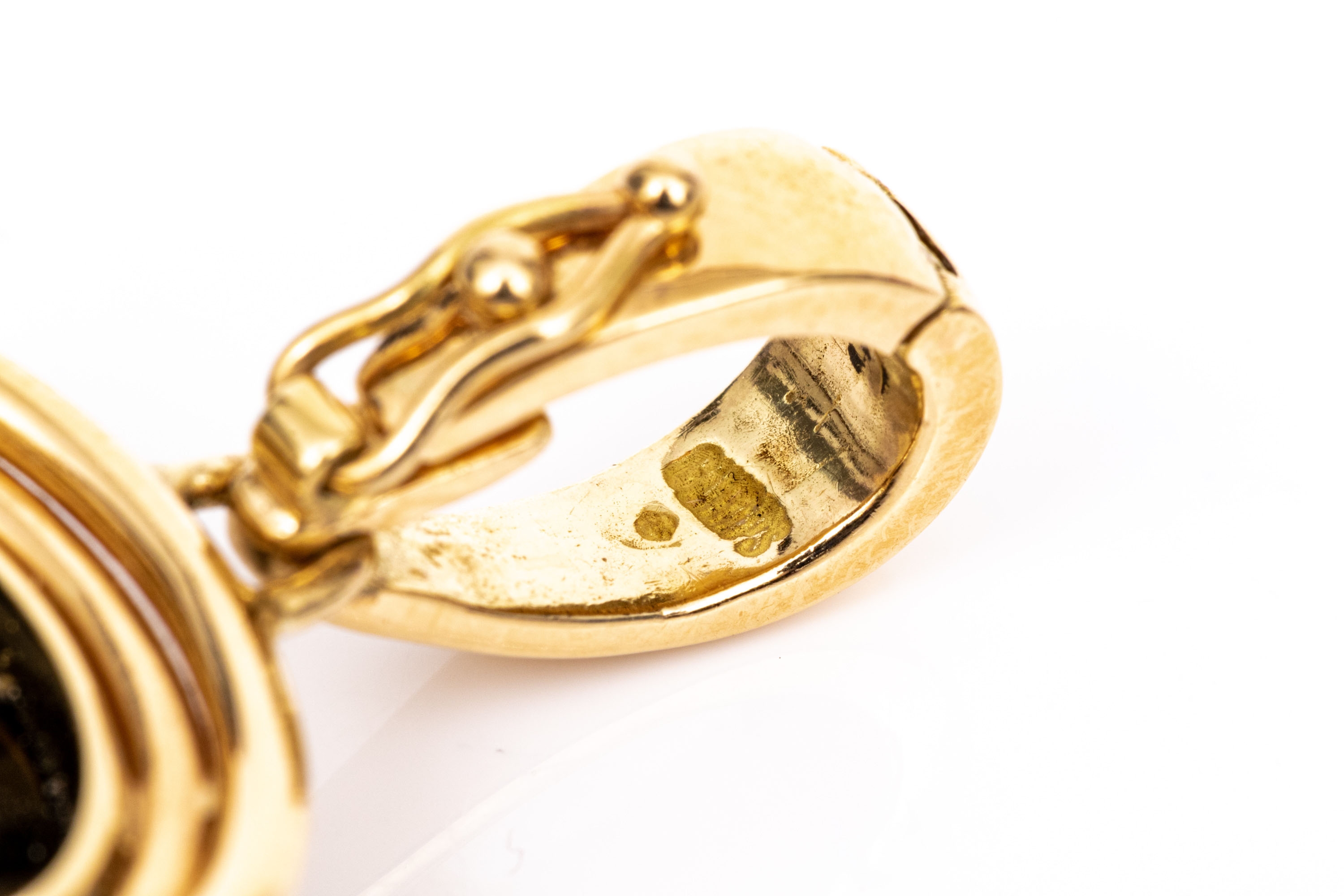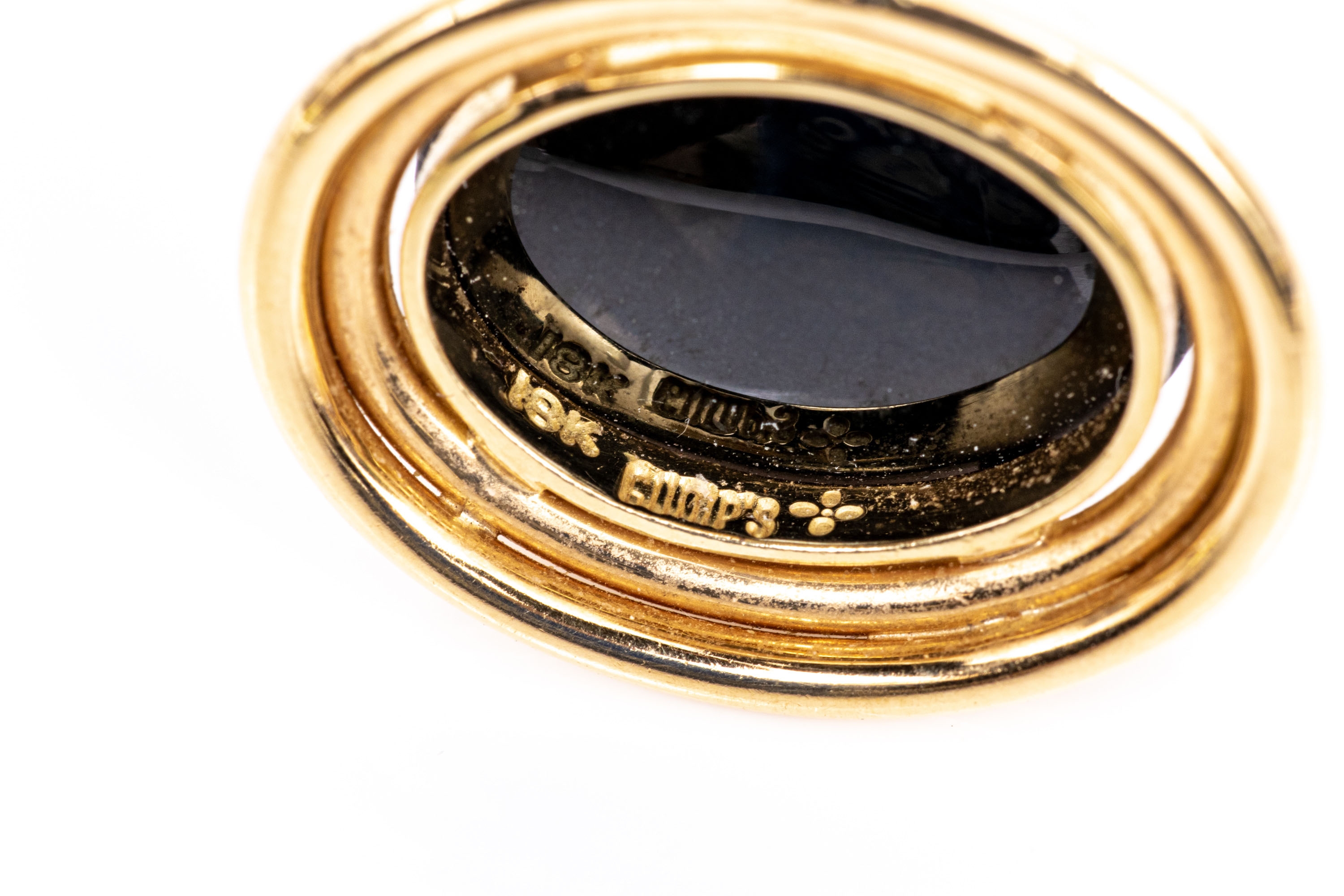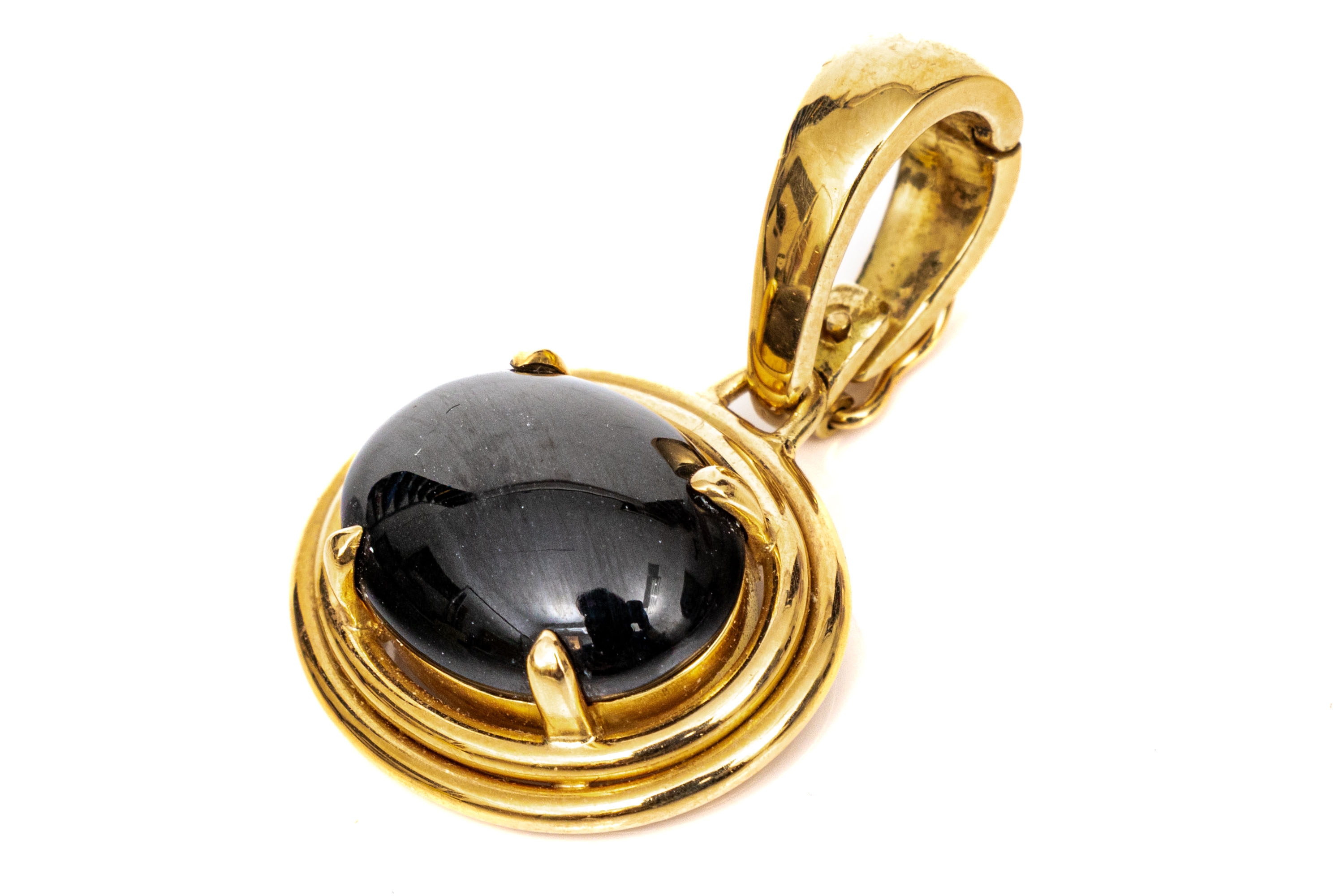 Gumps 18k yellow gold classic oval black onyx ribbed frame pendant/enhancer. This striking pendant features a cabachon black onyx, situated in a horizontal profile, prong set and decorated with a ribbed frame. The pendant is finished by an enhancer style bale.