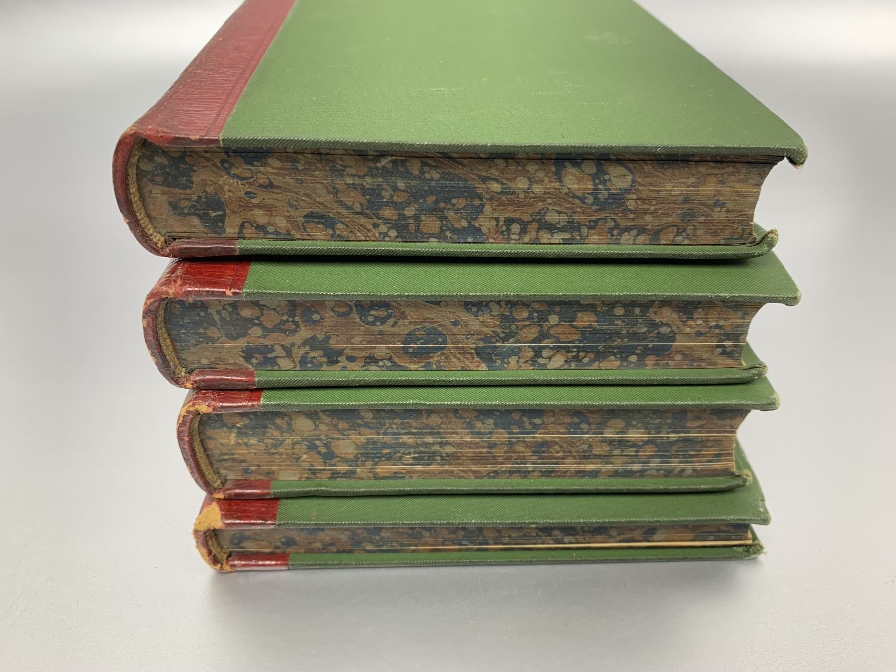 The books with green cloth, red leather spine with gilt print, marbleized borders on three sides, no illustrations. Published by S. Cowan & Co. at the Strathmore Printing Works, likely in the late 19th century, circa 1886.