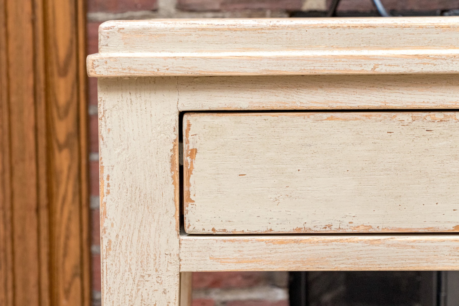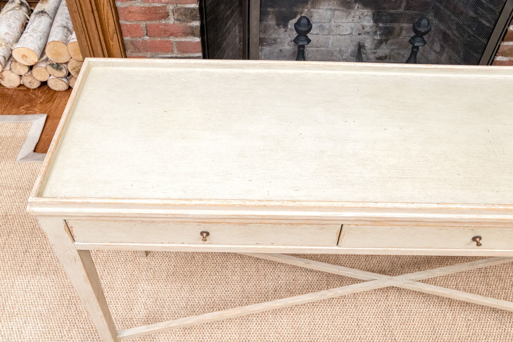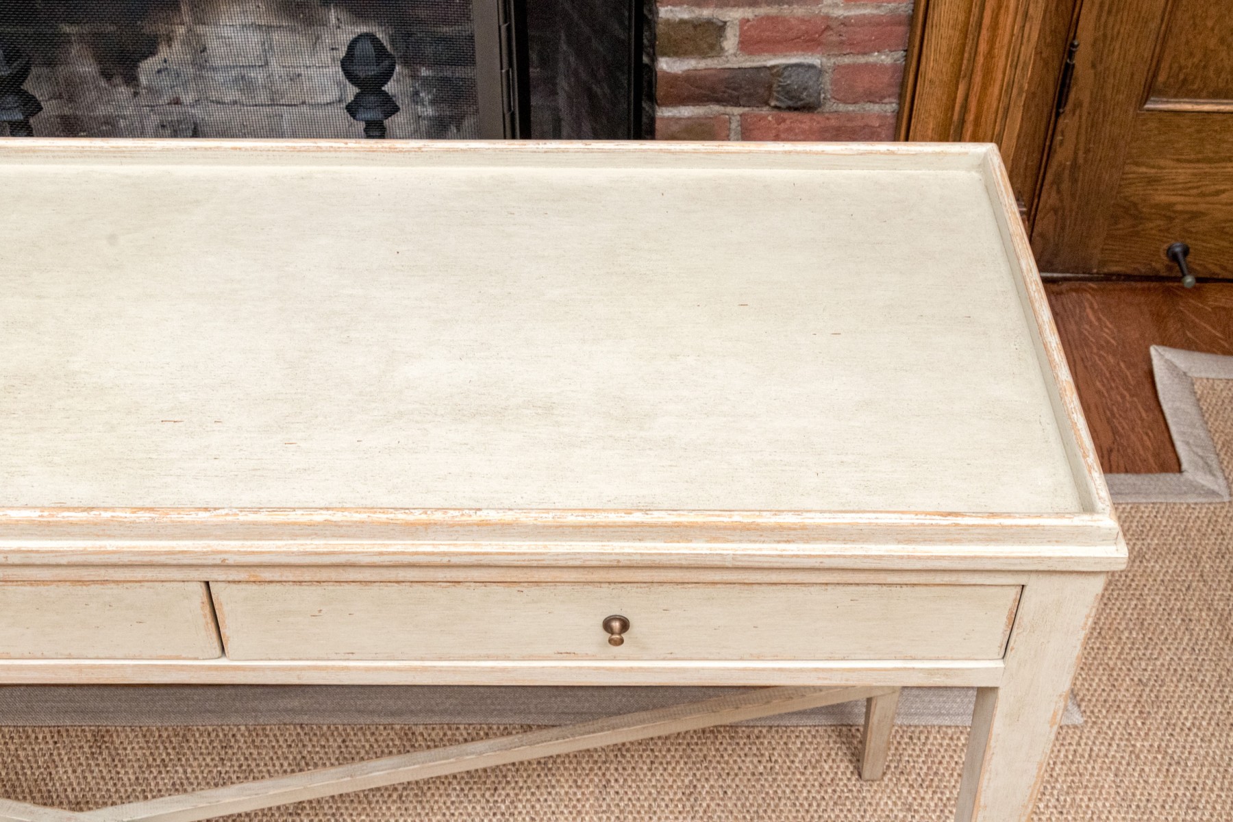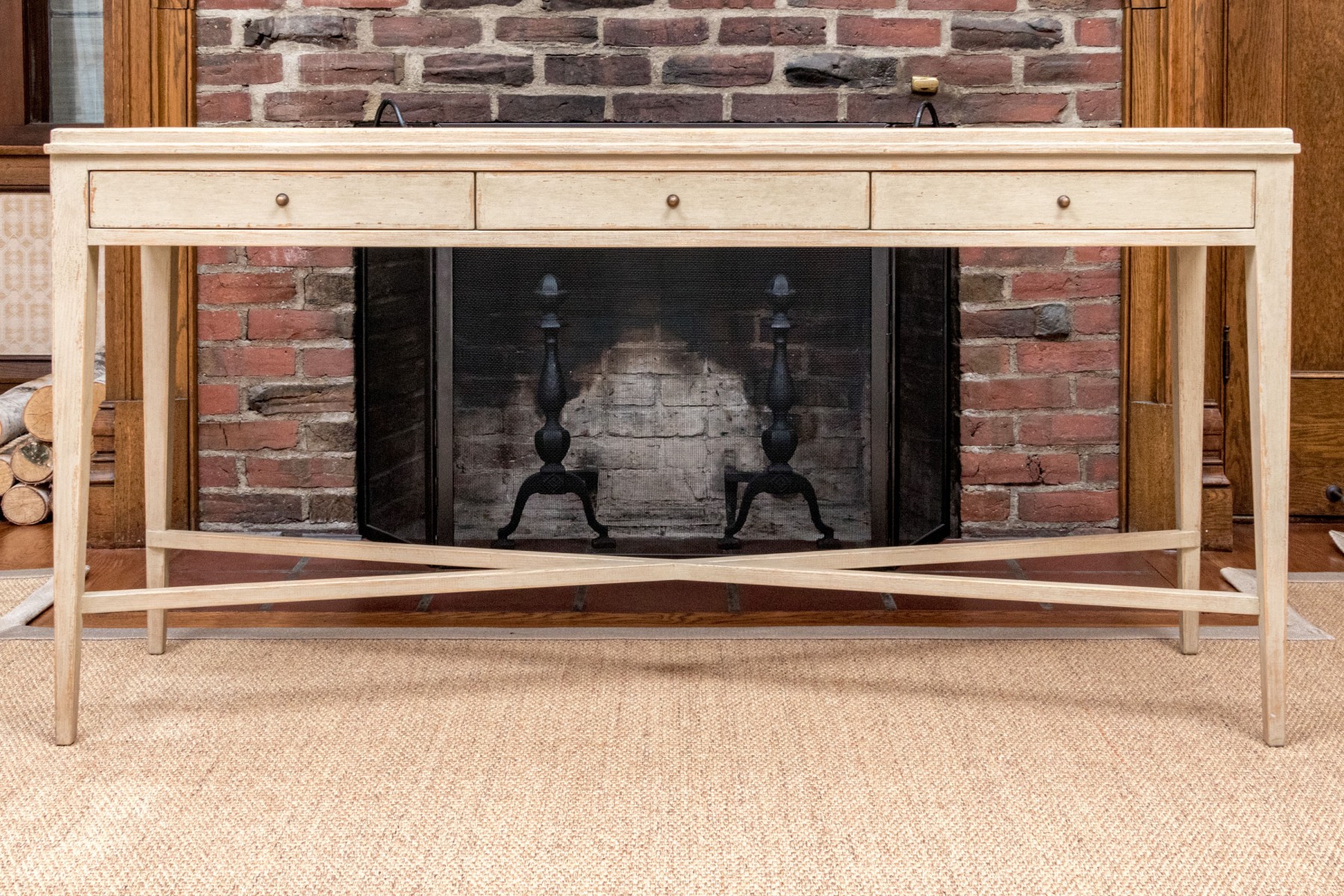 Three drawer with a lipped top. Tapered legs, cross stretcher base. Weathered white wash hand painted finish.