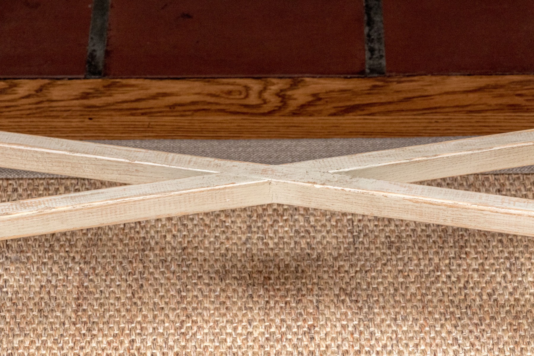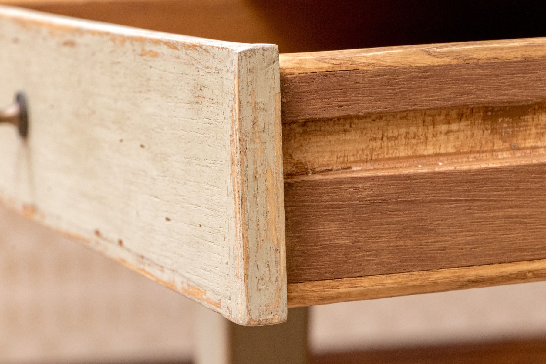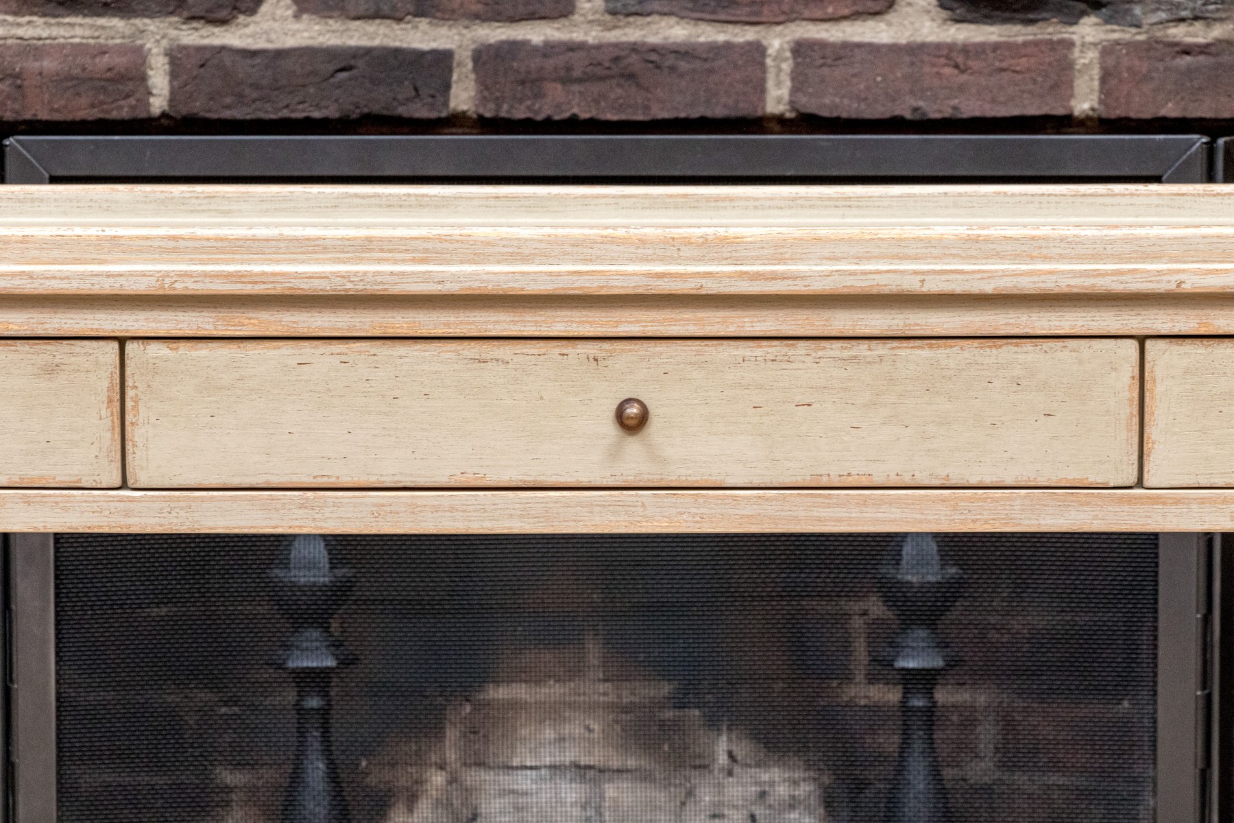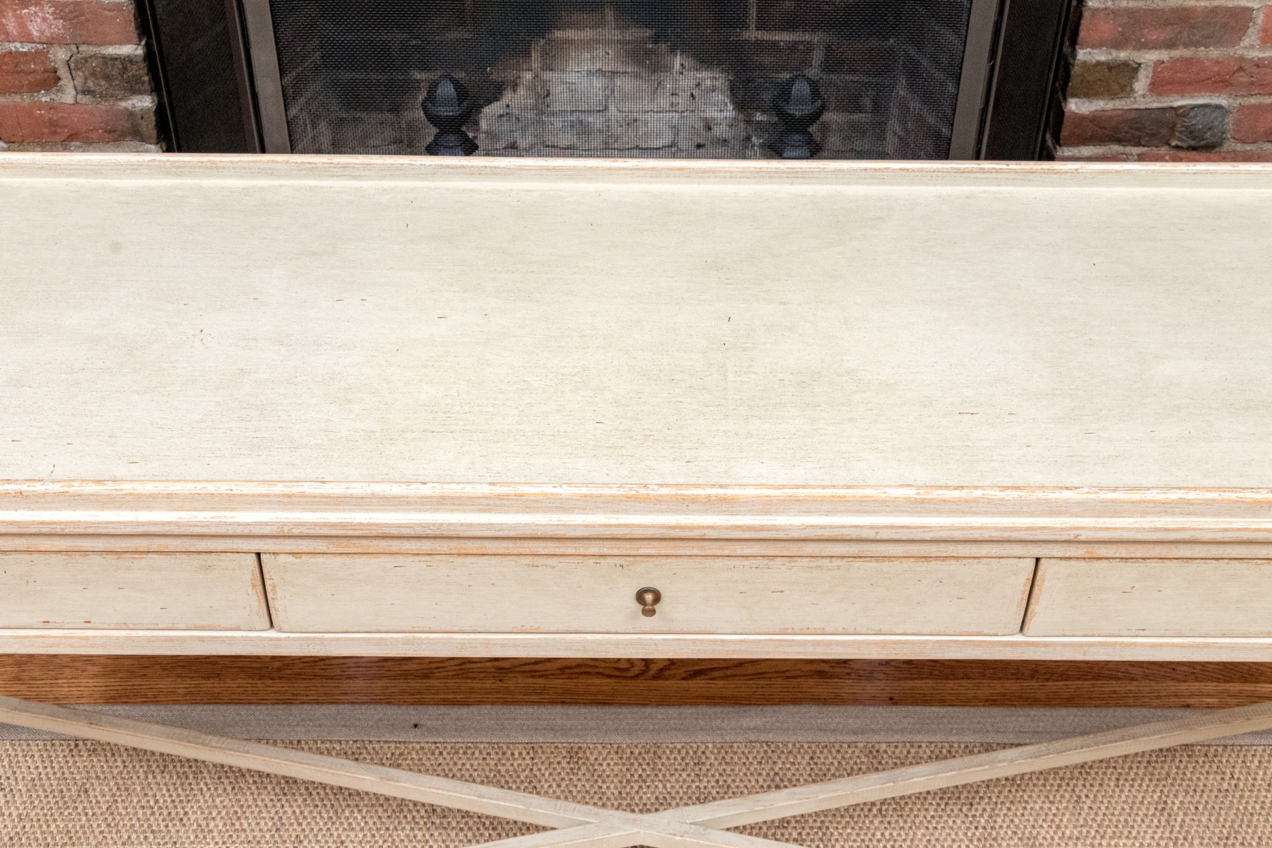 Three drawer with a lipped top. Tapered legs, cross stretcher base. Weathered white wash hand painted finish.