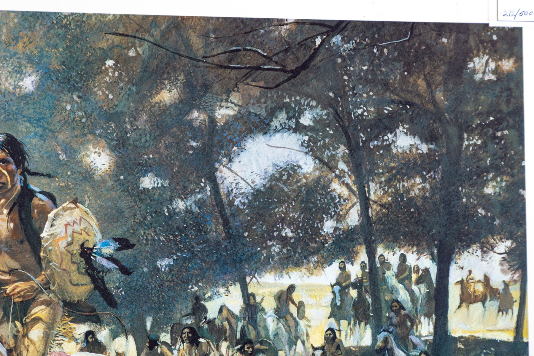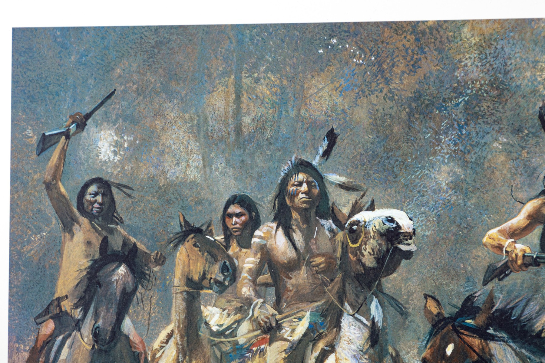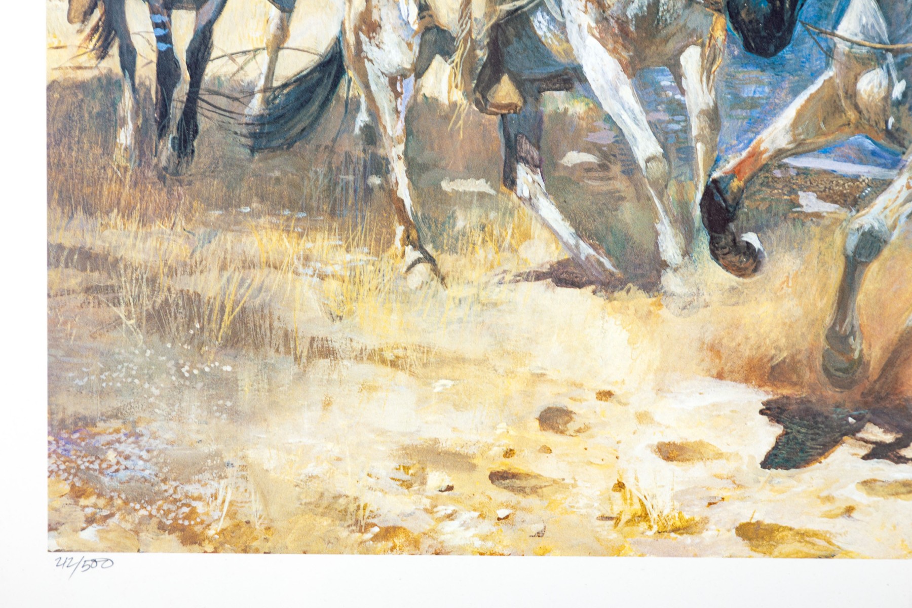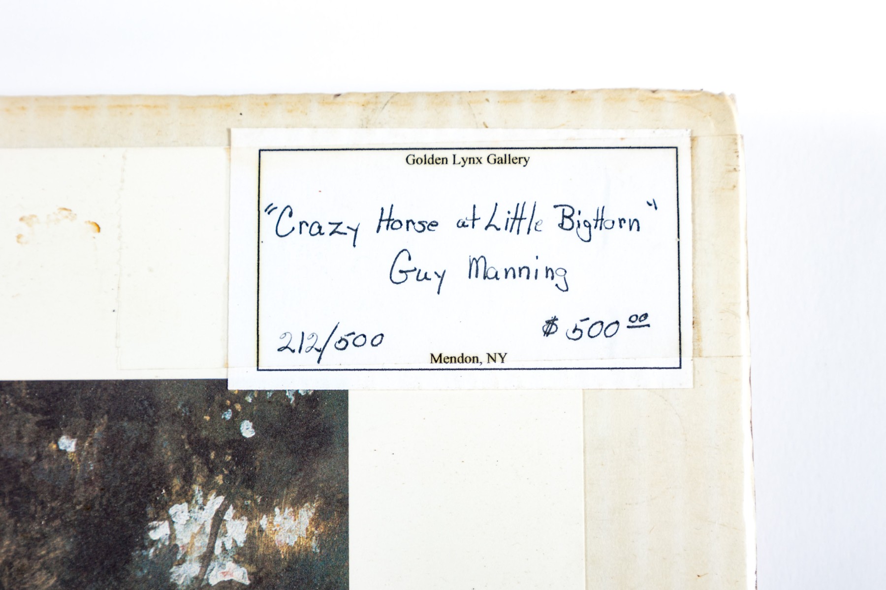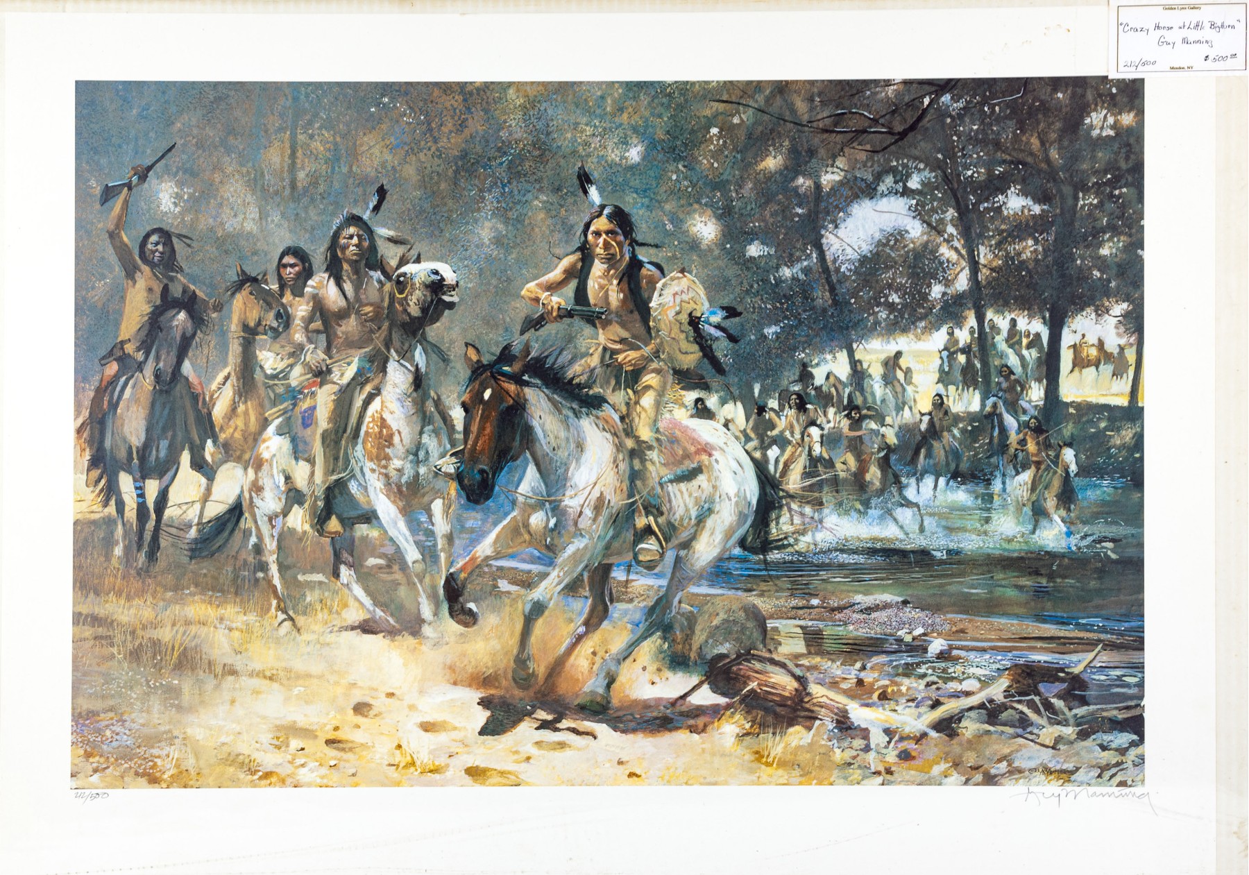 Guy Manning (American [CA}, 1936-2017) "Crazy Horse at Little Bighorn" lithograph depicting Native Americans on horseback riding to battle. Pencil signed lower right, numbered 212/500 lower left. Unframed, contained within a plastic film with a cardboard insert.