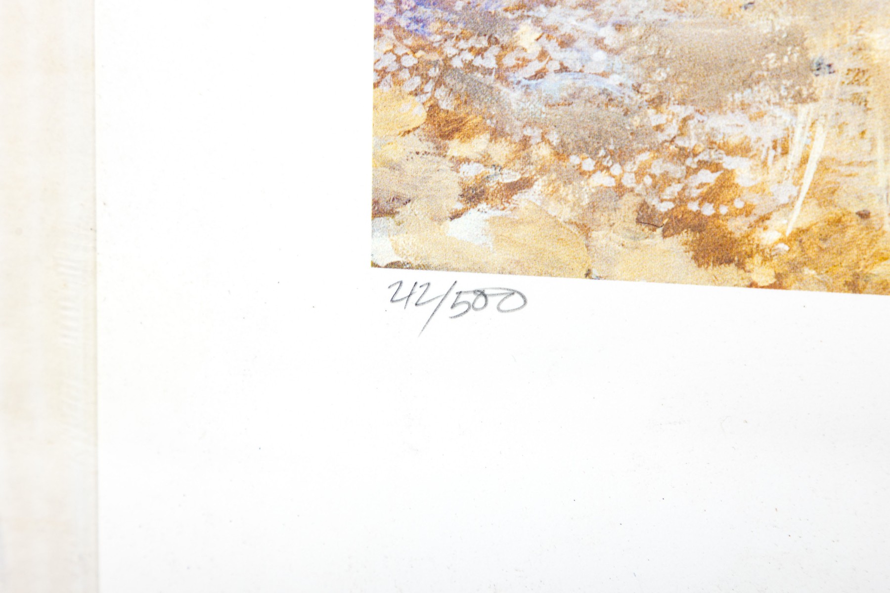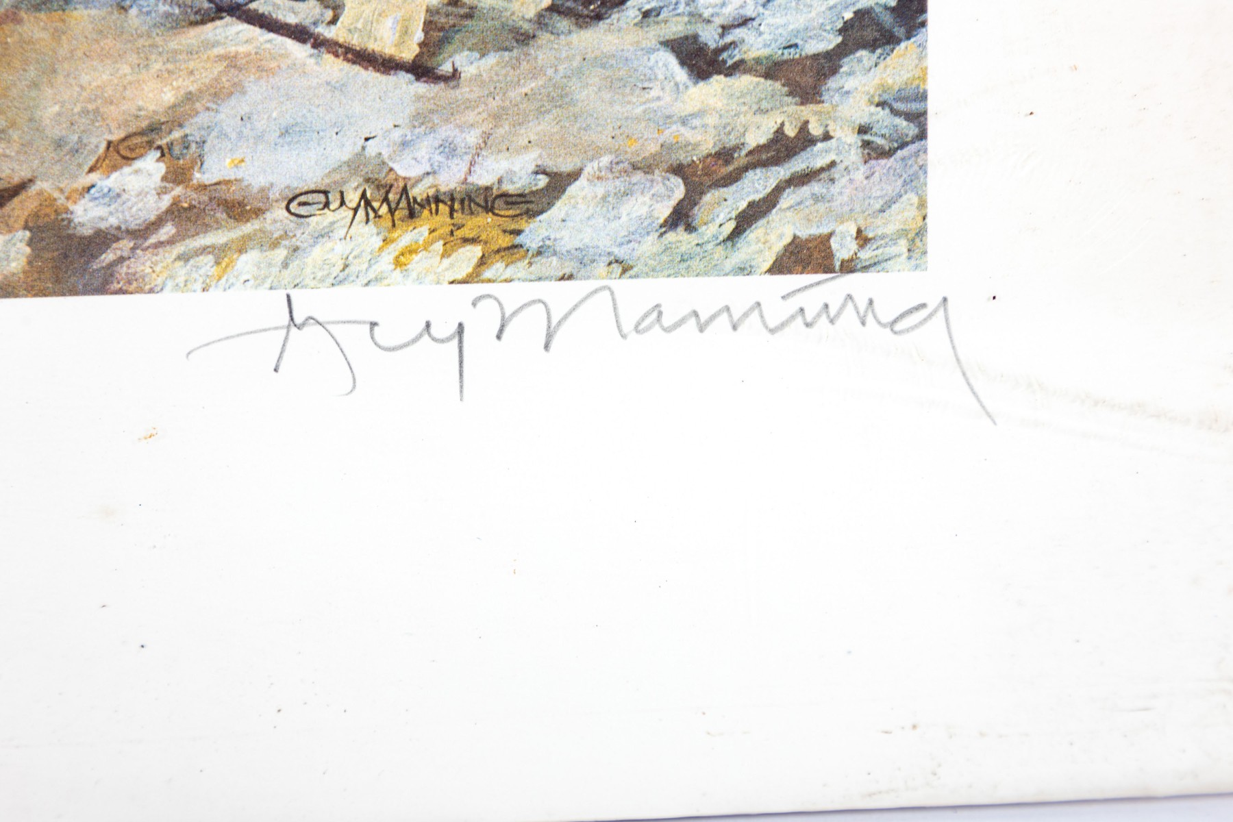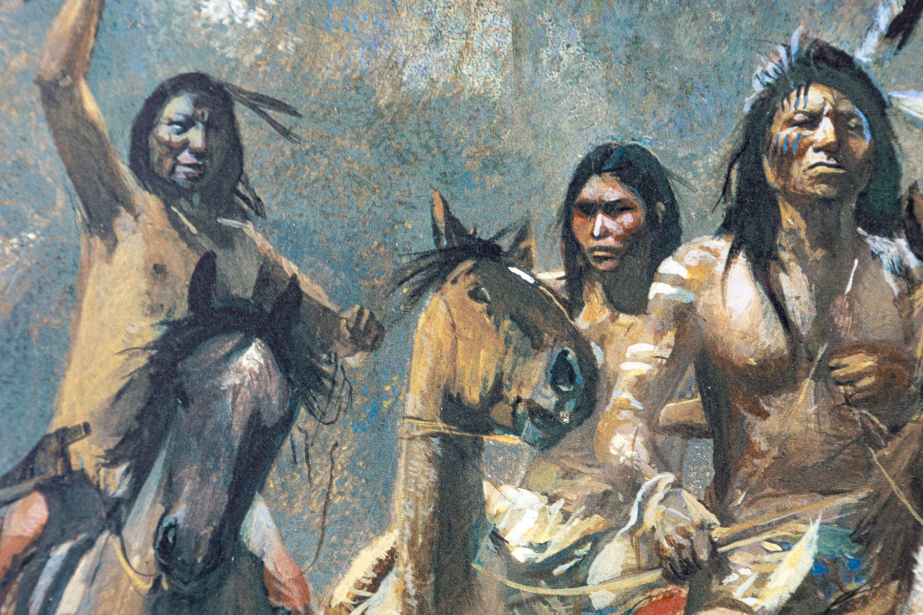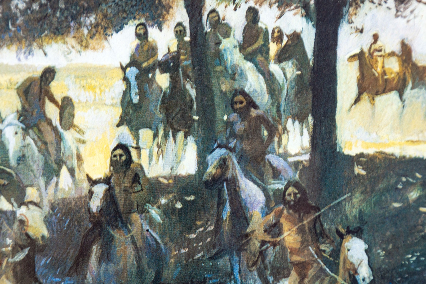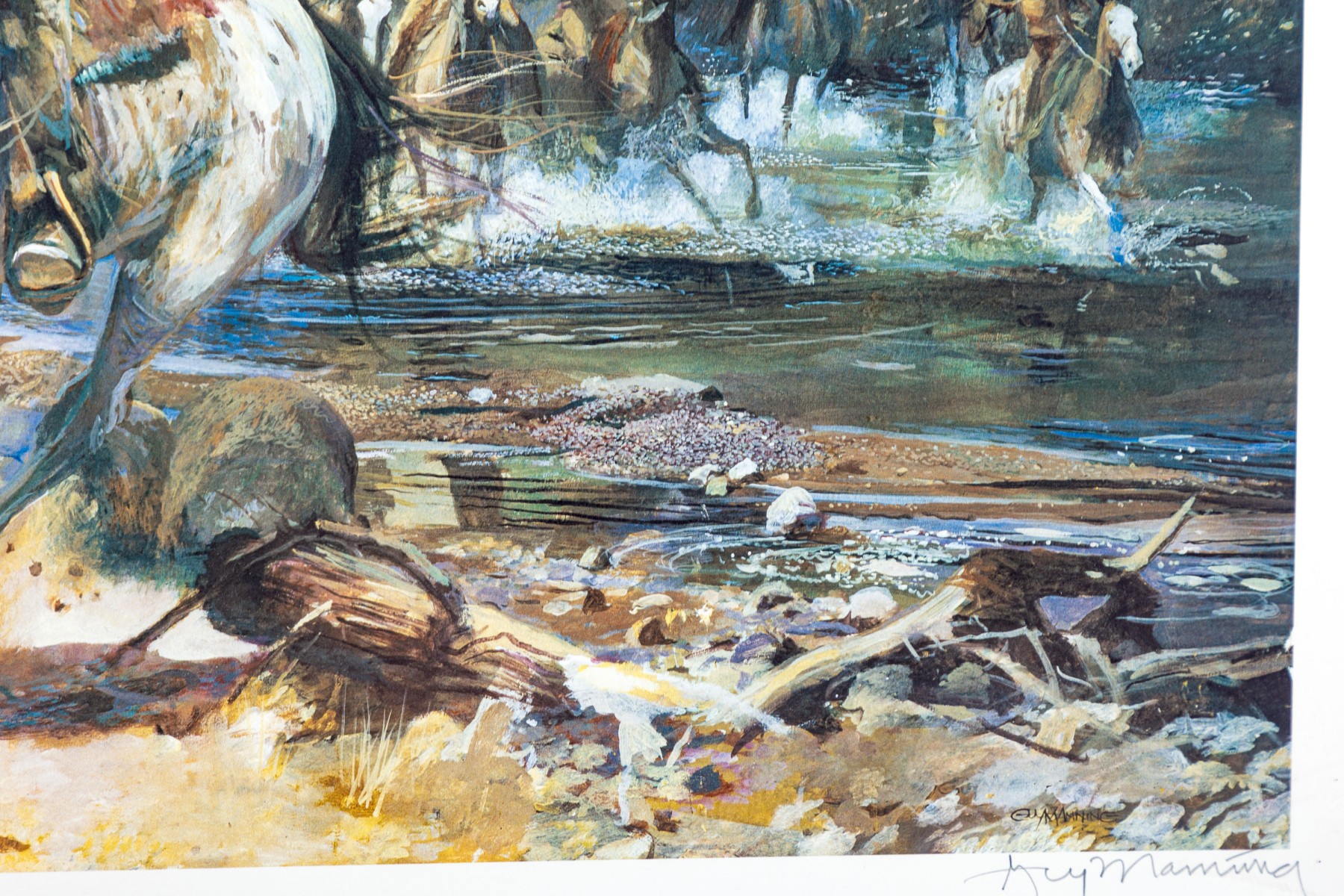 Guy Manning (American [CA}, 1936-2017) "Crazy Horse at Little Bighorn" lithograph depicting Native Americans on horseback riding to battle. Pencil signed lower right, numbered 212/500 lower left. Unframed, contained within a plastic film with a cardboard insert.