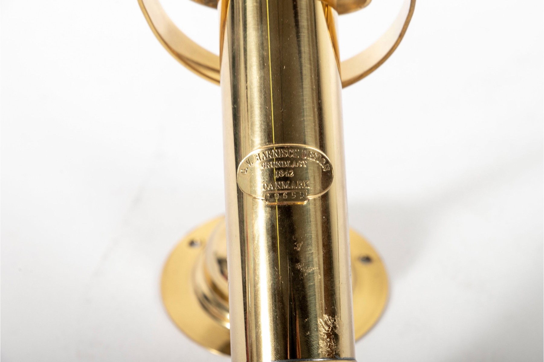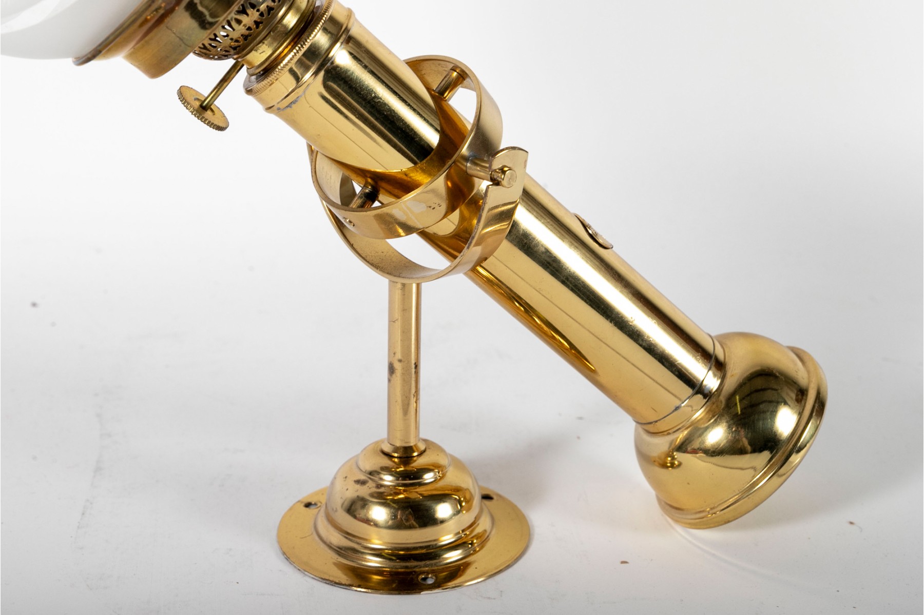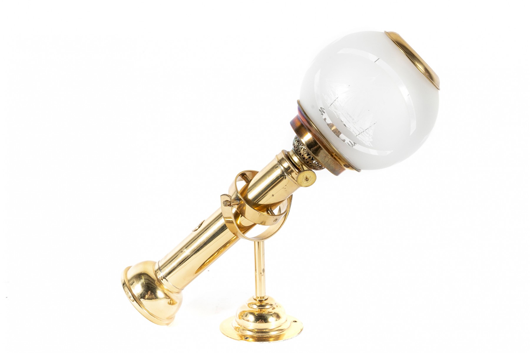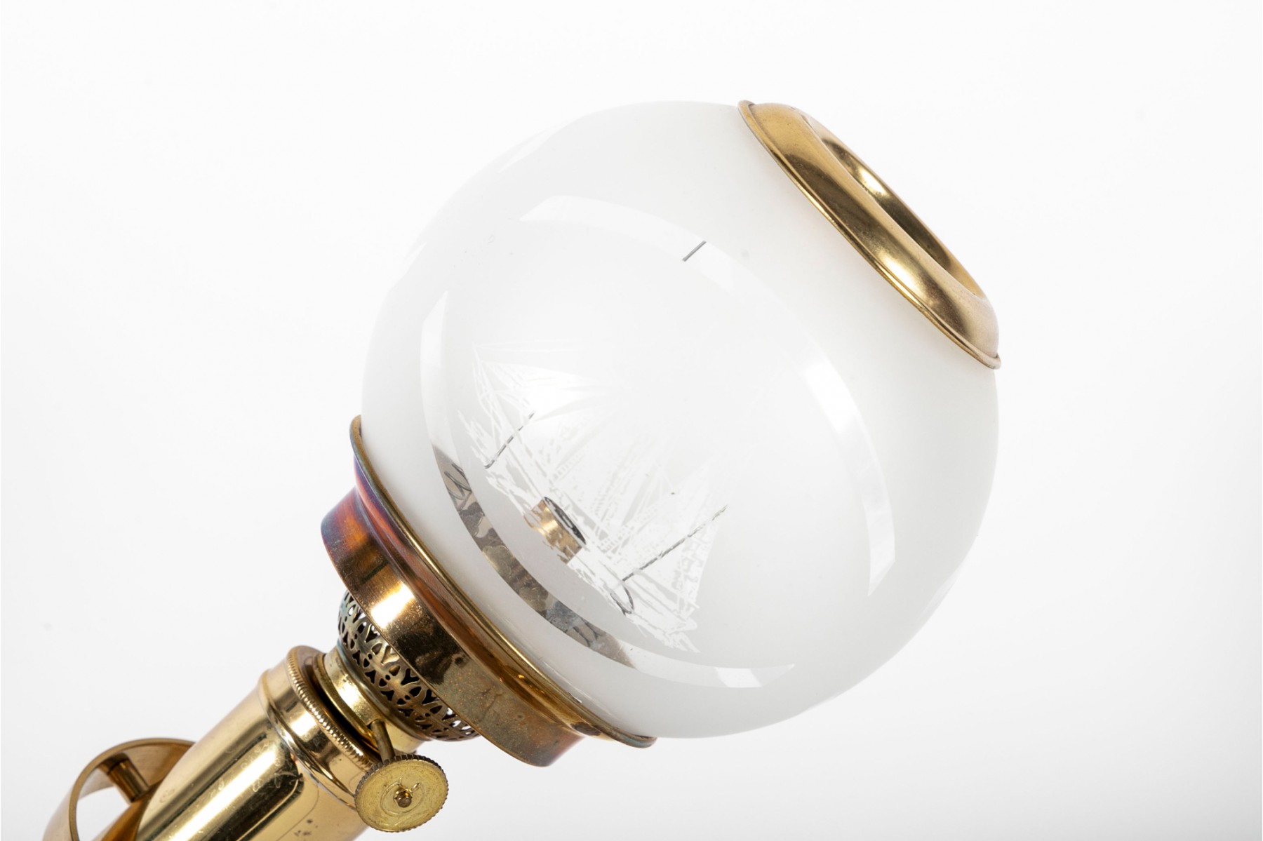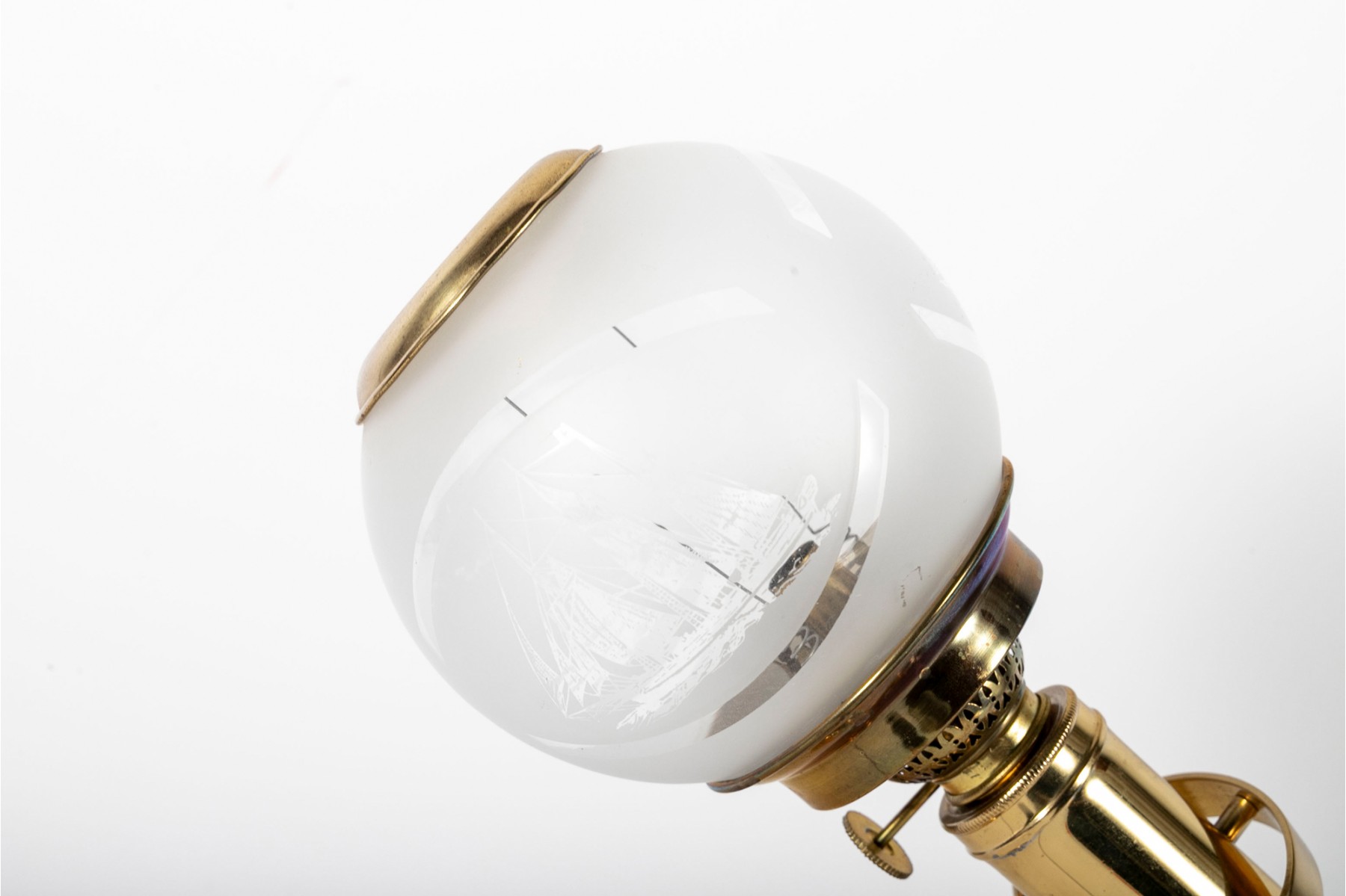GV Harnisch Design Grundlagt Danish oil/kerosene wall sconce with nautical flare, displaying a simple brass column body with a frosted glass globe depicting a large ship. The sconce is supported by a removable wall-mounting plaque. Manufacturer's plaque affixed to the front of the column; also marked on the underside of the column and on the interior of the wall-mounting plaque.