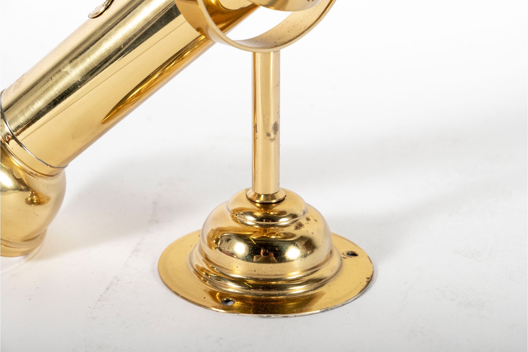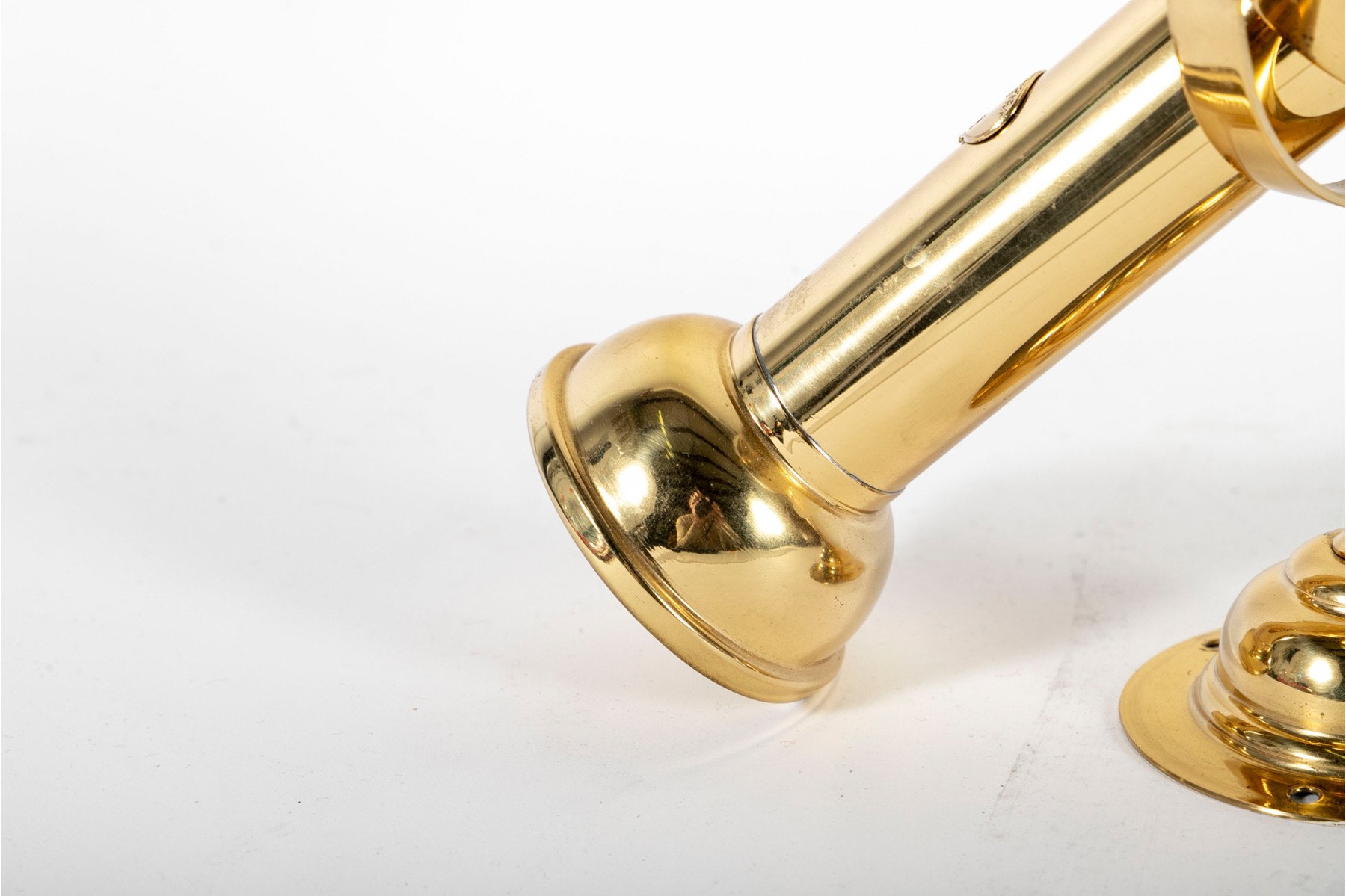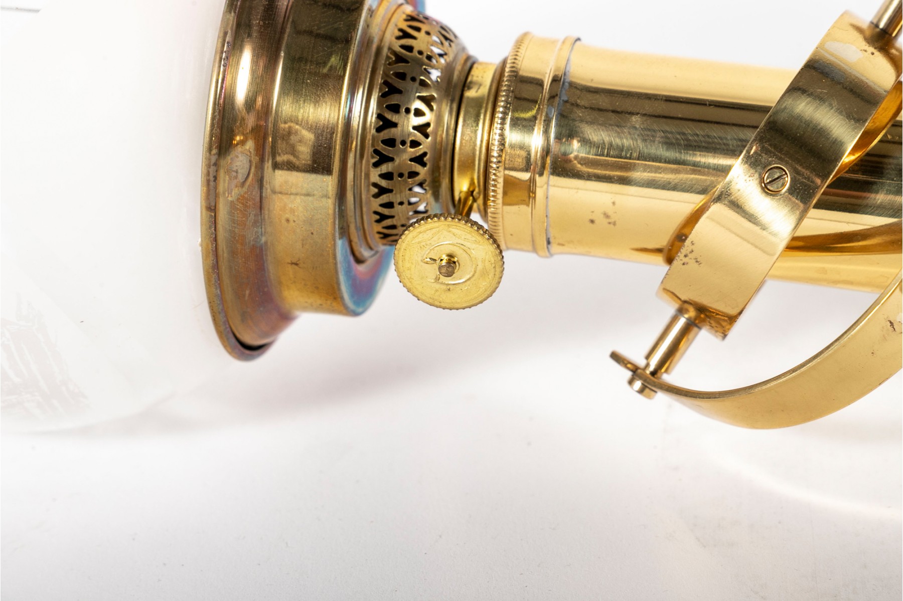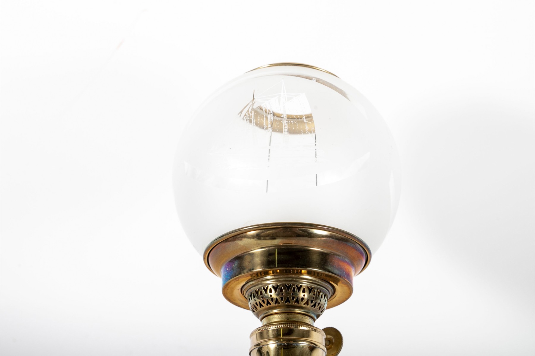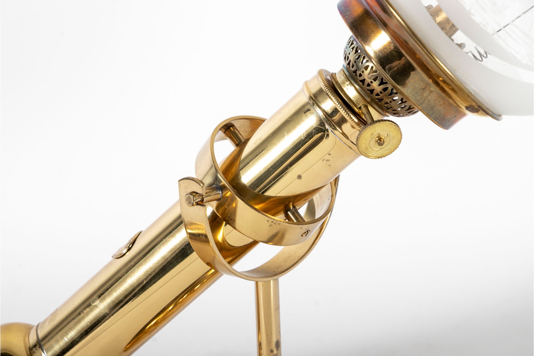 GV Harnisch Design Grundlagt Danish oil/kerosene wall sconce with nautical flare, displaying a simple brass column body with a frosted glass globe depicting a large ship. The sconce is supported by a removable wall-mounting plaque. Manufacturer's plaque affixed to the front of the column; also marked on the underside of the column and on the interior of the wall-mounting plaque.