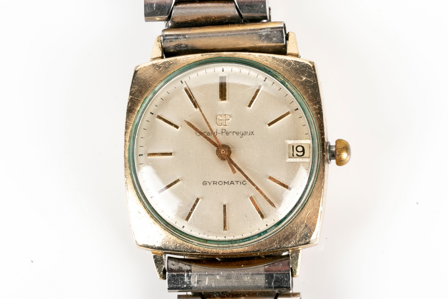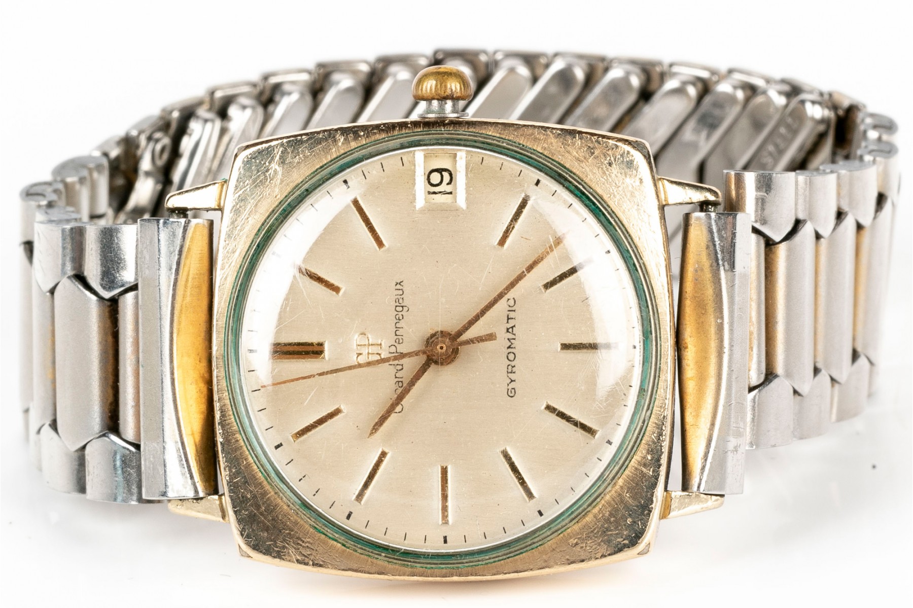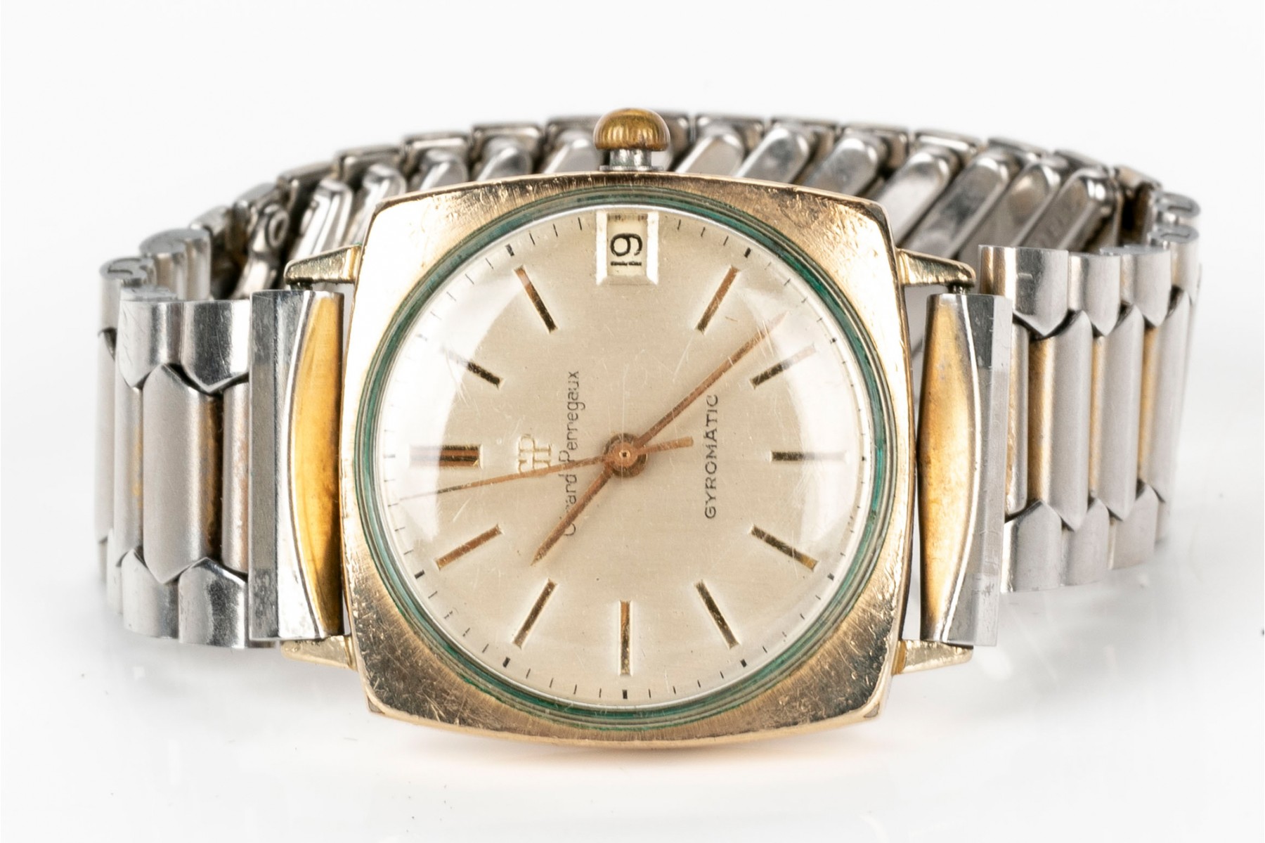 Gyromatic vintage gold filled cushion case wristwatch, round dial, silvered dial. The watch is finished with an expansion style bracelet
