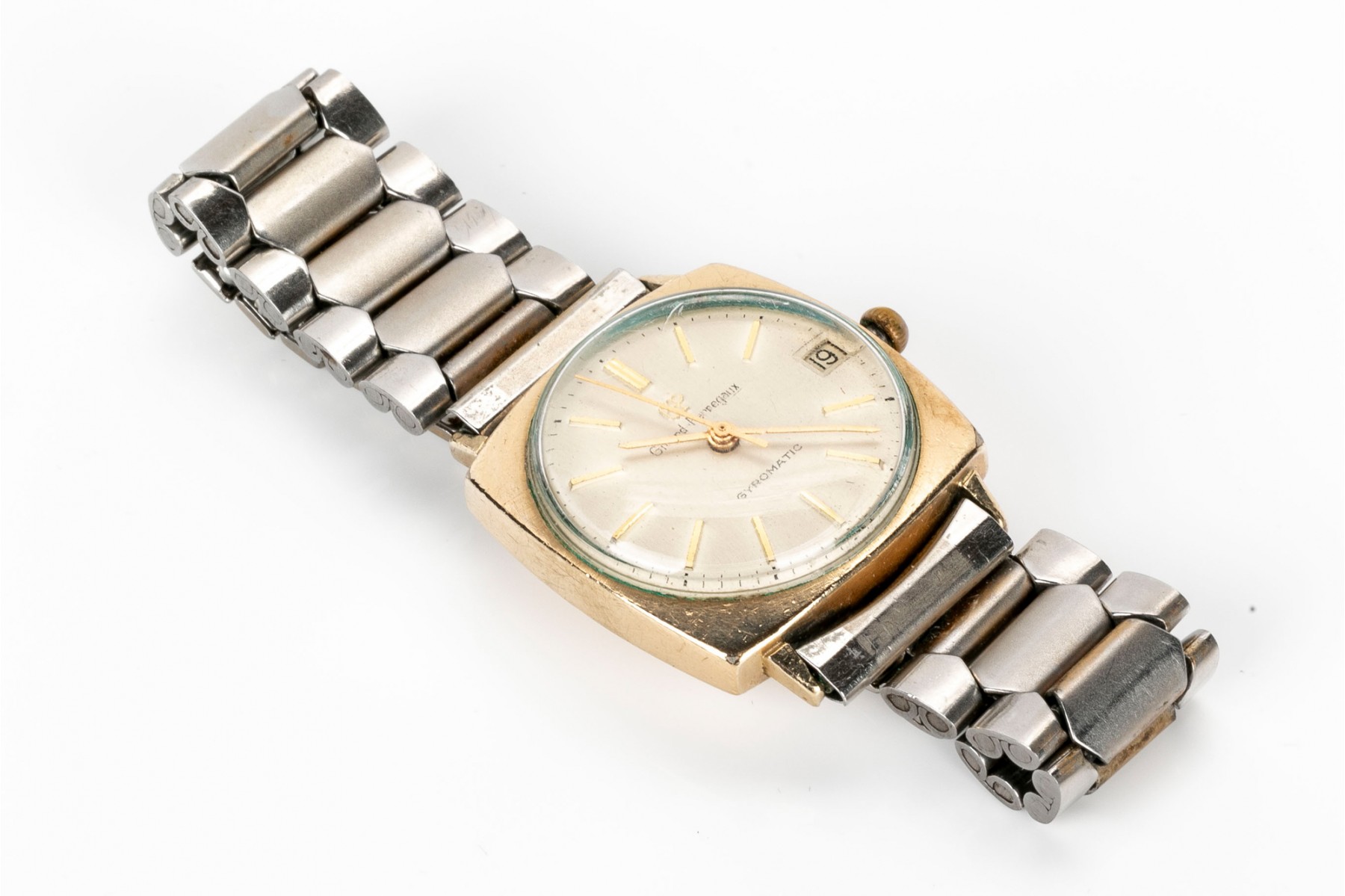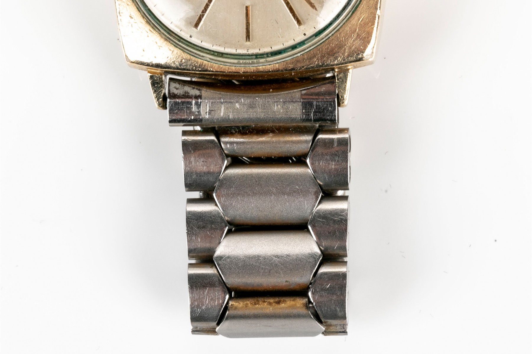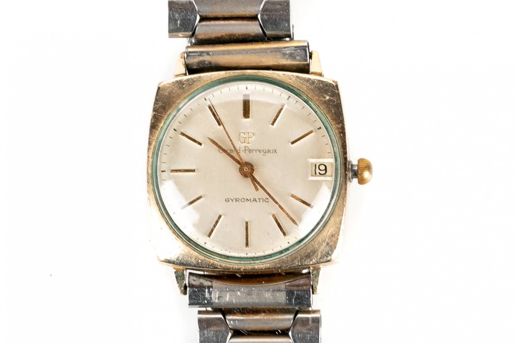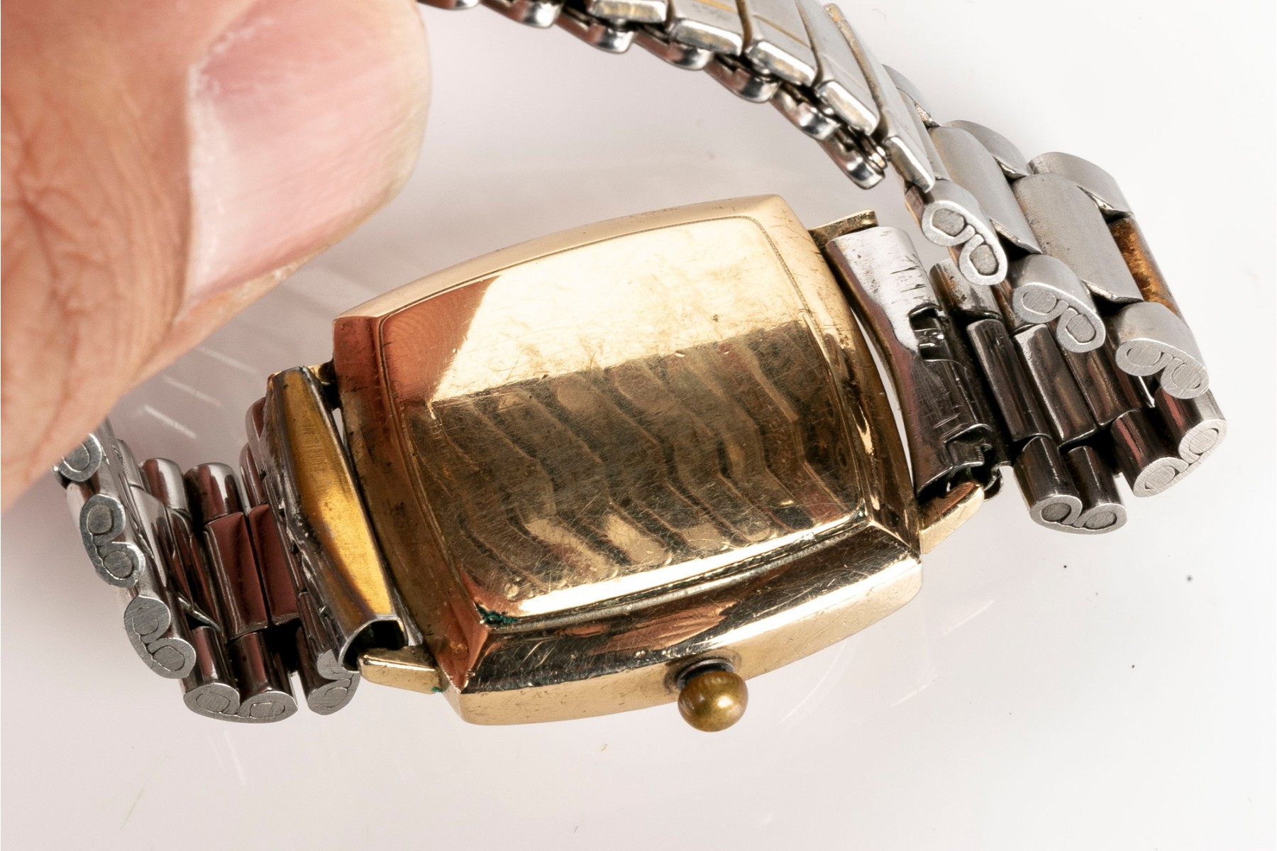 Gyromatic vintage gold filled cushion case wristwatch, round dial, silvered dial. The watch is finished with an expansion style bracelet