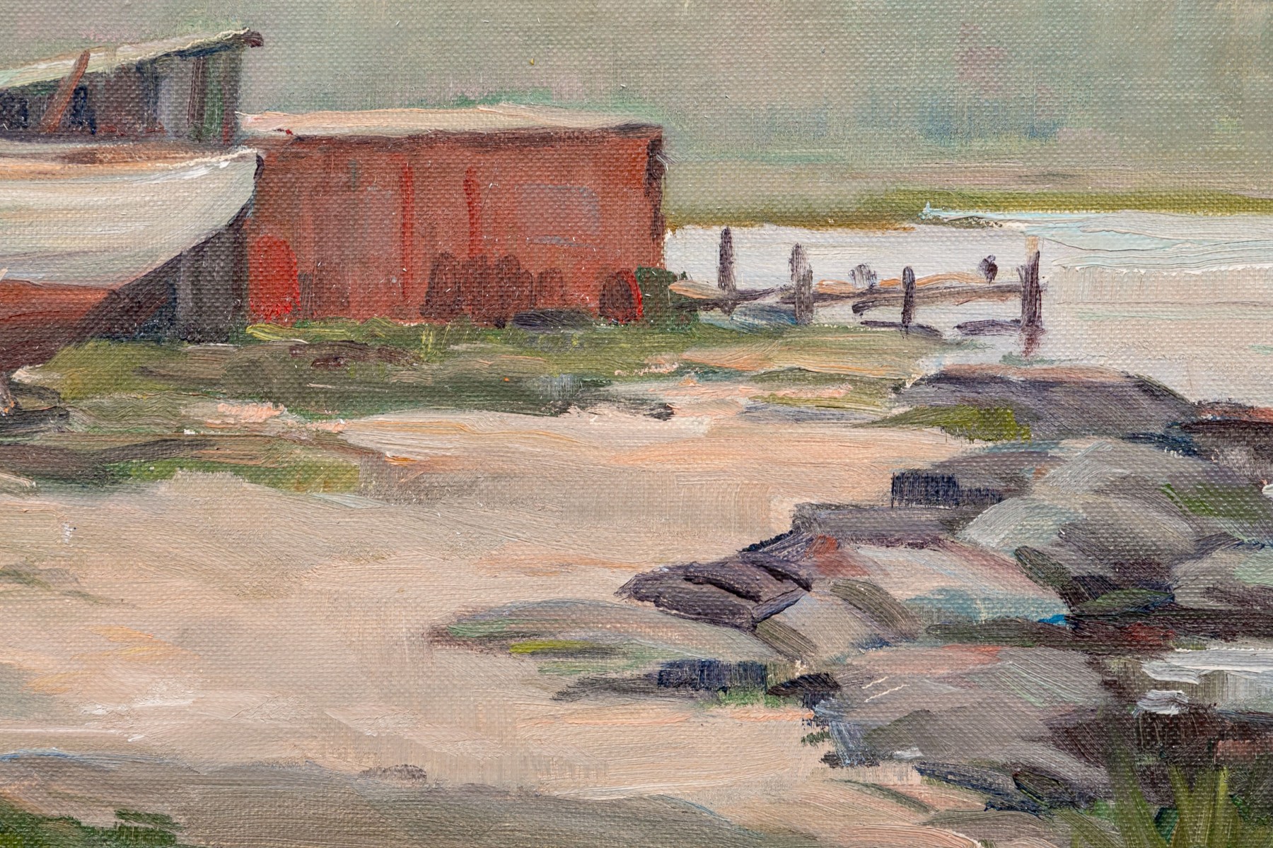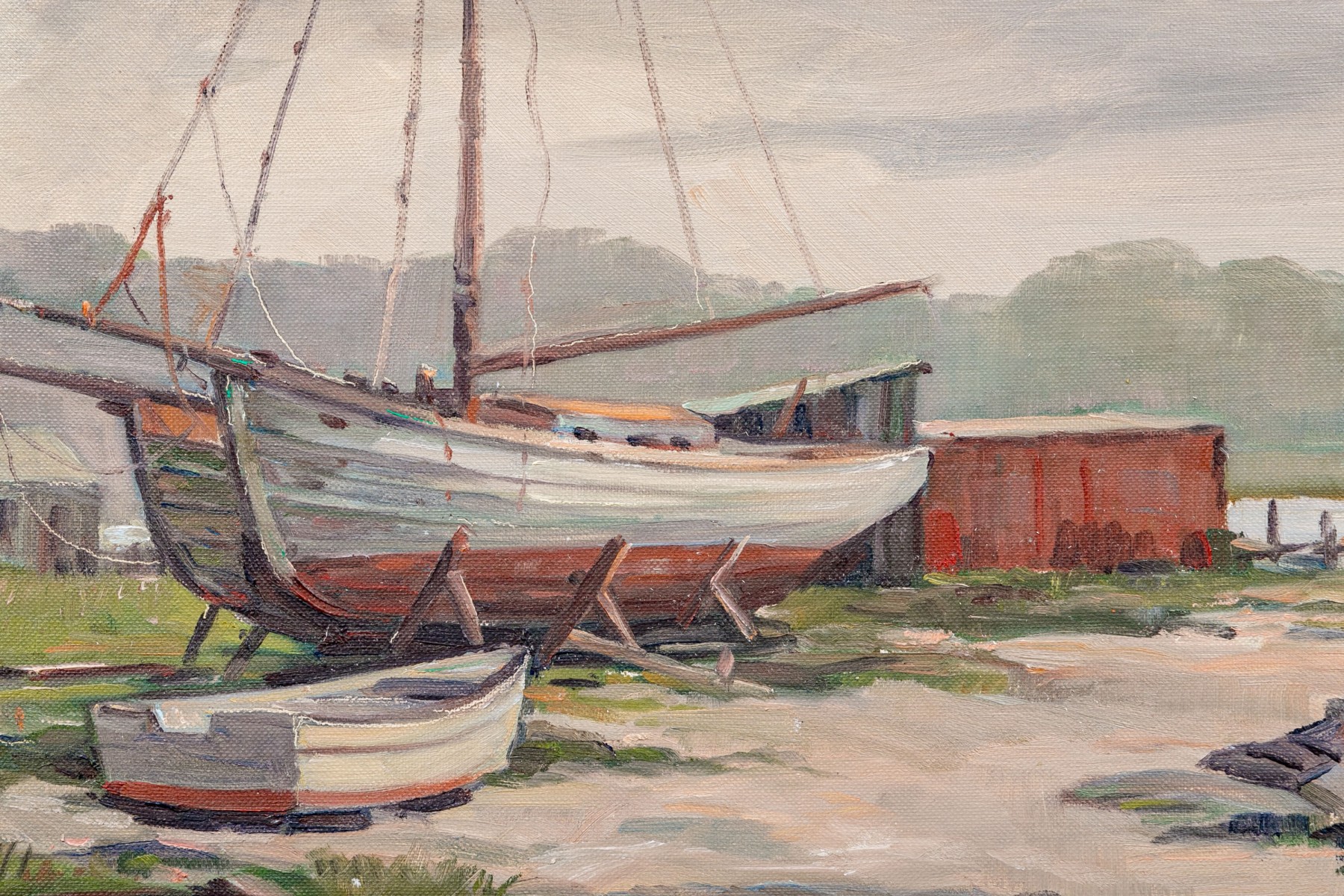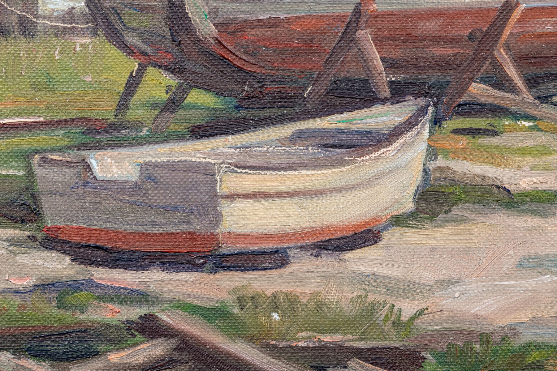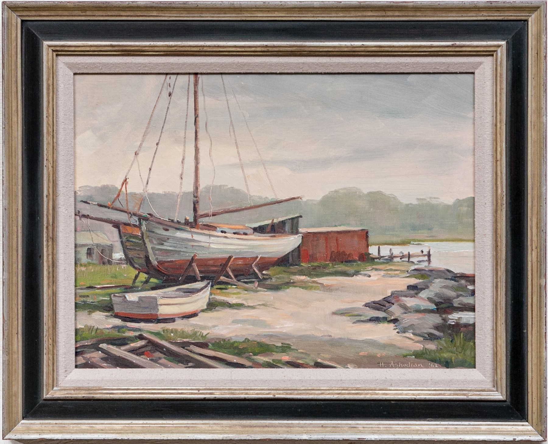 Signed and dated '62 lower right. Boats painted white with red are on shore in dry dock at the end of the season. Presented in a black and gillt frame with linen filet.
