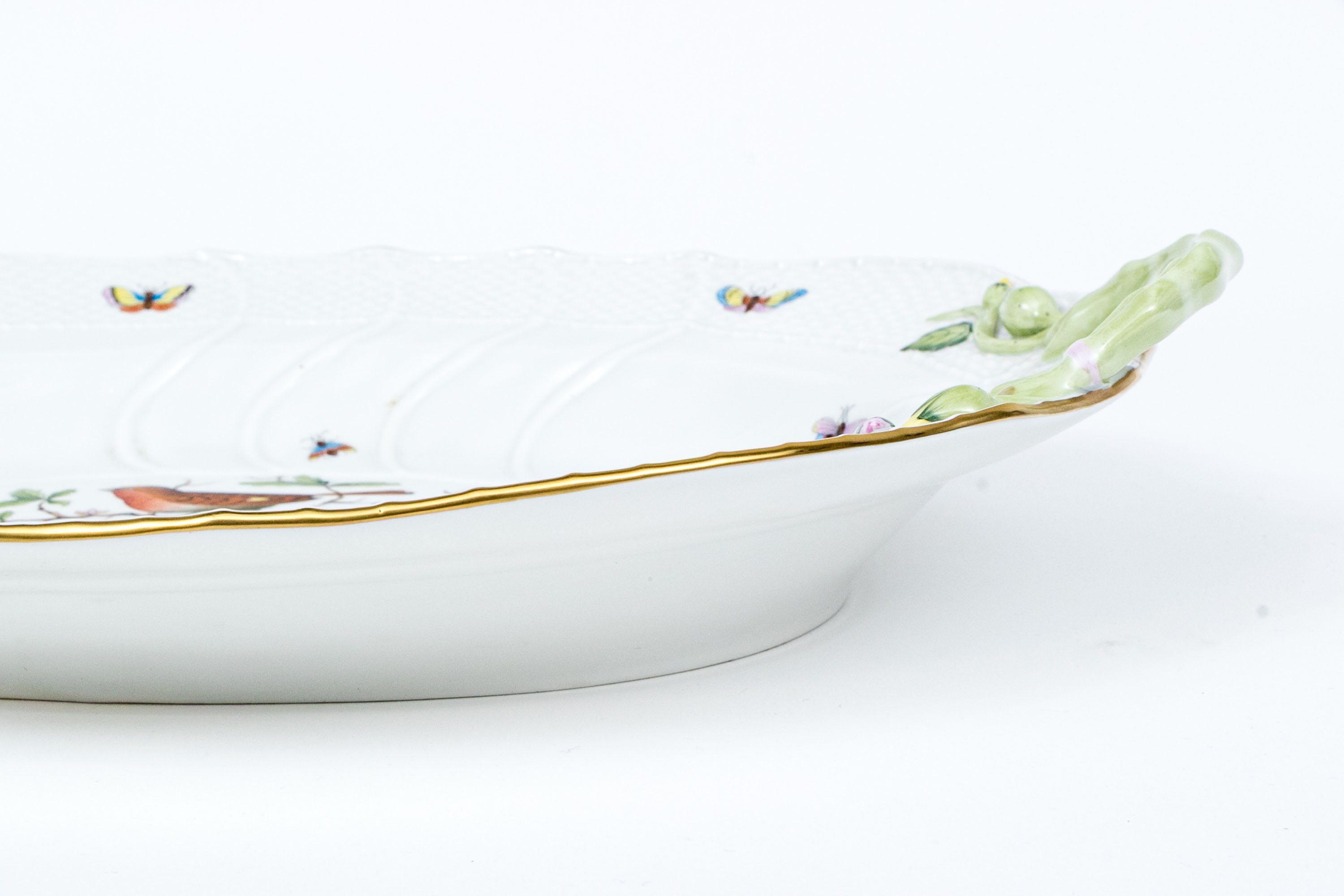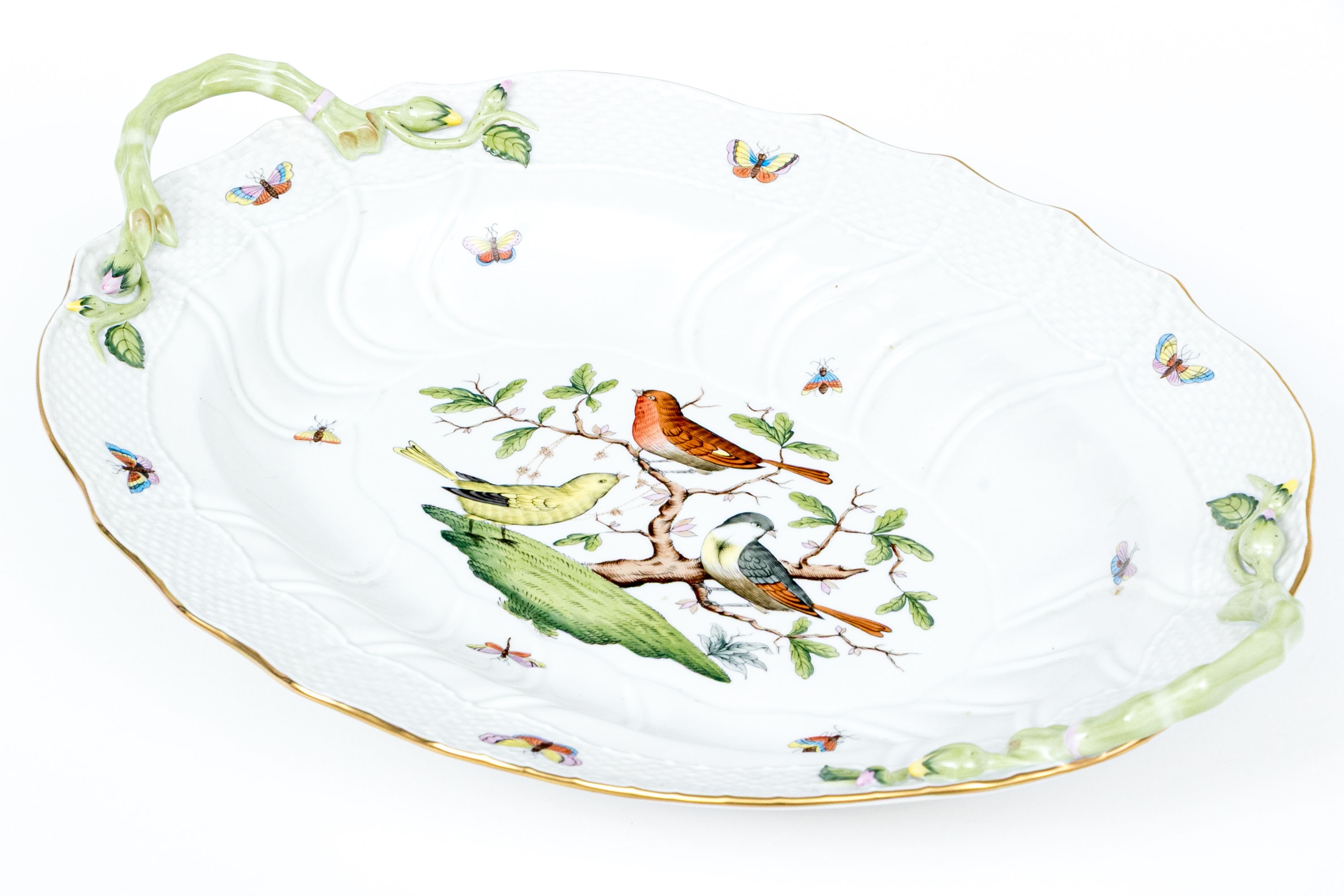 Herend Hungary hand-painted porcelain oval serving dish featuring the Rothschild Bird (RO) pattern with applied floral handles and 24K gold trim. This elegant handled dish is crafted in Herend’s signature osier (basketweave) molded pattern, with scalloped edges and delicate green branch-form handles adorned with bud and leaf appliqués at each end. The dish is richly decorated with Herend’s iconic Rothschild Bird scene at center, depicting three finely detailed songbirds perched on leafy branches with necklace, surrounded by colorful butterflies, beetles, and insects—each one uniquely hand-painted in vivid enamel hues. The design is framed with a softly fluted interior and finished with a hand-applied gold rim. The underside bears the Herend Hungary blue shield hallmark with crossed paintbrushes, HANDPAINTED, and pattern number 1125/RO.