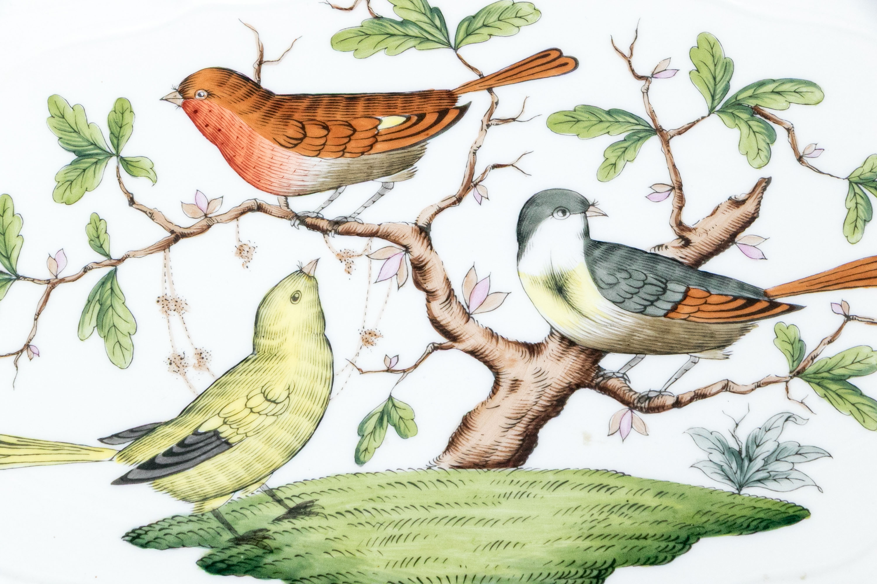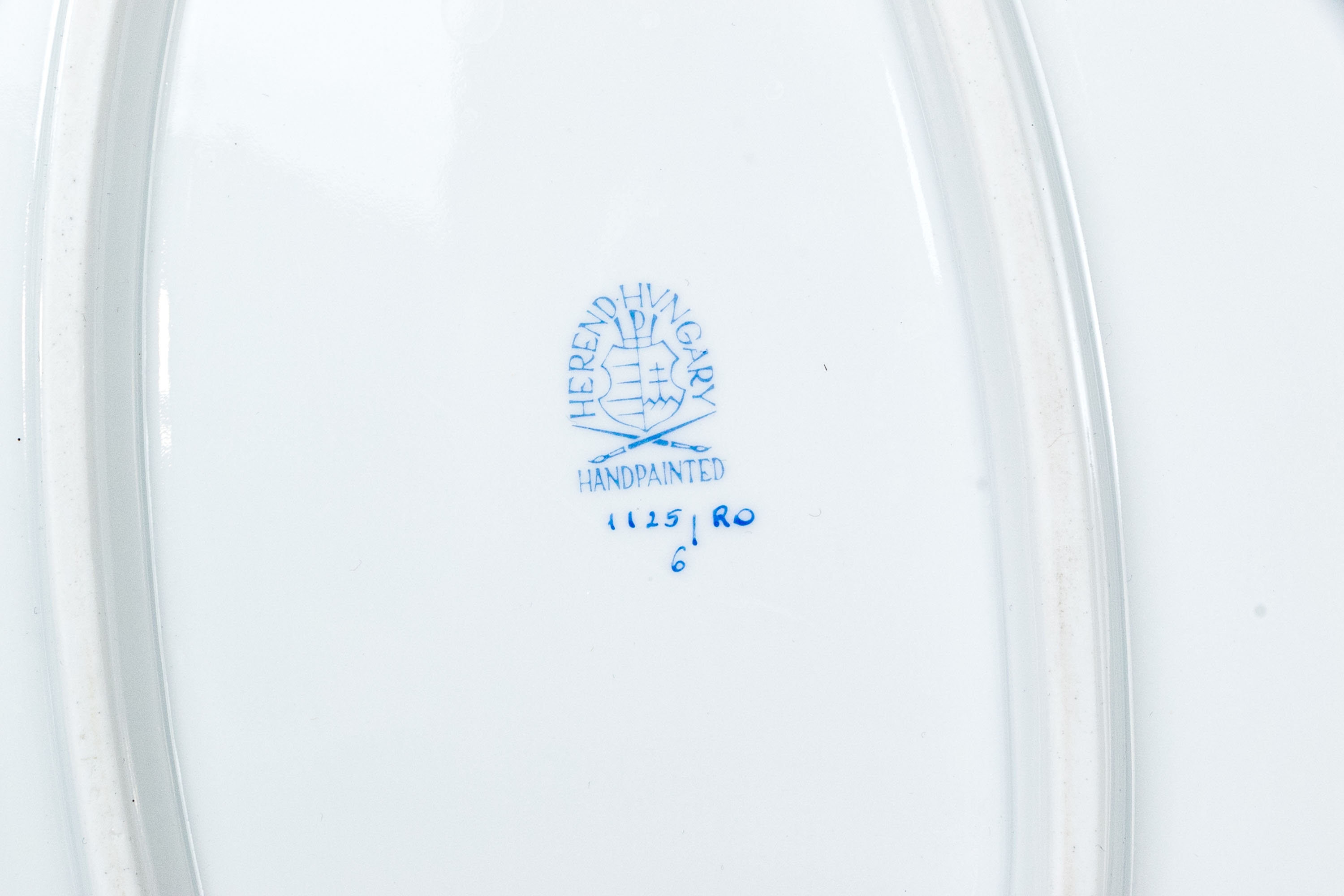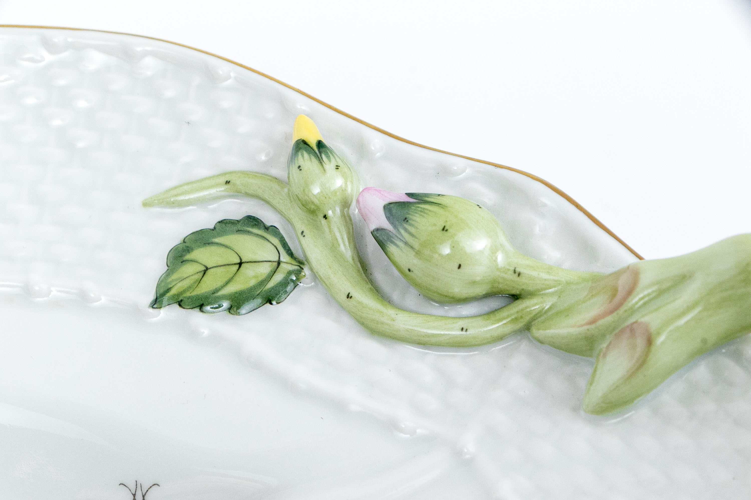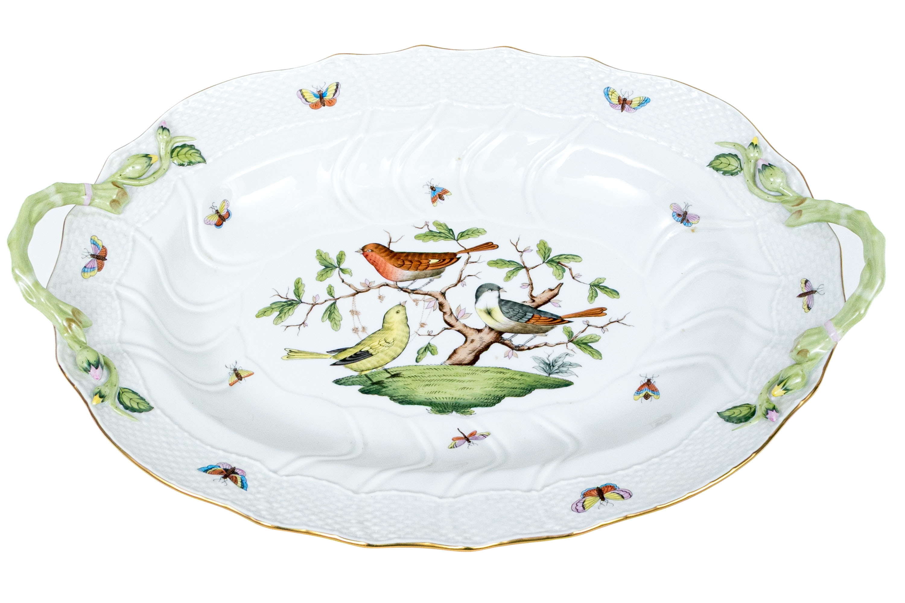 Condition: Excellent condition overall. The dish shows no chips, cracks, or restorations. The gilding remains bright and intact, and the hand-painted decoration is vivid and unmarred. The handles and applied floral elements are complete and undamaged. The glaze retains a beautiful sheen. Underside is clean and clearly marked with the Herend hallmark and pattern code. Light shelf wear to the unglazed base rim, consistent with gentle use and age.