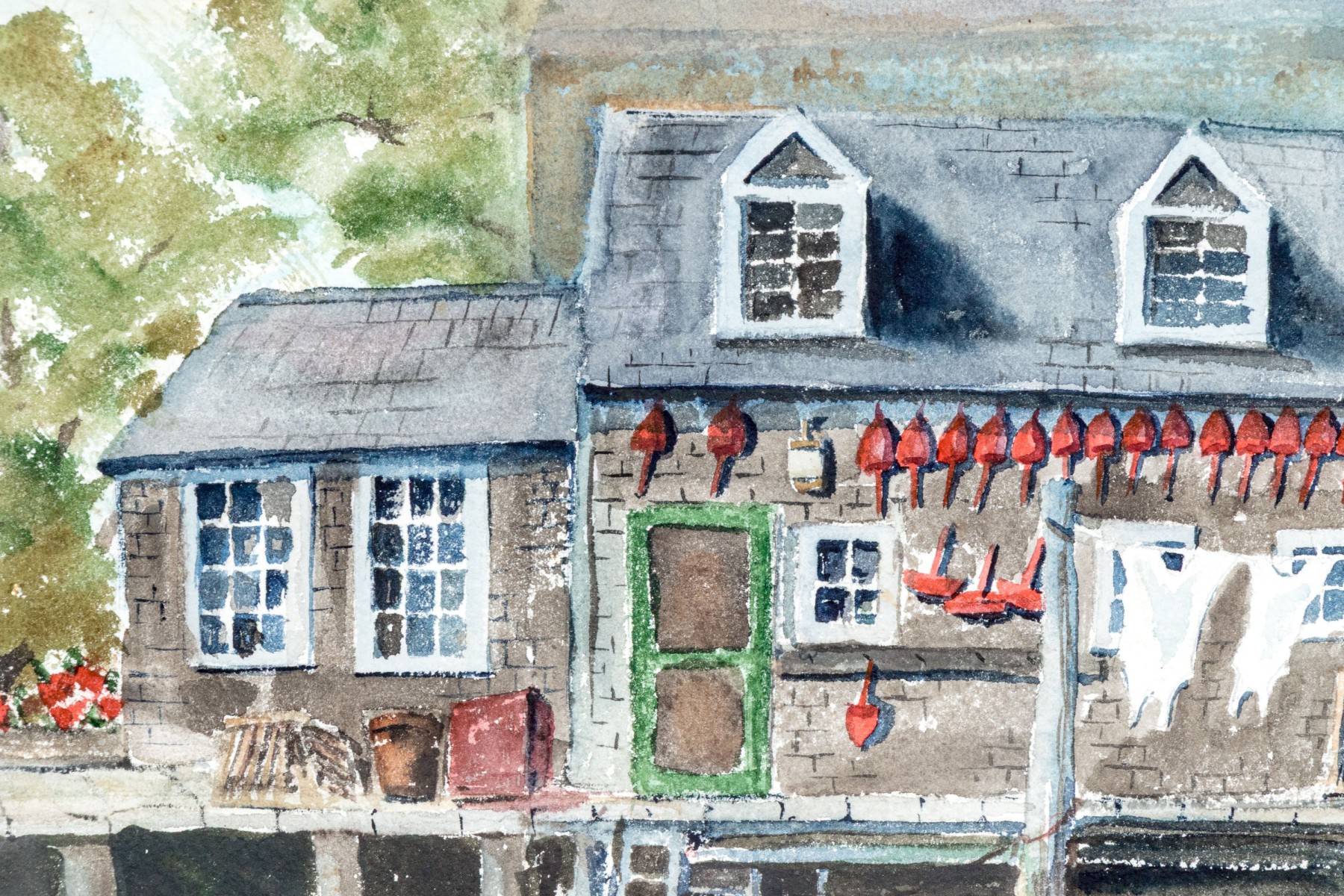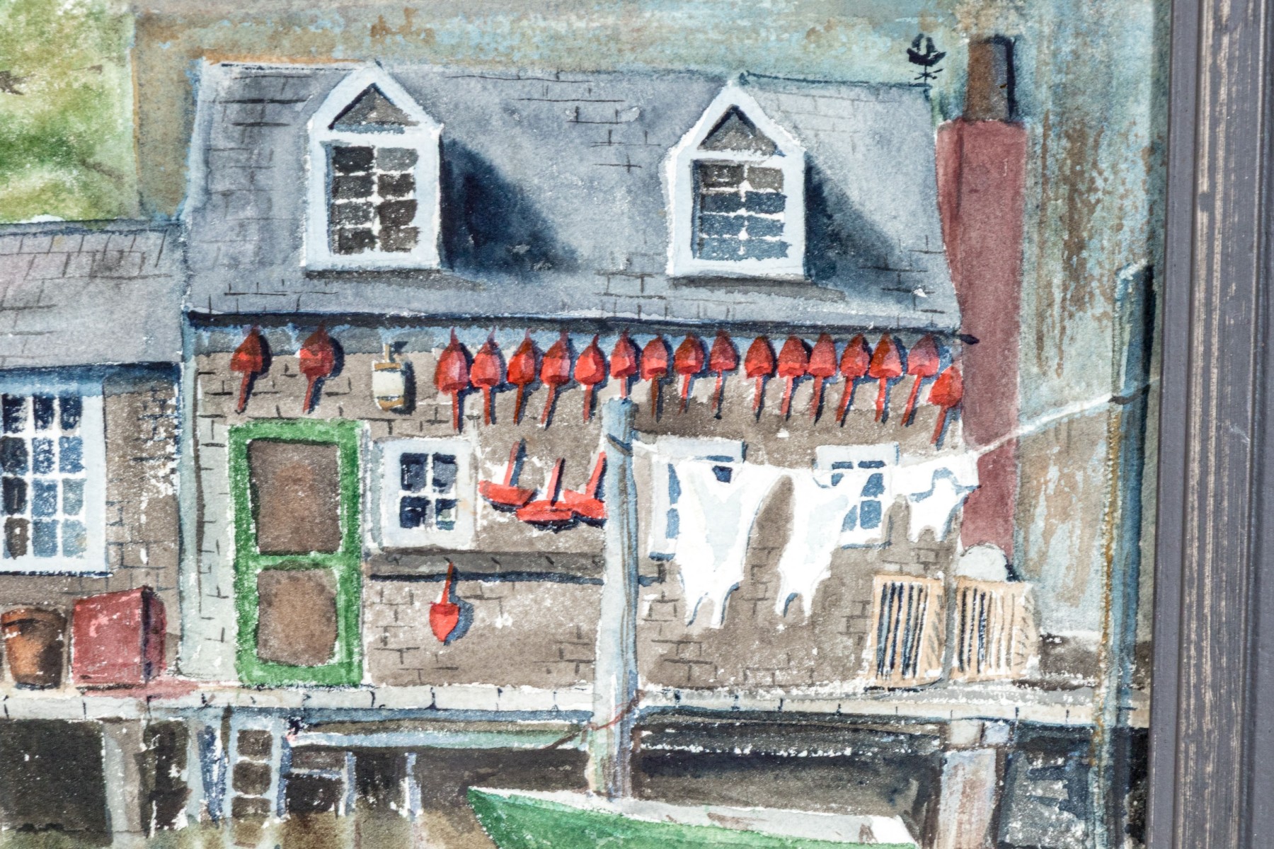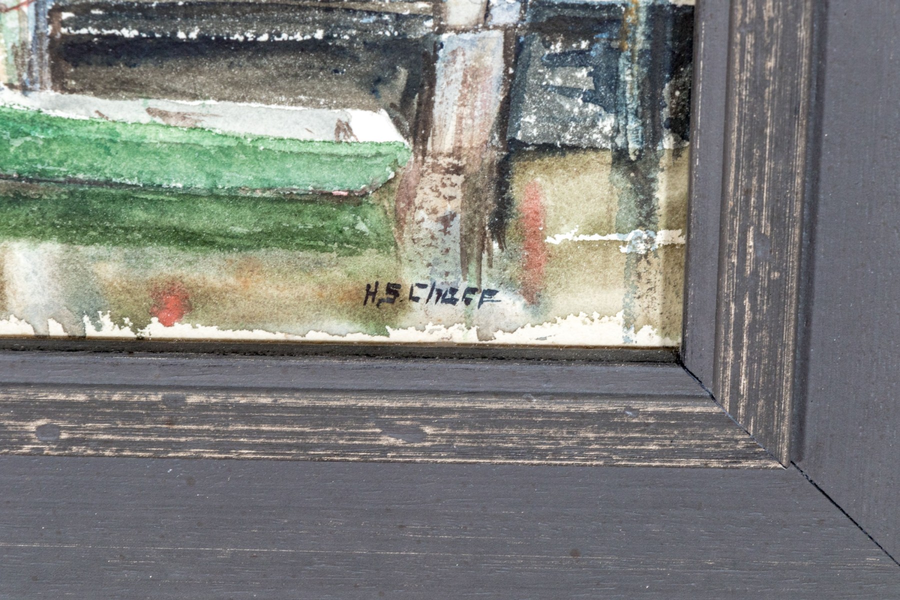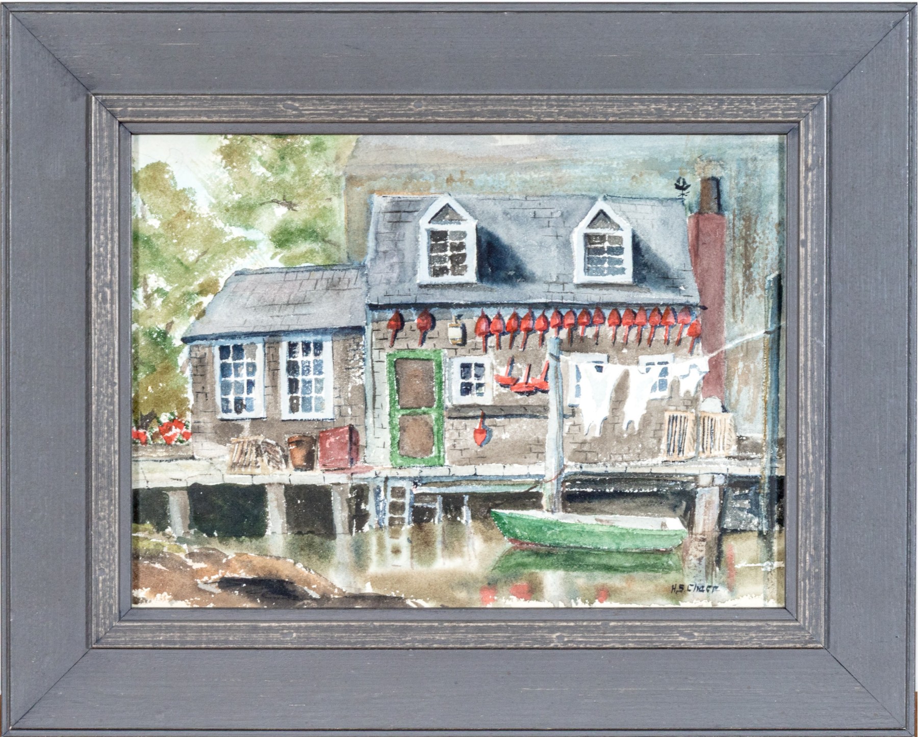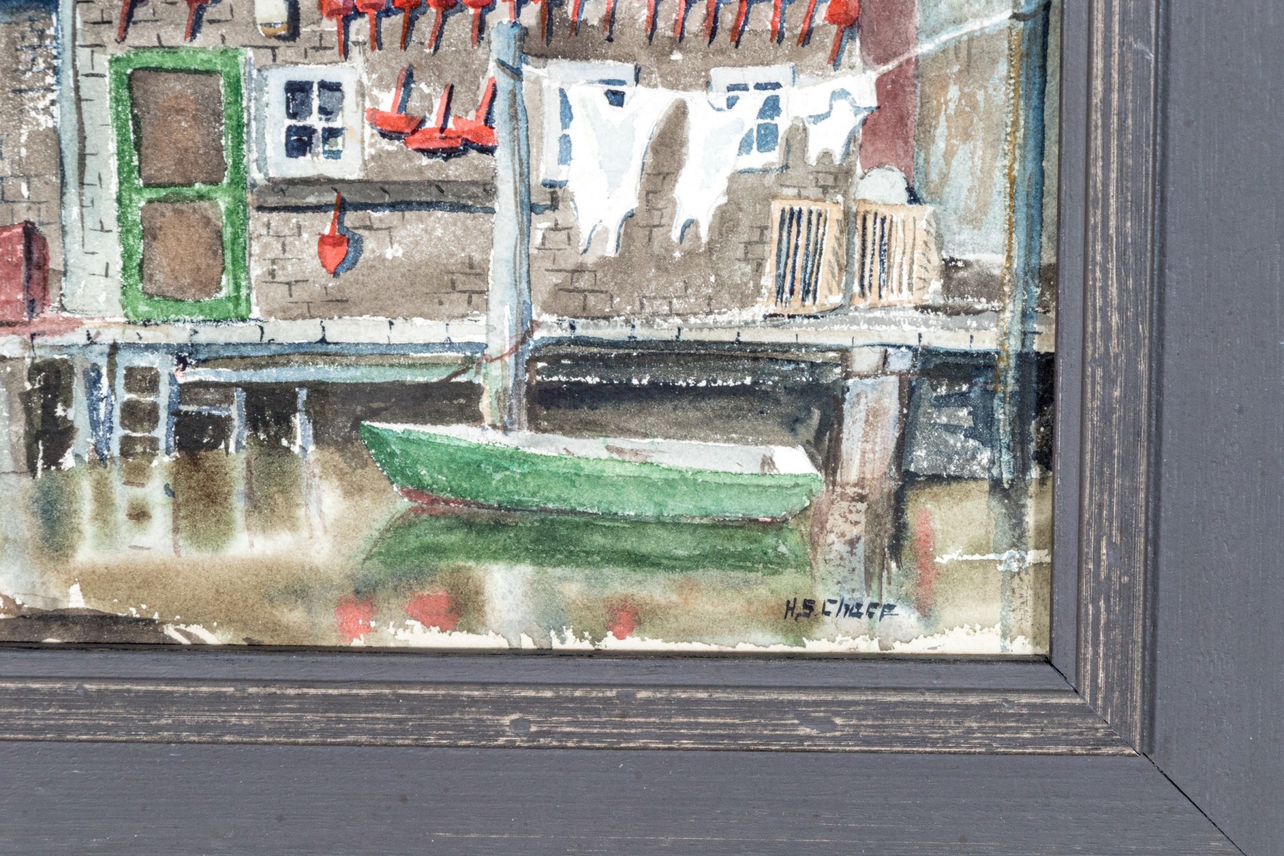 A wonderful watercolor painting on paper depicting a gray house with a chimney lined with red buoys and a green door to match a green boat nearby on calm water. Signed H.S. Chase lower right in black, perhaps Henry "Harry" Seymour Chase Jr. (American, 1853-1889).