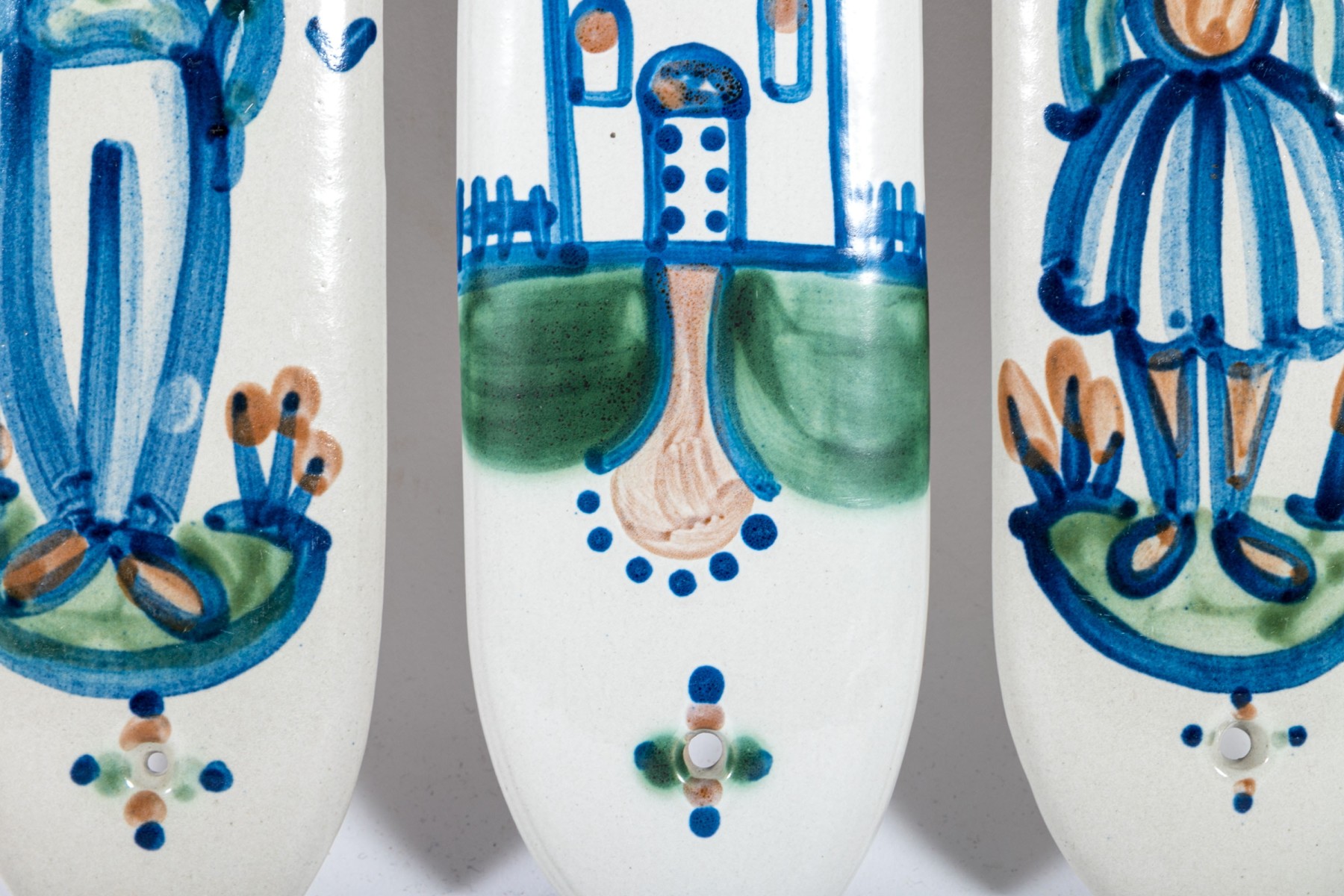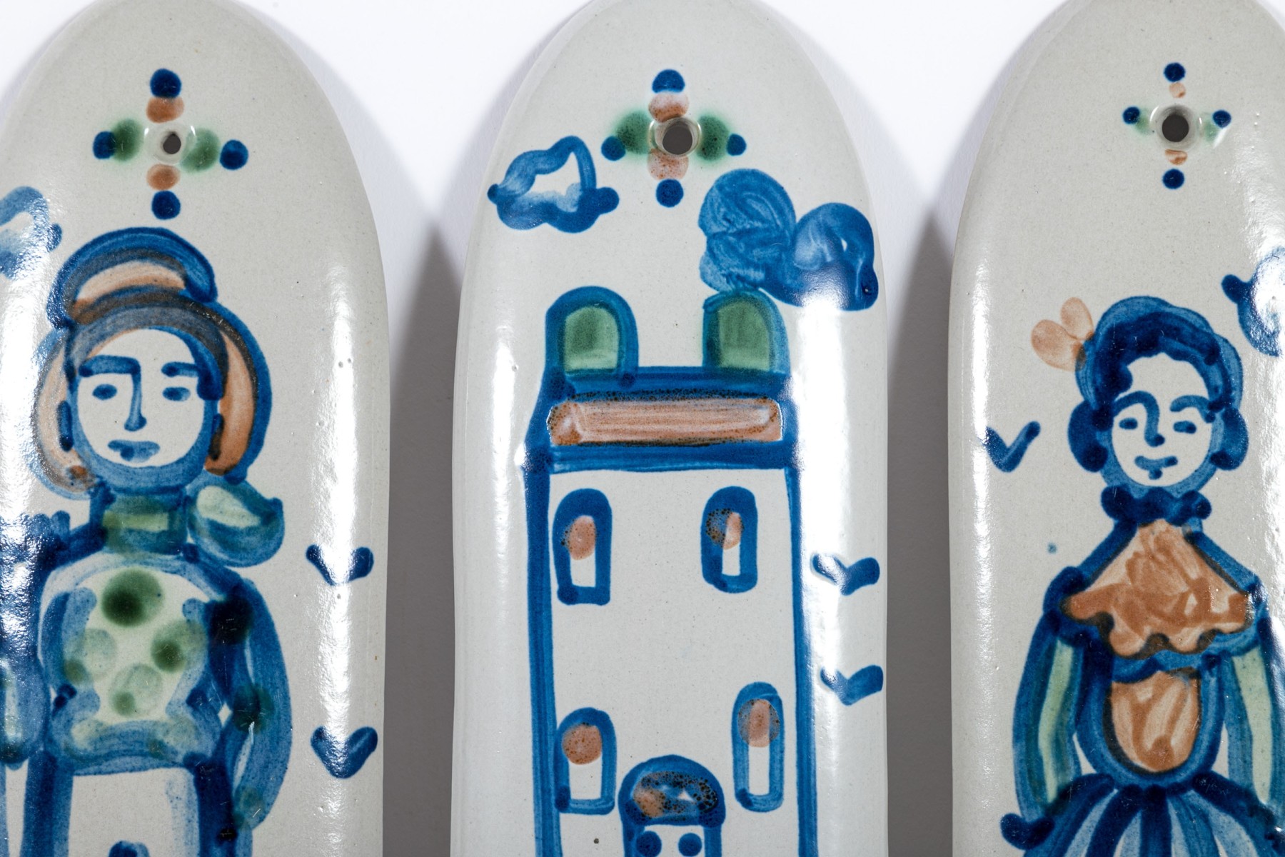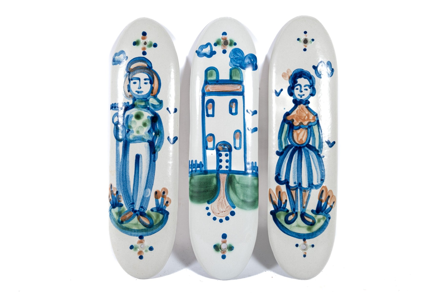 Hadley Pottery trio of ceramic wall plaques, displaying painterly Quimper-styled depictions of a man, woman, and house in blue, green, and orange. Marked on the backs. Each plaque is pierced with a hole at the top and bottom for hanging.