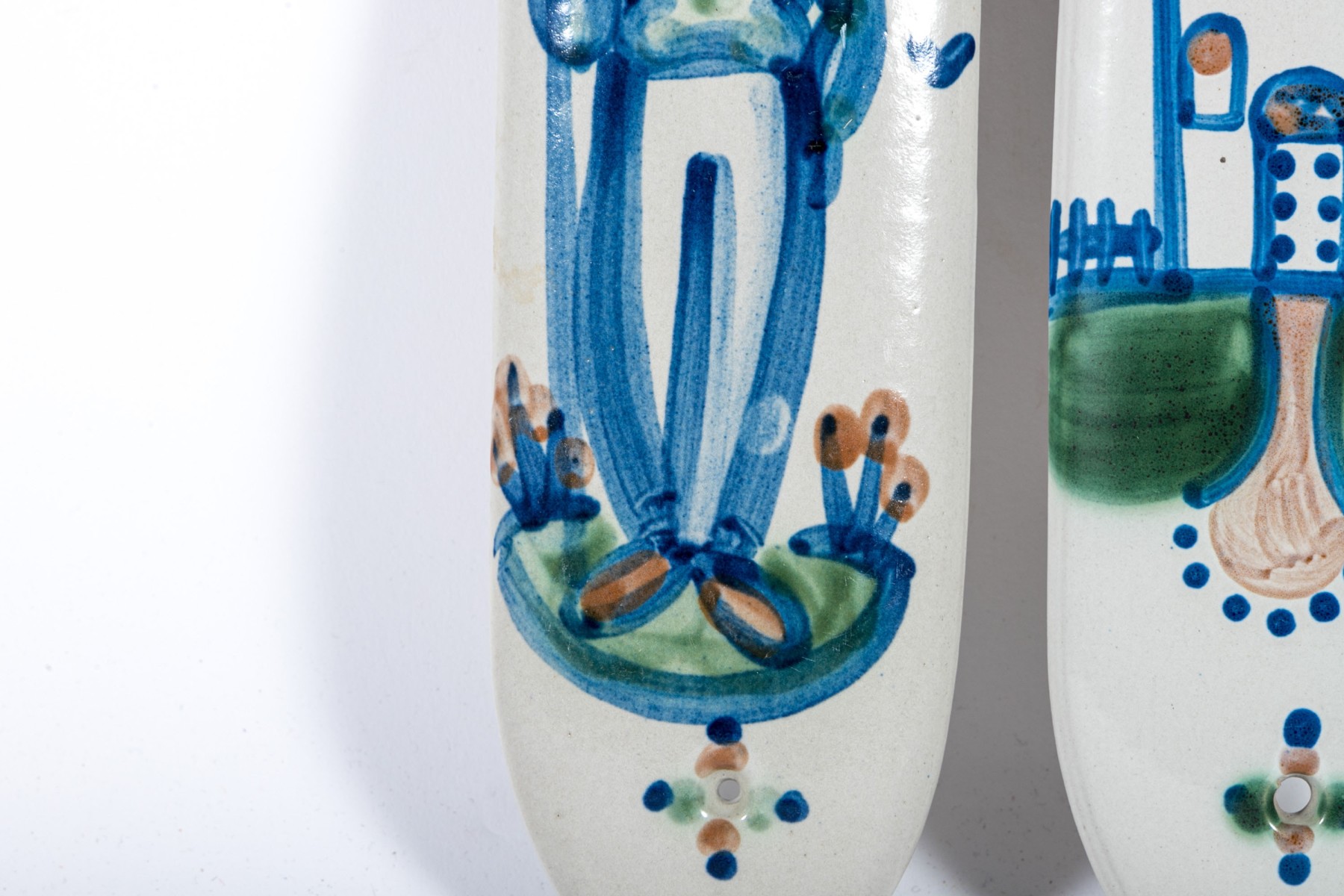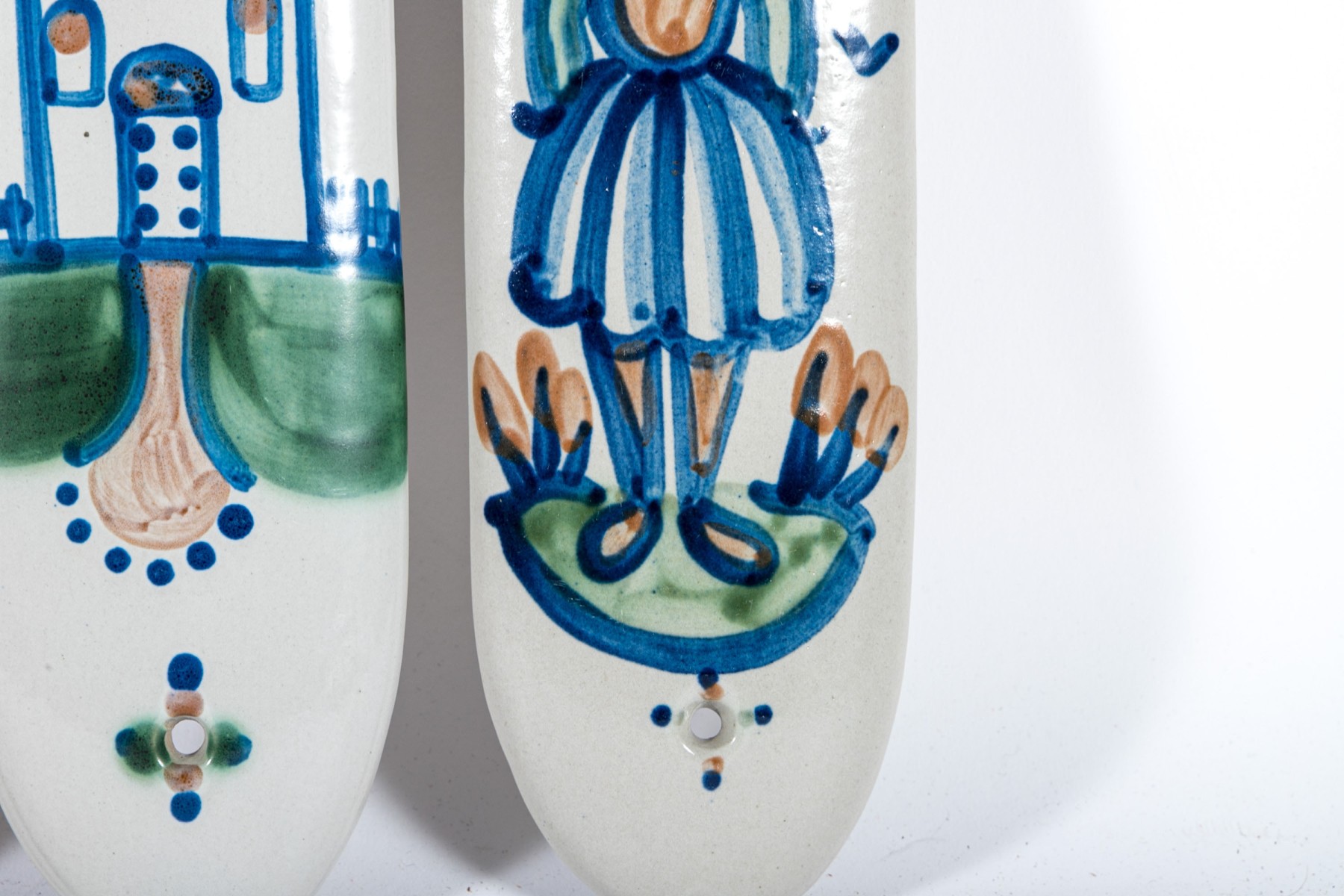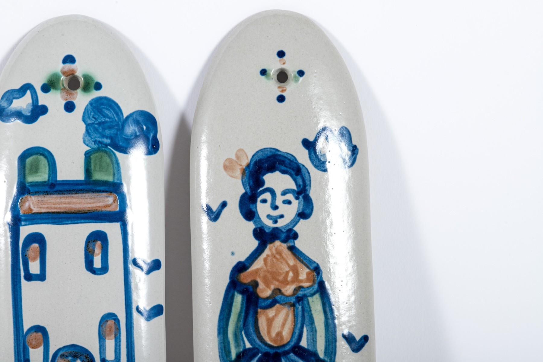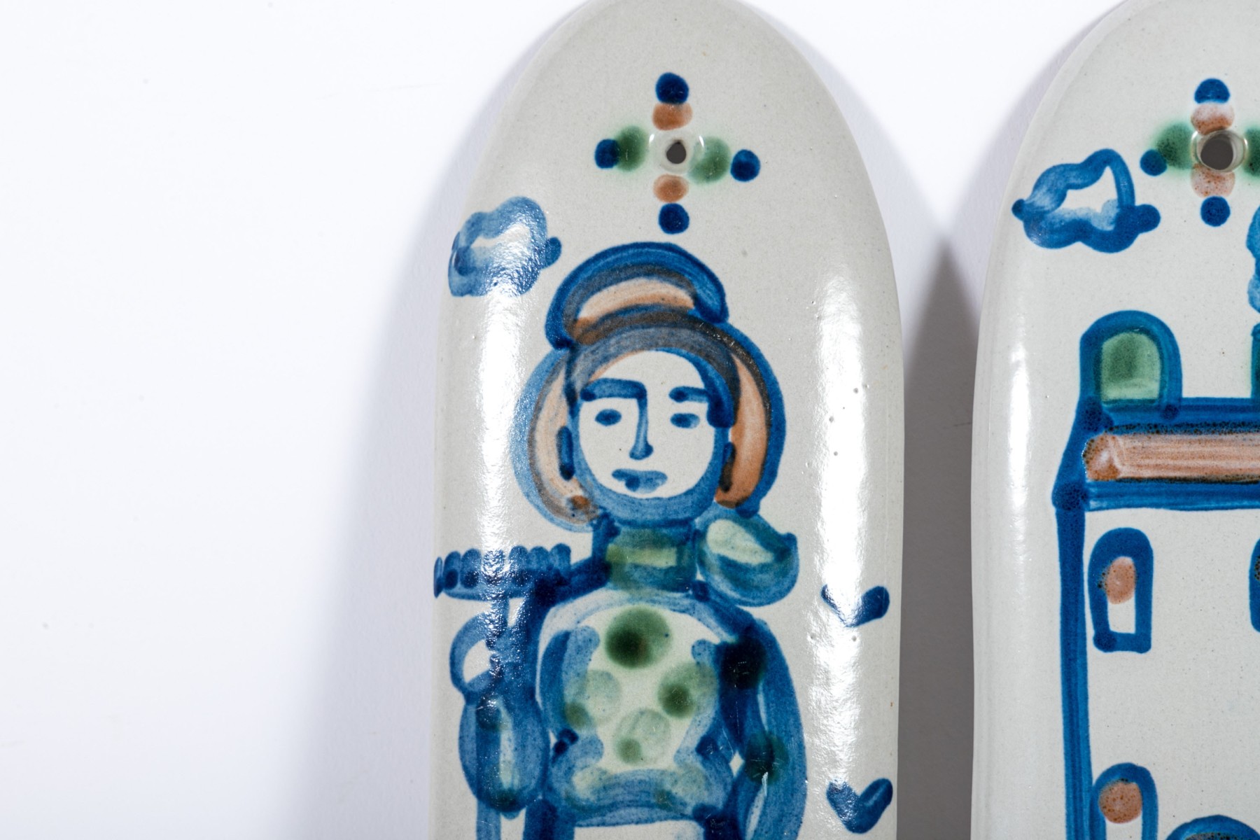 Hadley Pottery trio of ceramic wall plaques, displaying painterly Quimper-styled depictions of a man, woman, and house in blue, green, and orange. Marked on the backs. Each plaque is pierced with a hole at the top and bottom for hanging.