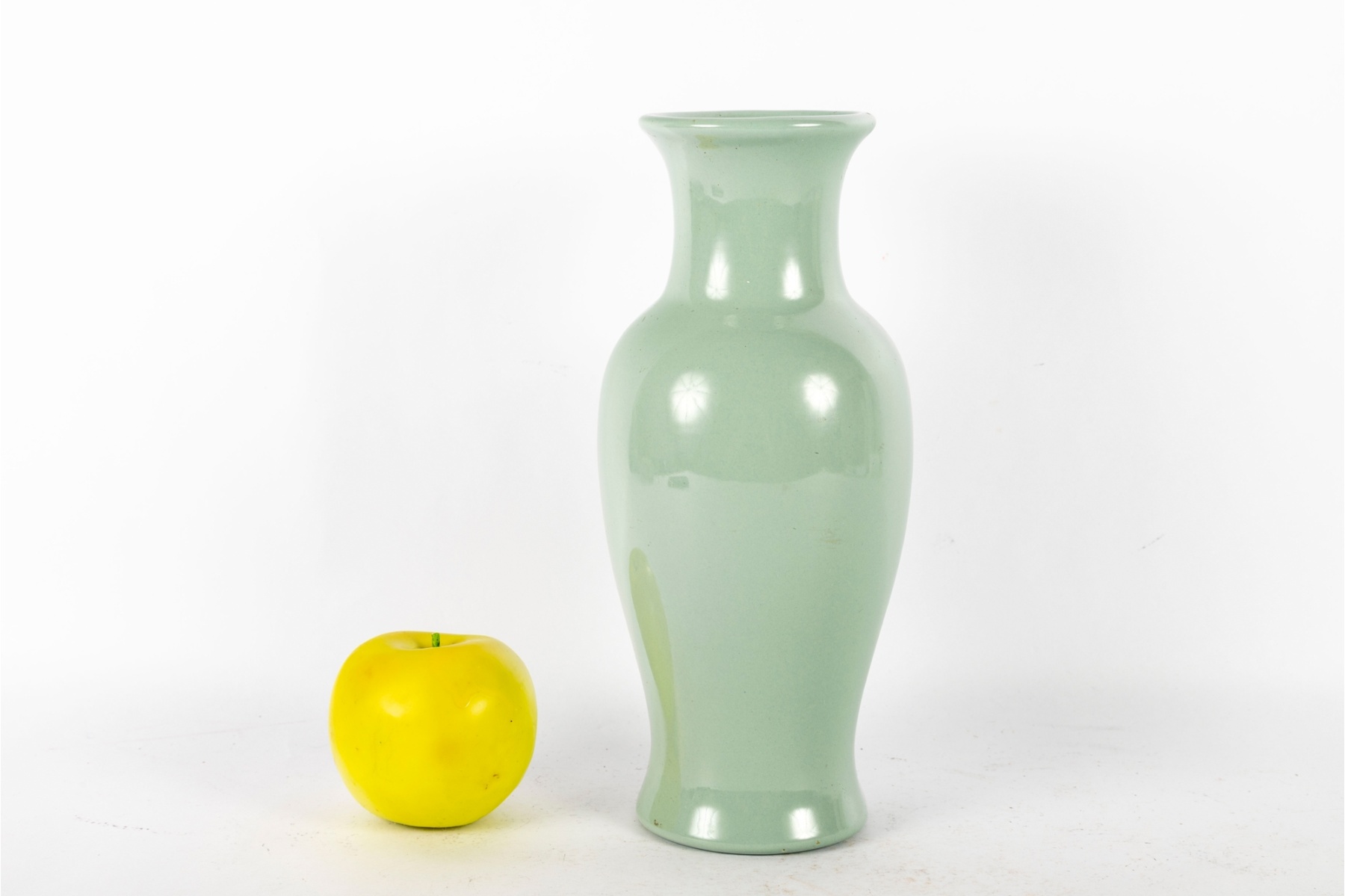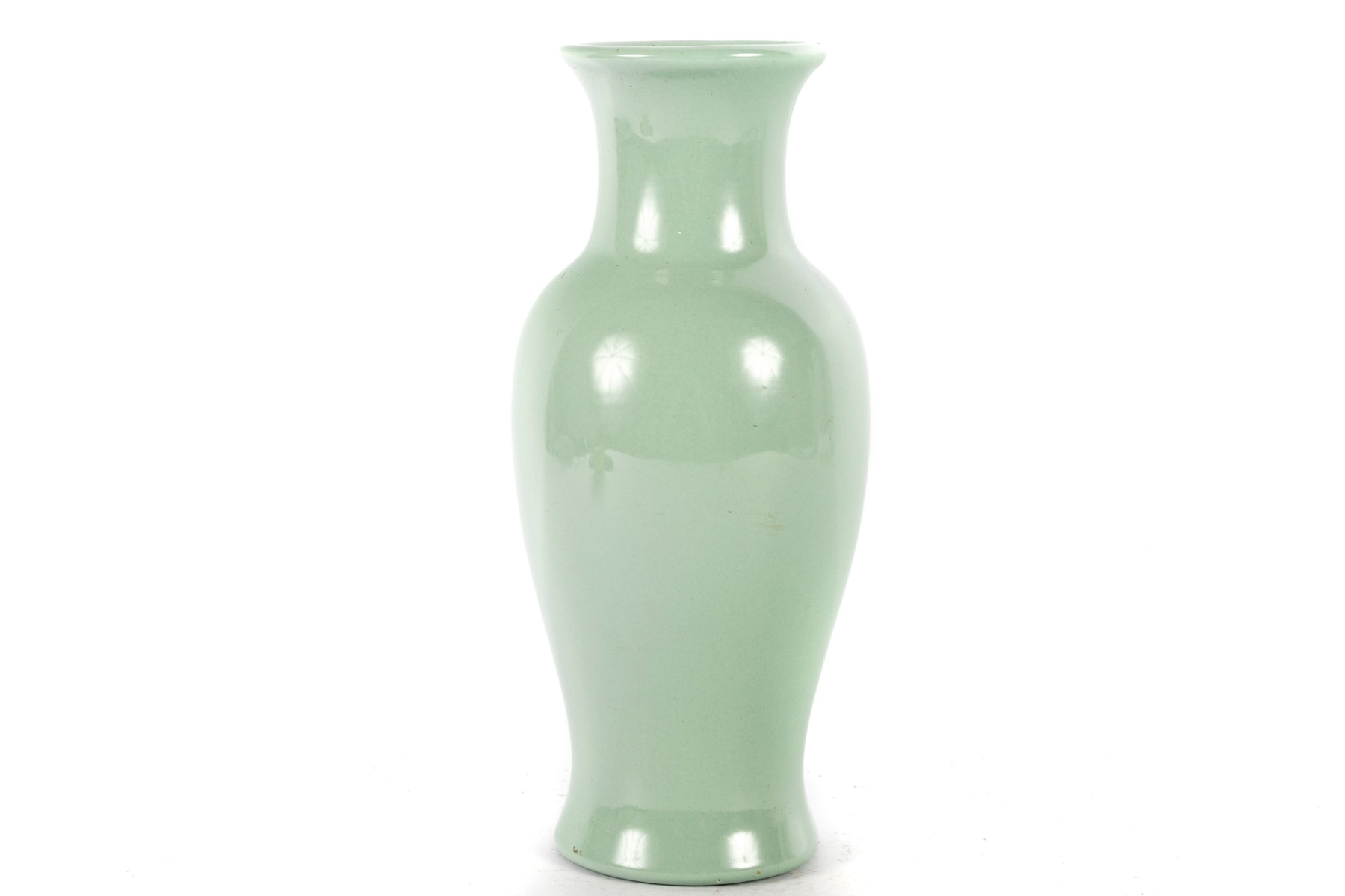 Elegant Haeger pottery vase featuring a soft celadon green glaze with a smooth, glossy finish. The vase has a classic baluster shape with a flared rim and narrow neck, offering a timeless and versatile decorative accent for any setting.