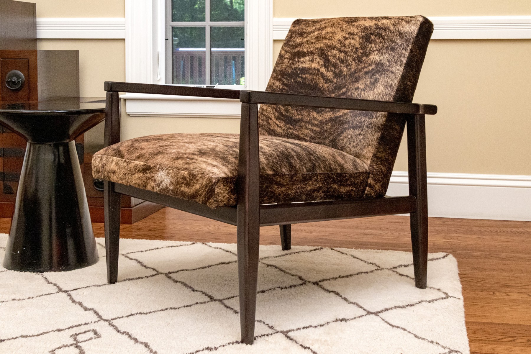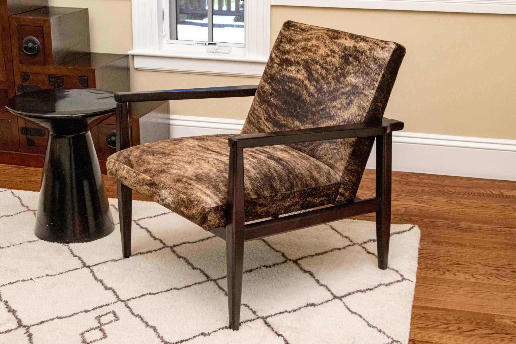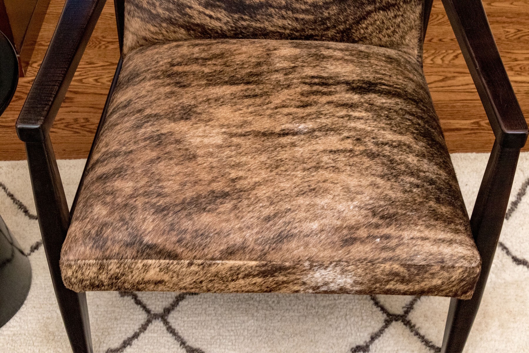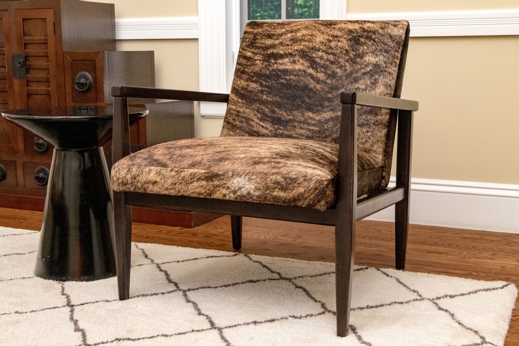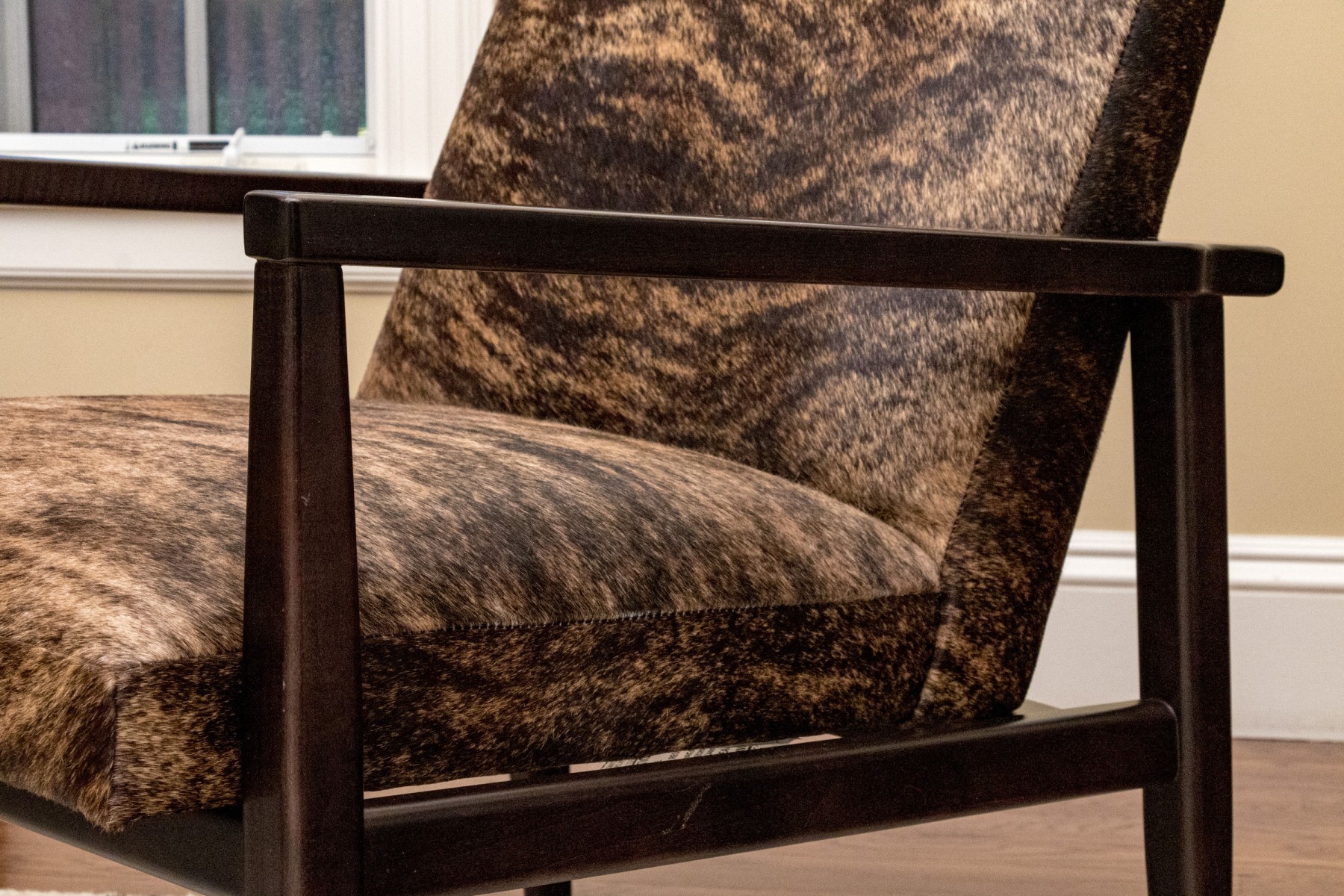 Clean lines and dark espresso wood finish. Hair hide upholstery. Good condition. Presents very well.
