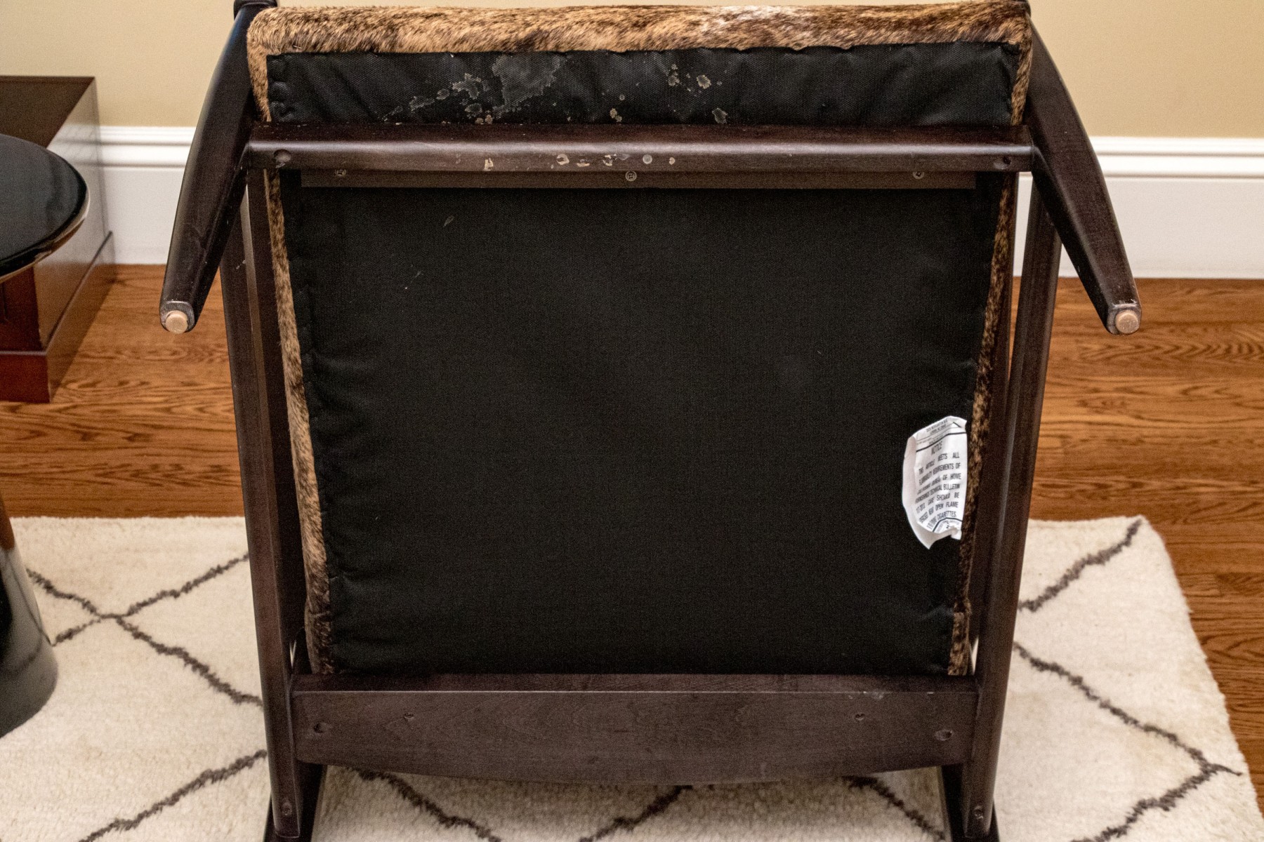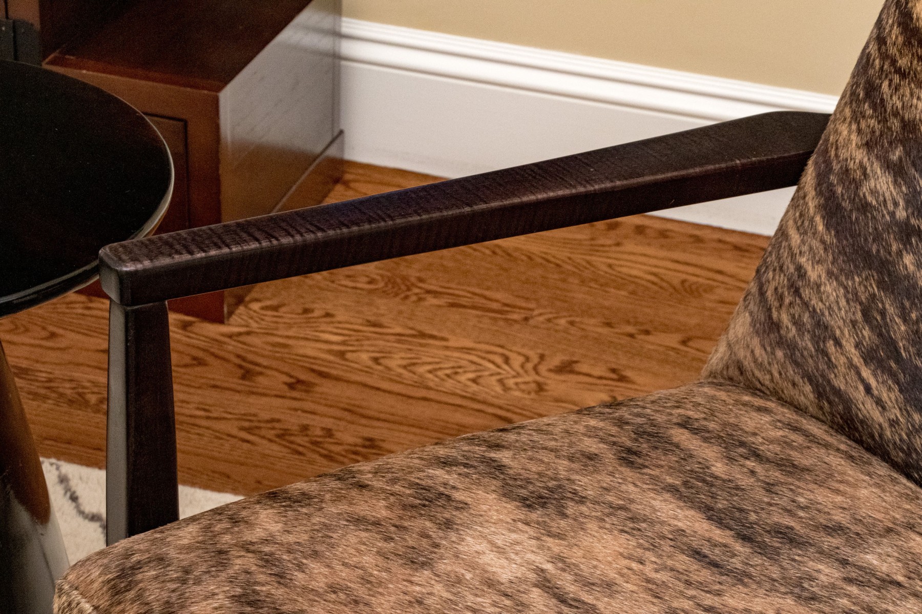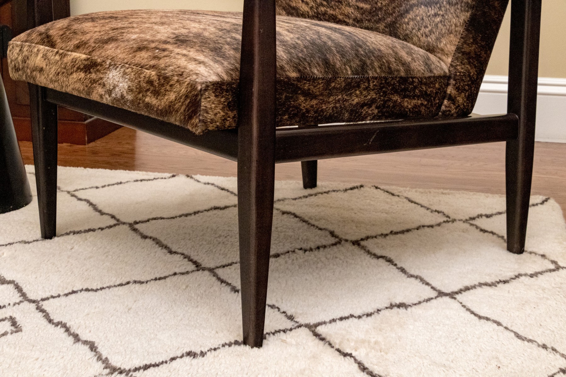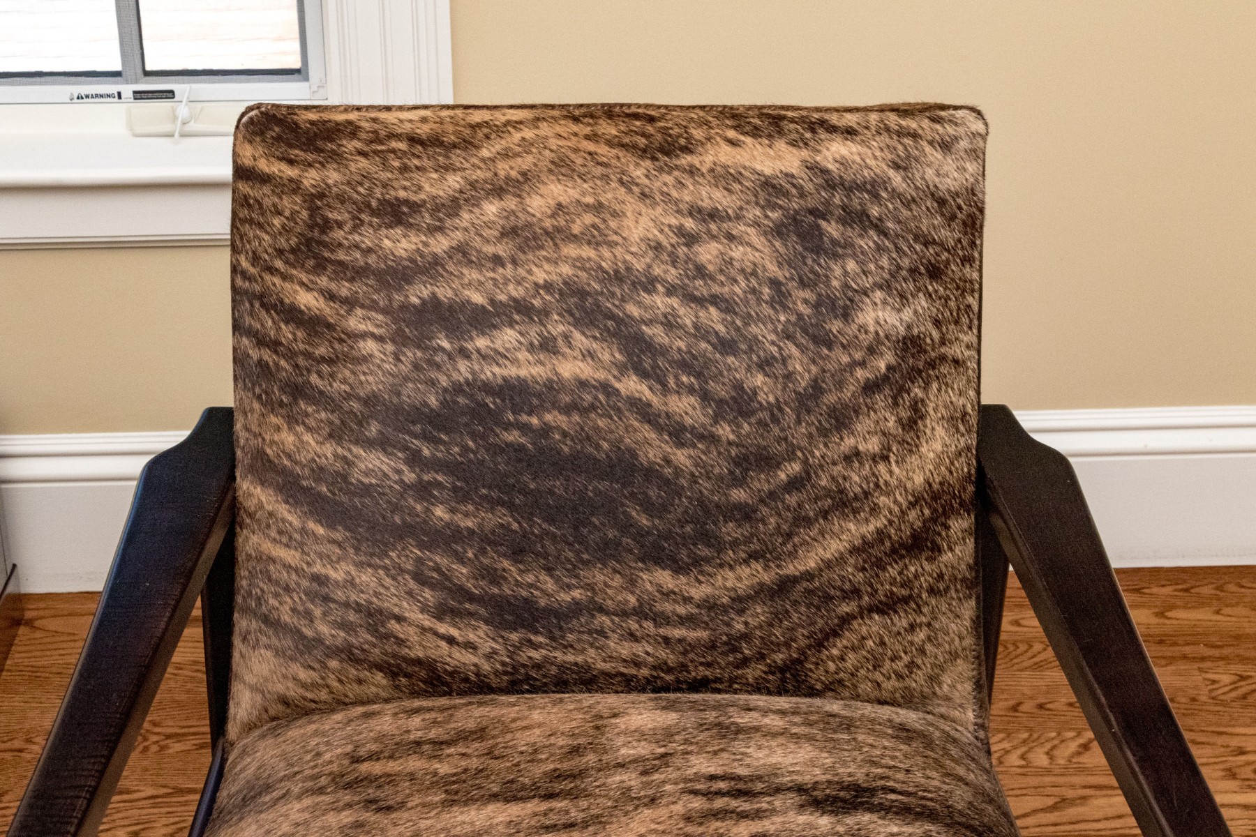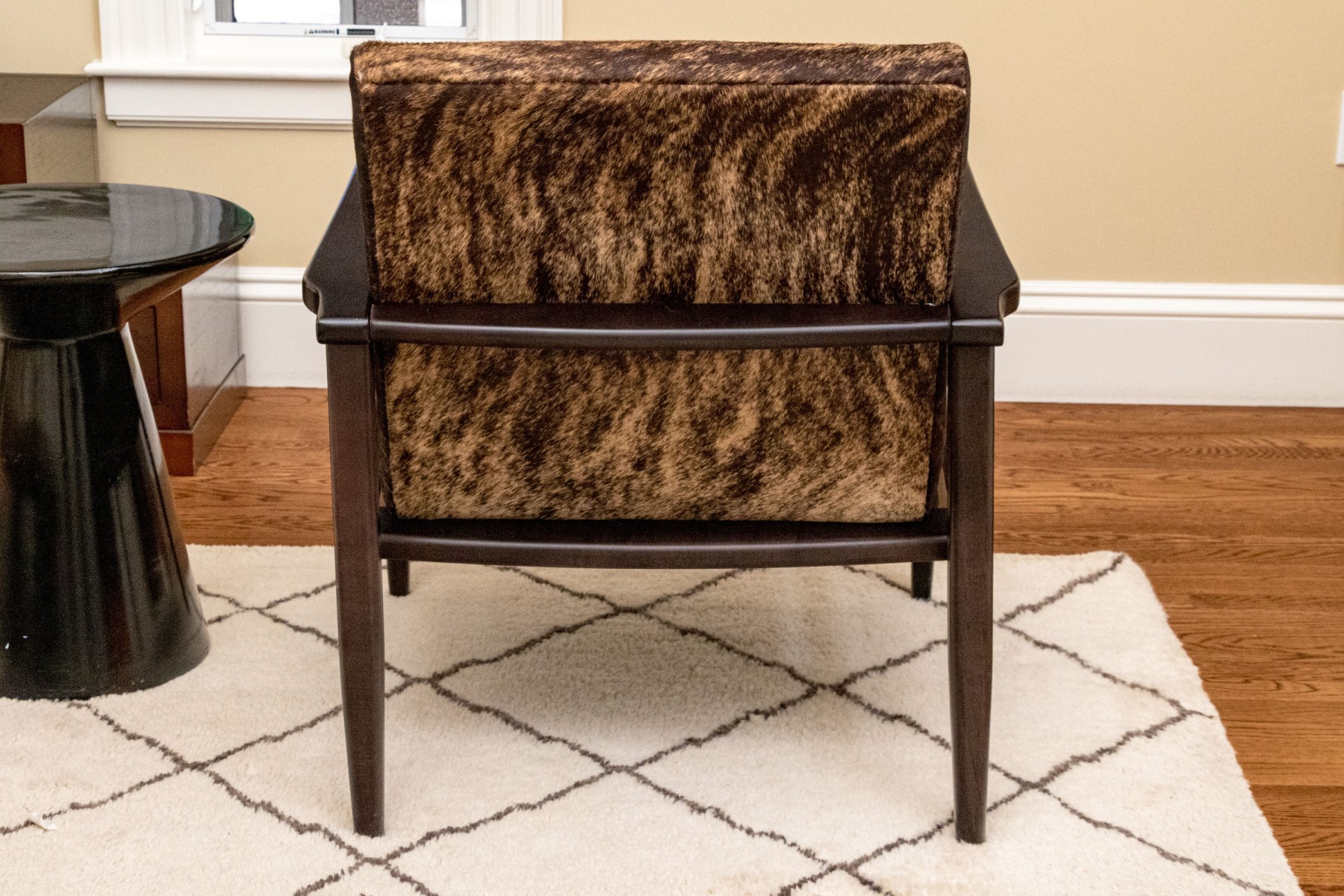 Clean lines and dark espresso wood finish. Hair hide upholstery. Good condition. Presents very well.