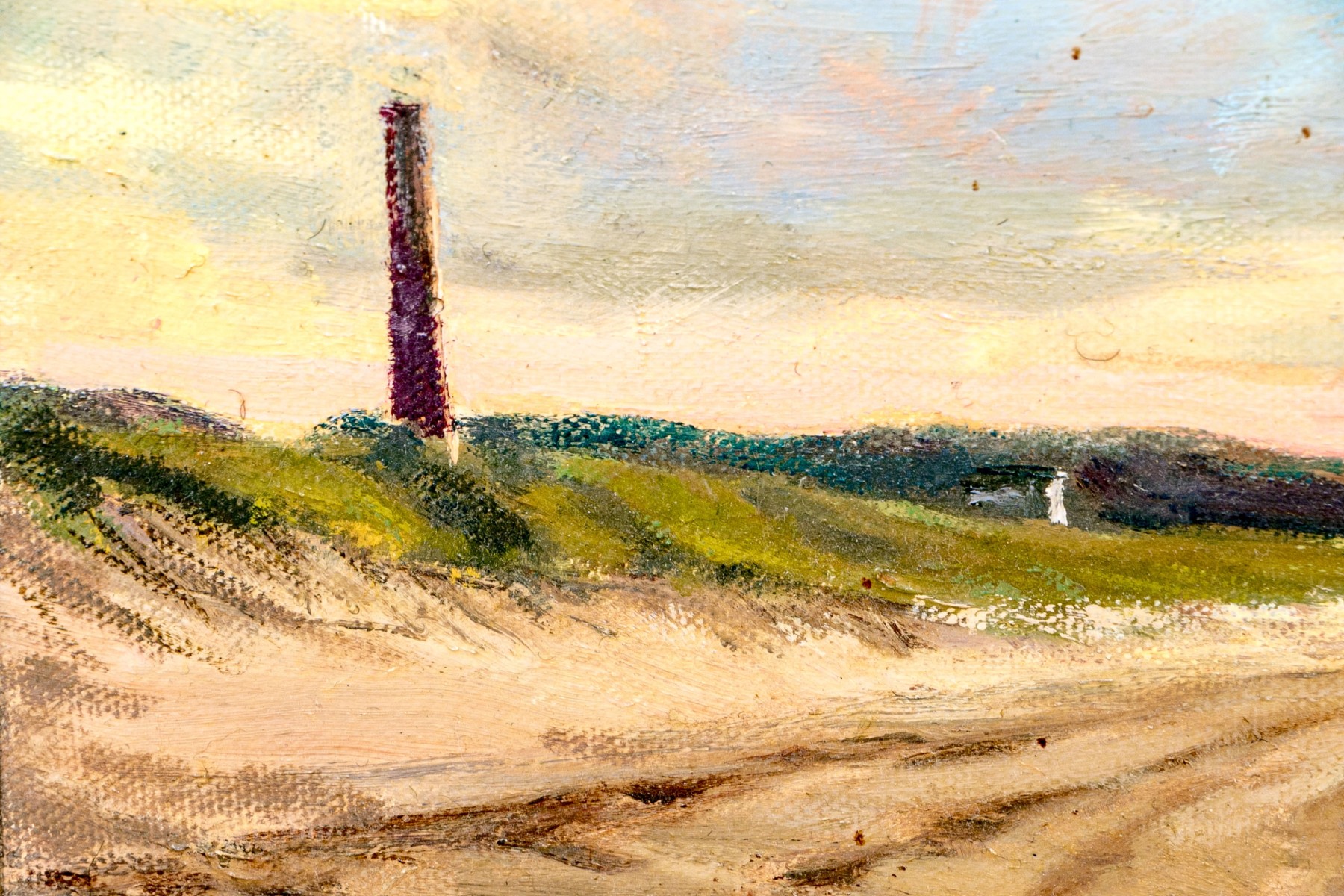 Depicting a coastal beach scene with lighthouse off in the distance.