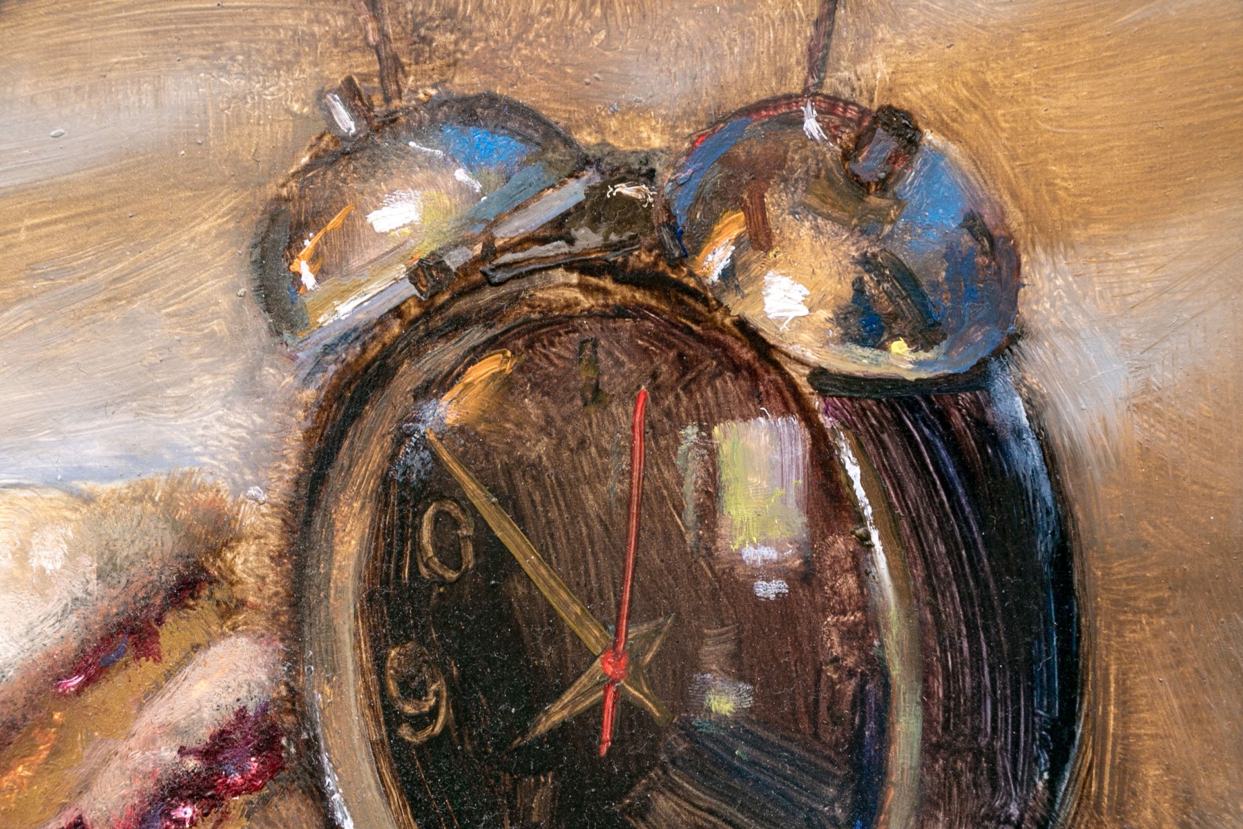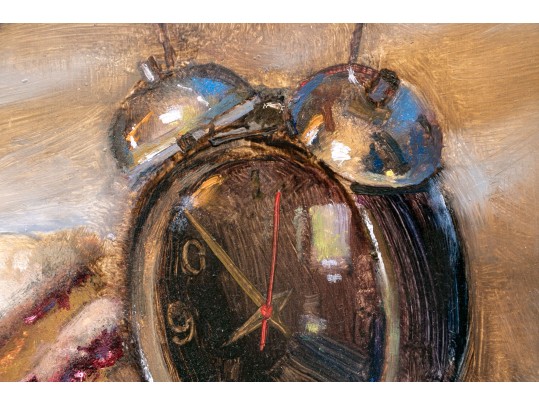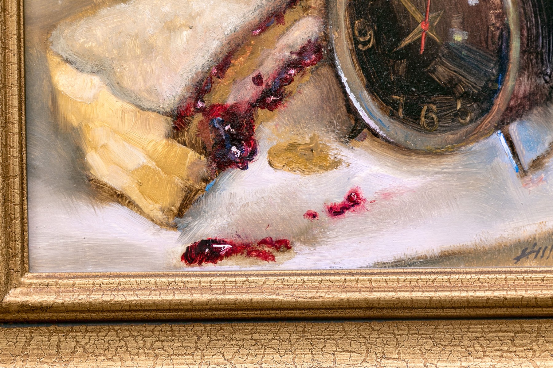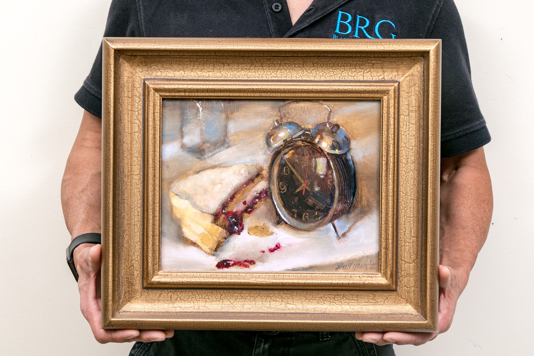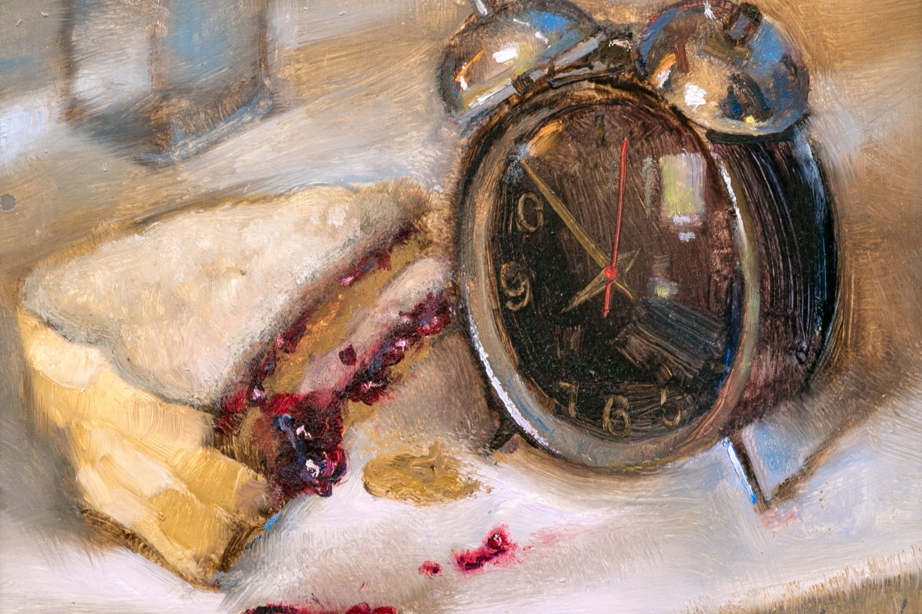A playful still life painting depicting as the title denotes, an alarm clock, with a peanut butter and jelly sandwich on a table. The artist fabulously paints the messy pbj with spots of peanut butter and jelly on the table.