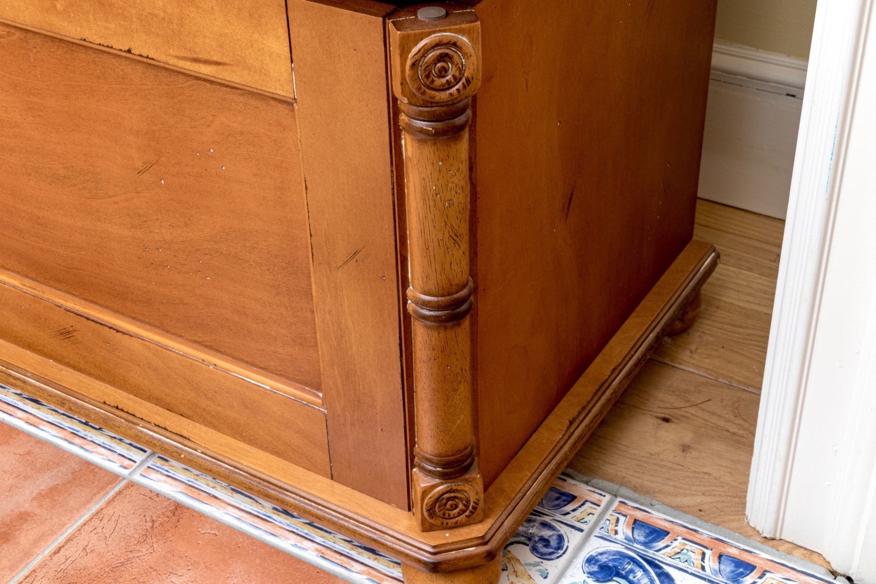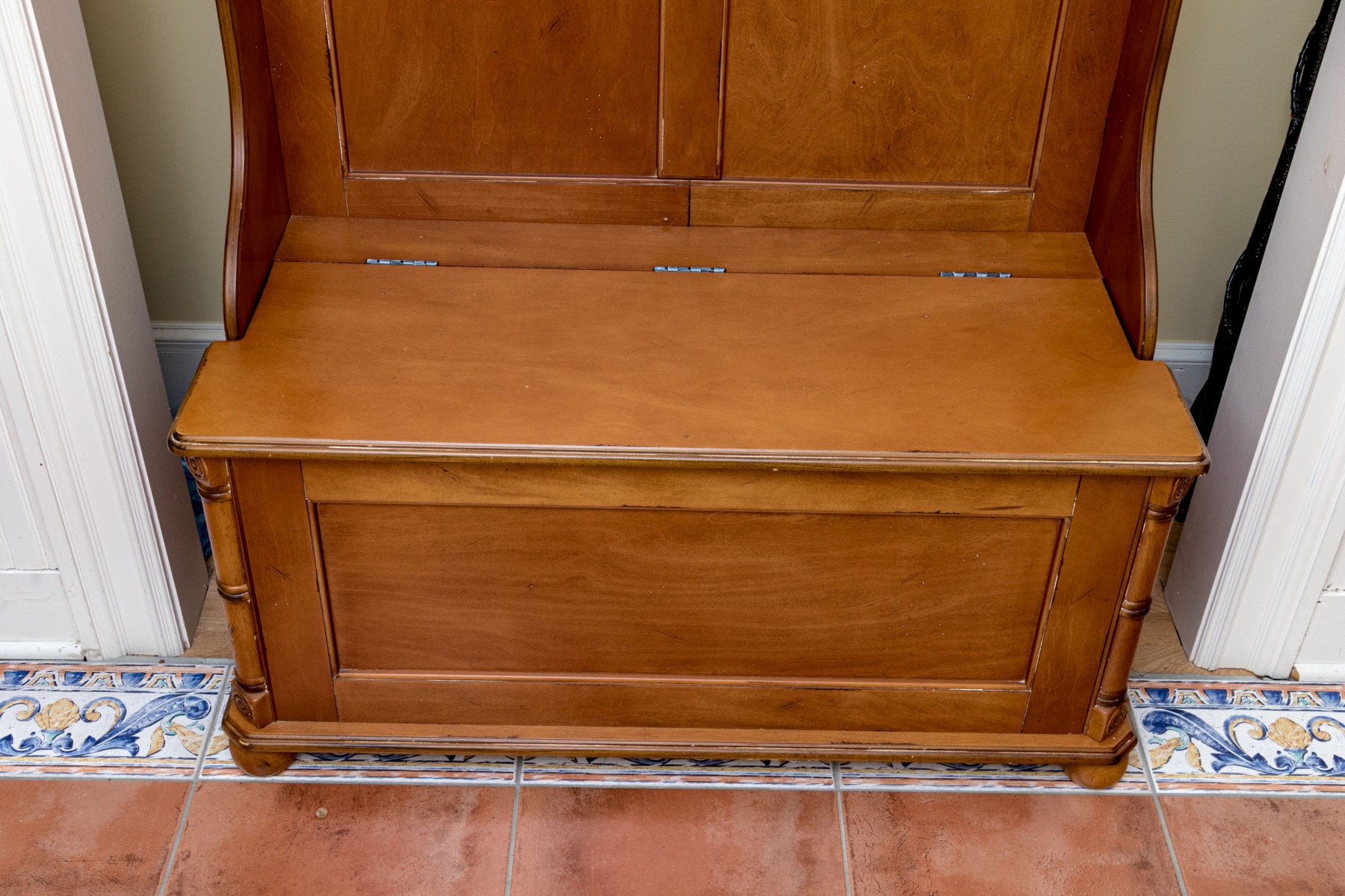 A wondering and high quality hall tree in a traditional design, well crafted in honeyed brown wood with a rectangular mirror at the top of five coat hooks along a tall, two-paneled back. The back leads down to a storage bench chest with a hinged lid, detailed with banded cylindrical columnar posts at the sides and raised on bun feet.
