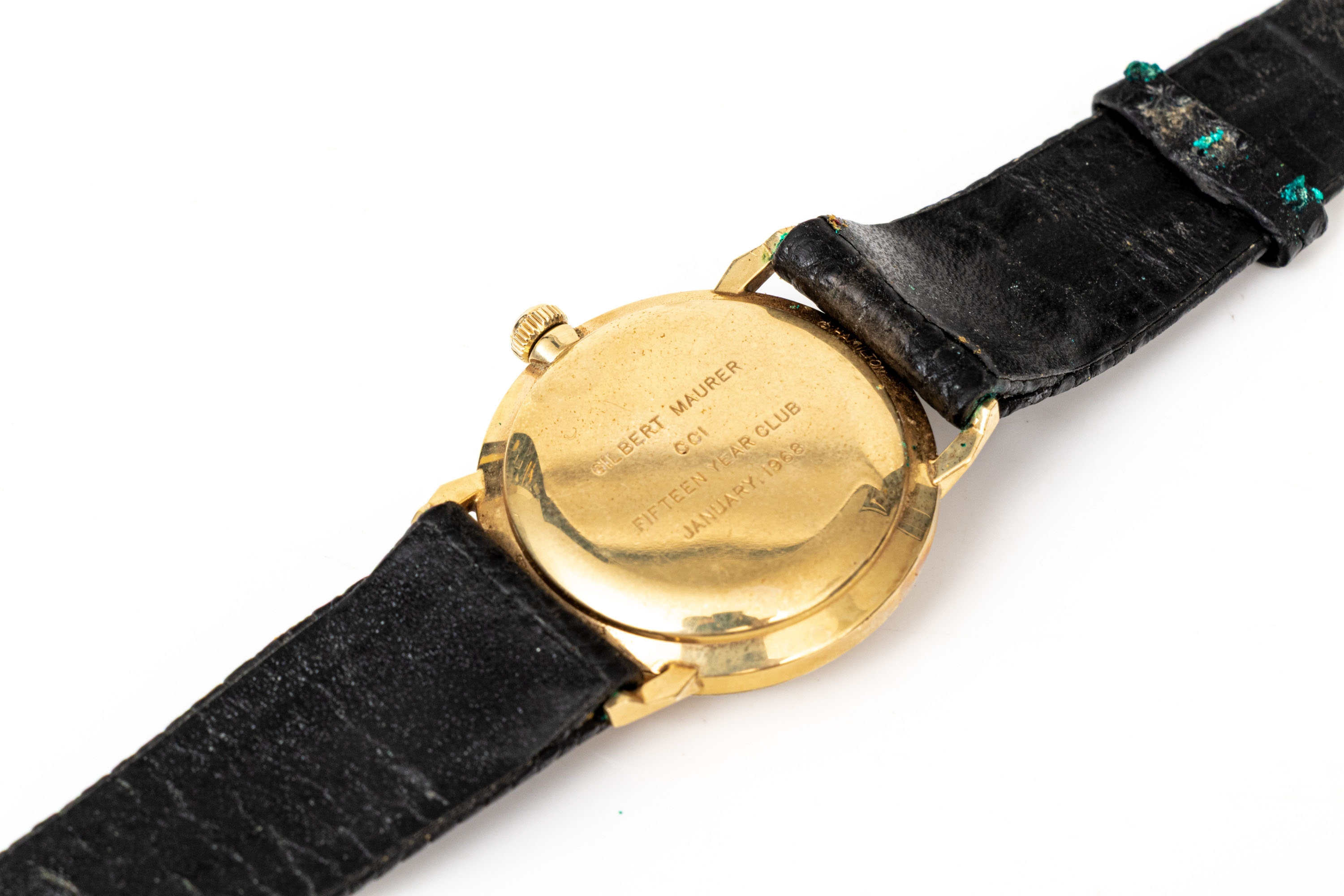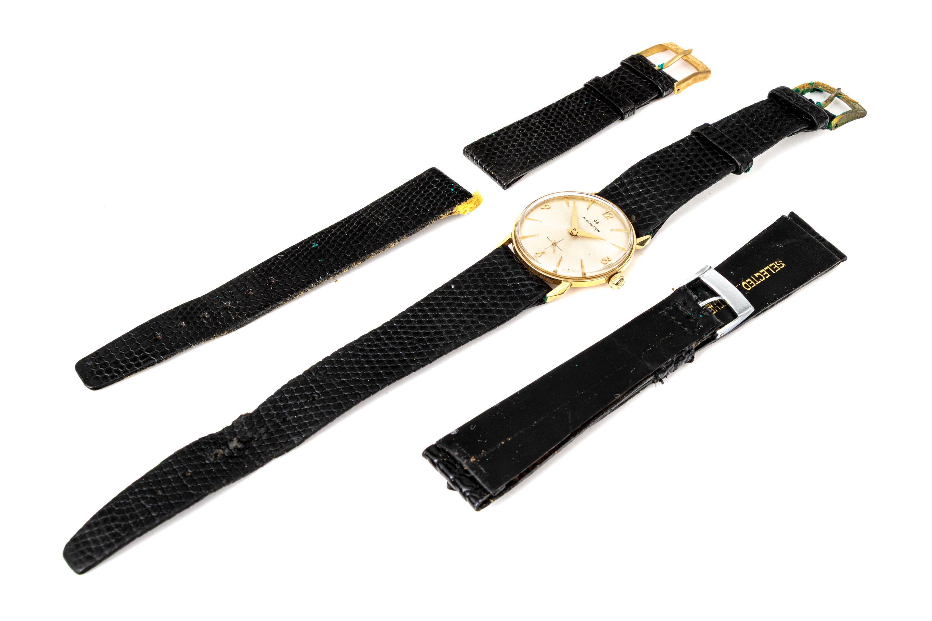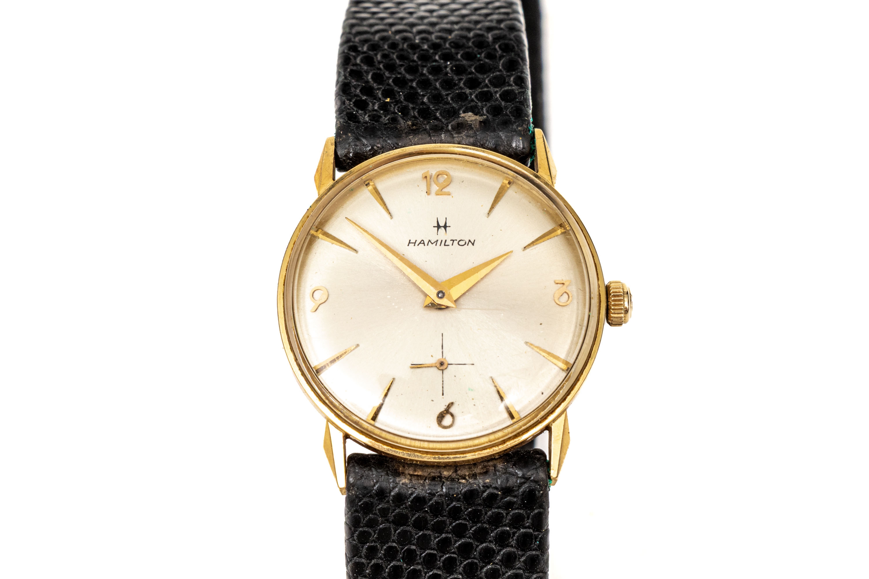 Hamilton 14k yellow gold vintage 30mm mechanical strap watch, silvered dial with arrow and Arabic markers, subdial at 6pm. Extra straps enclosed, worn