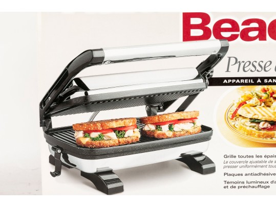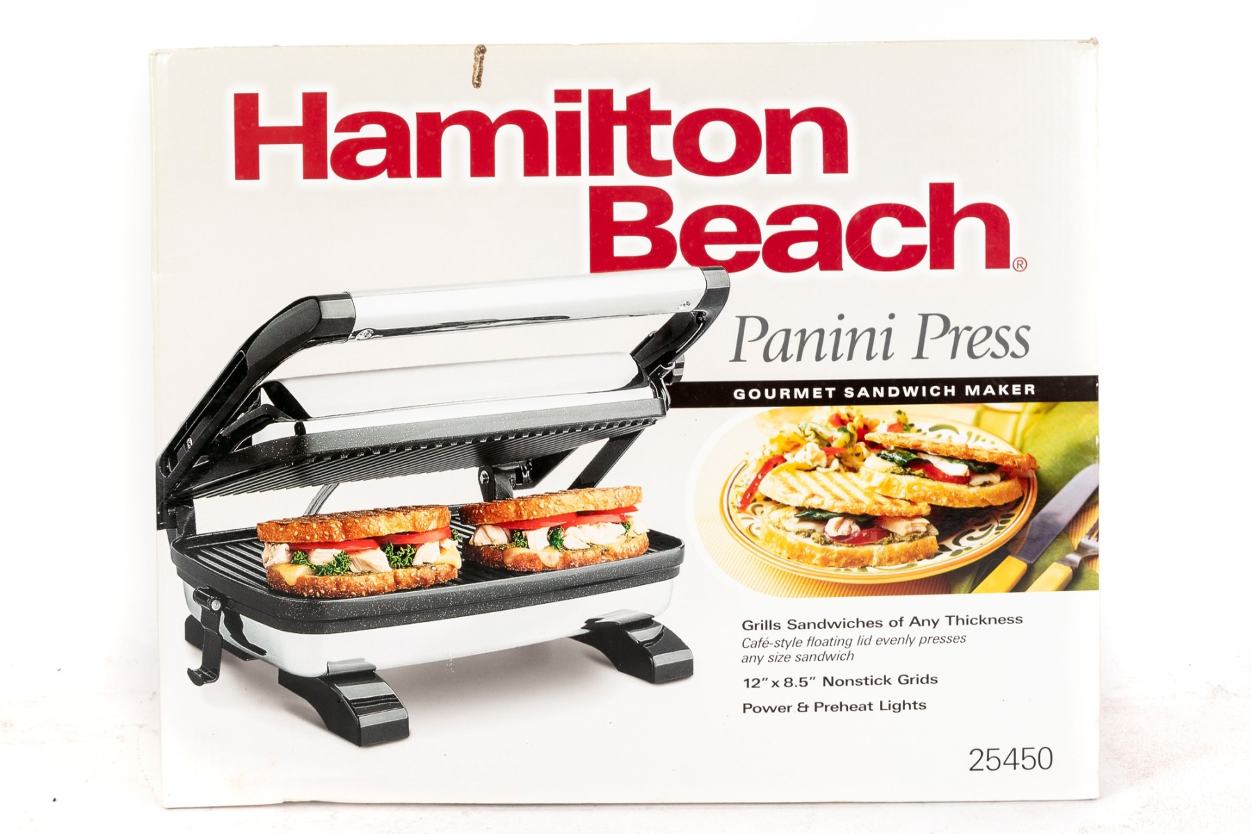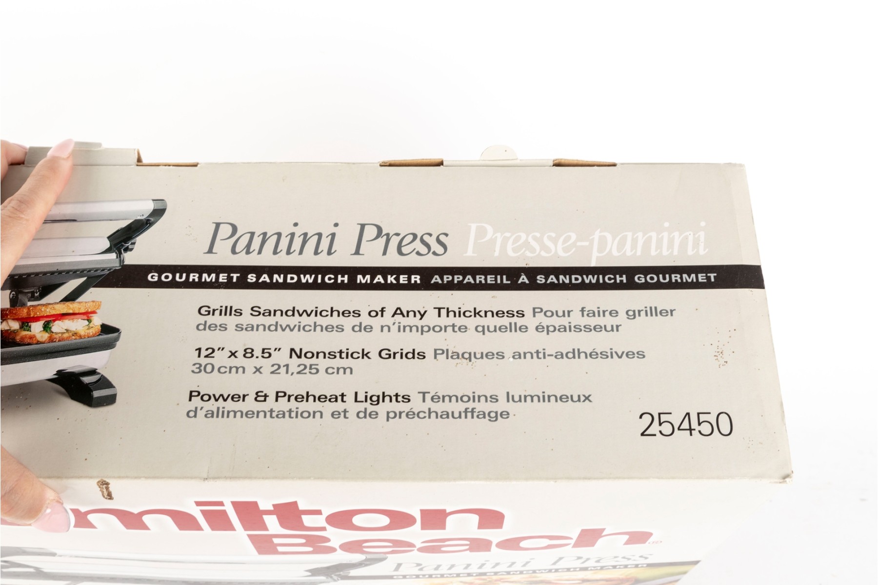 The Hamilton Beach grooved Panini Press is perfect for grilling up your favorite sandwiches of any thickness. The non stick 12" x 8.5" grid makes removing the food simple and easy. New in box