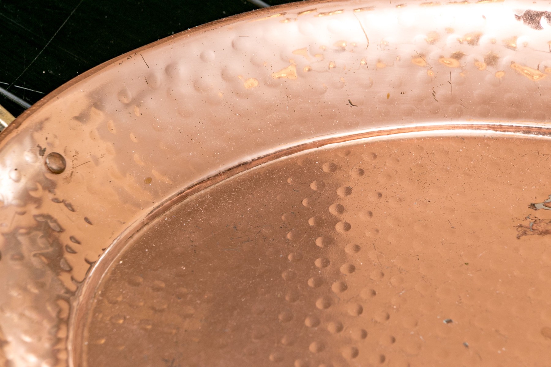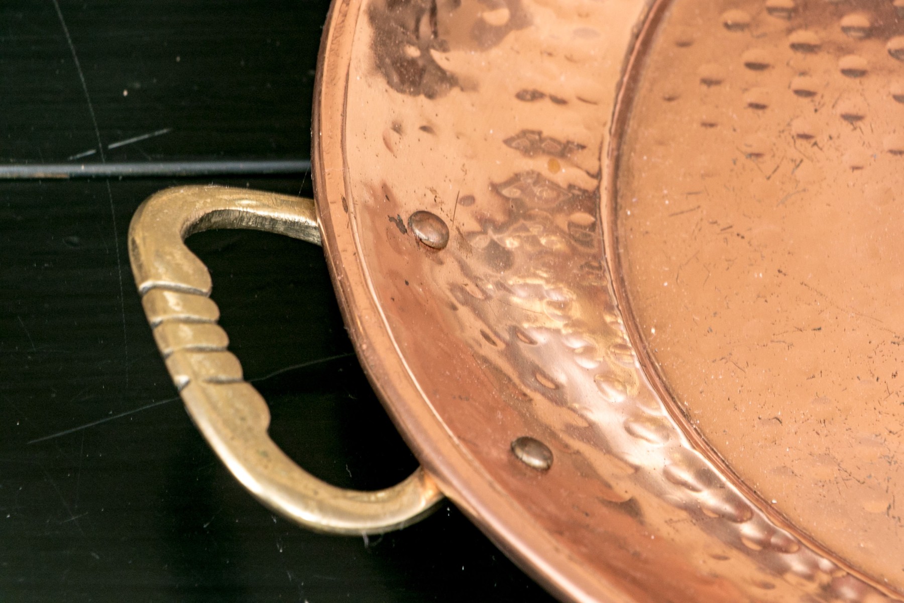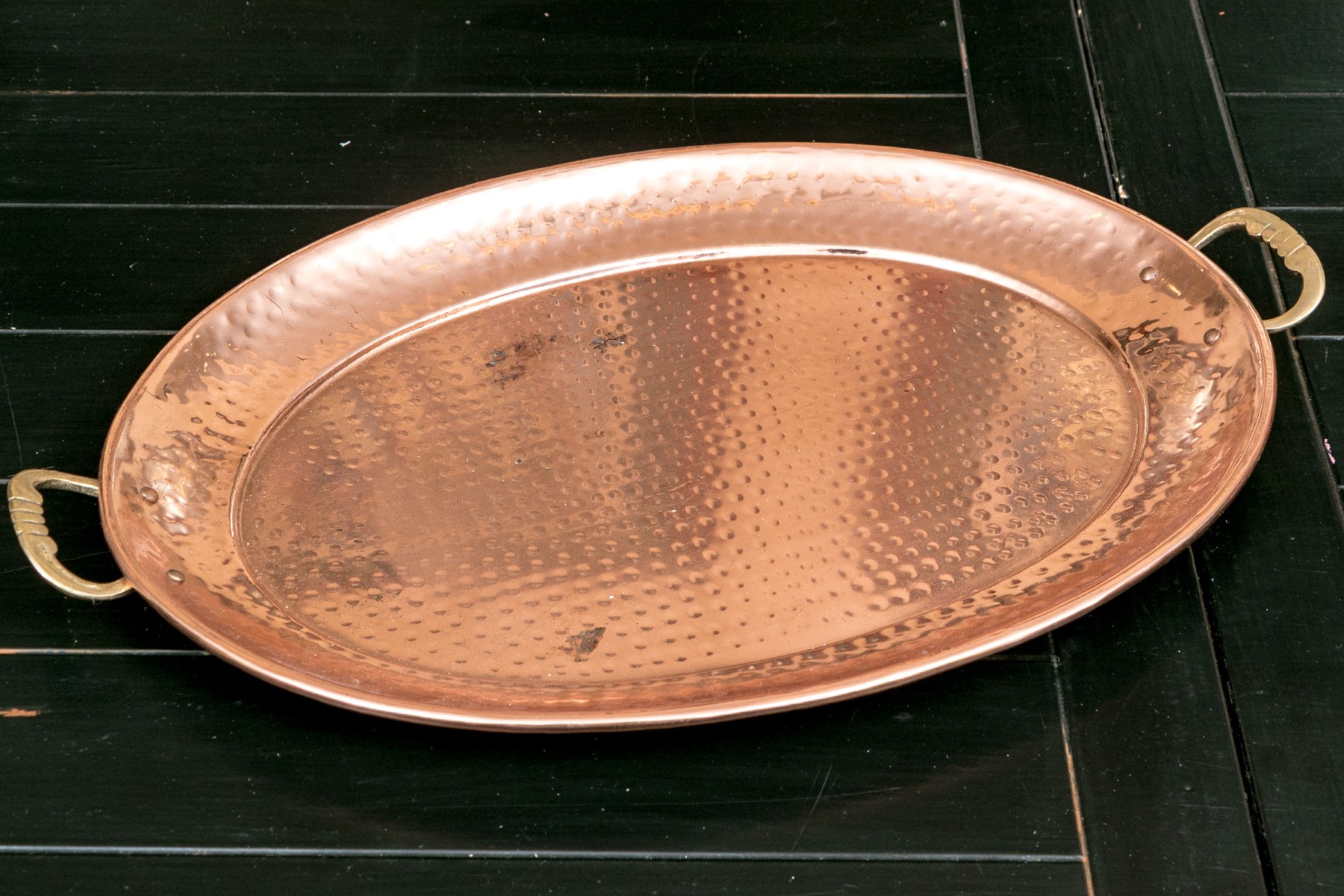Made in India by ODI. A deep oval hammered copper tray with twin brass handles.