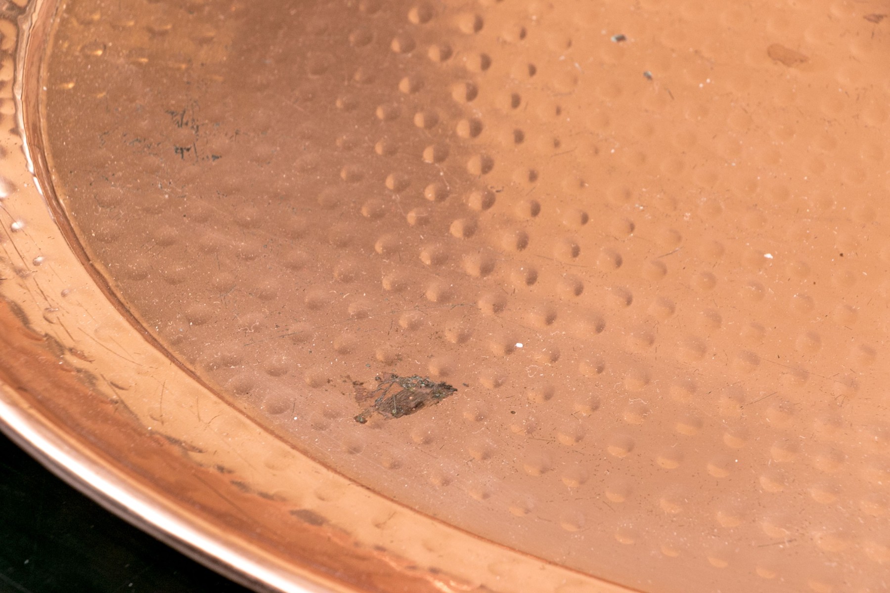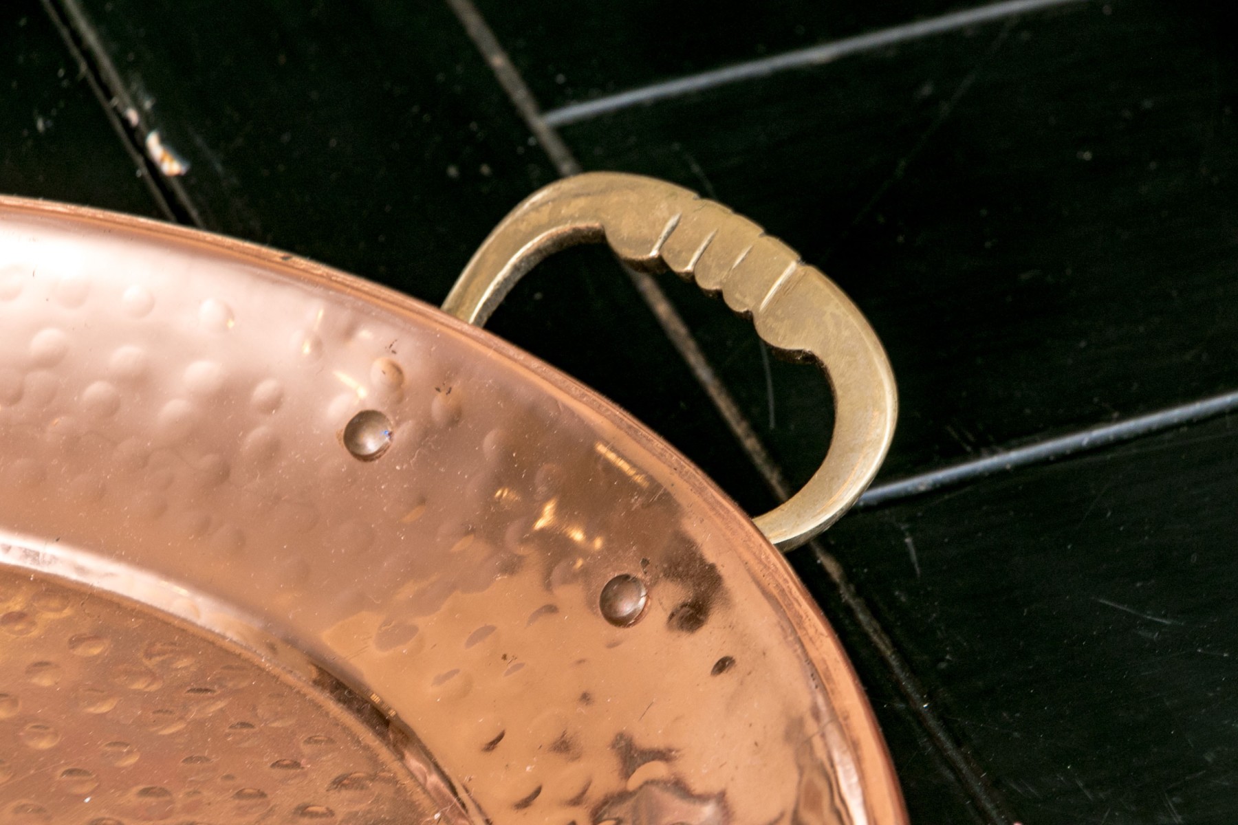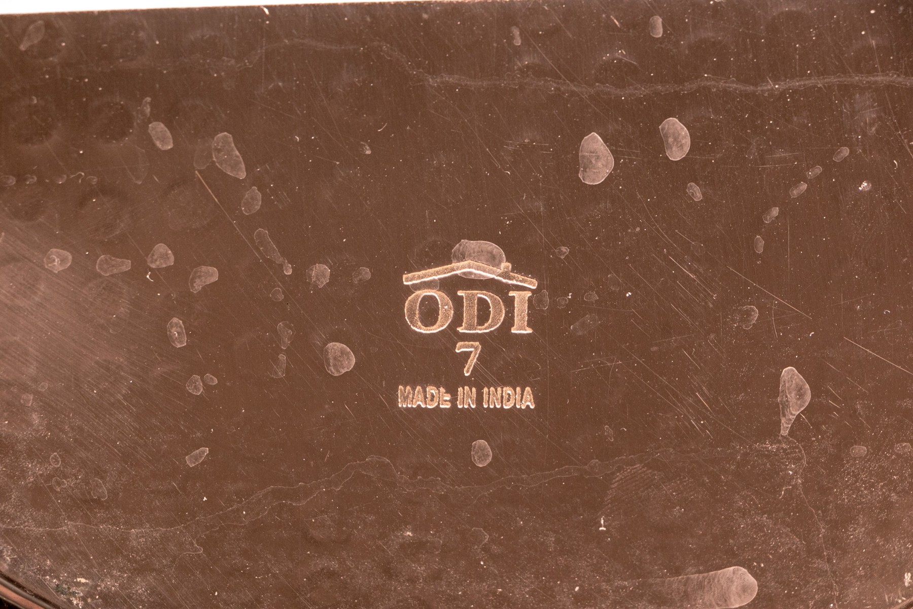 Made in India by ODI. A deep oval hammered copper tray with twin brass handles.