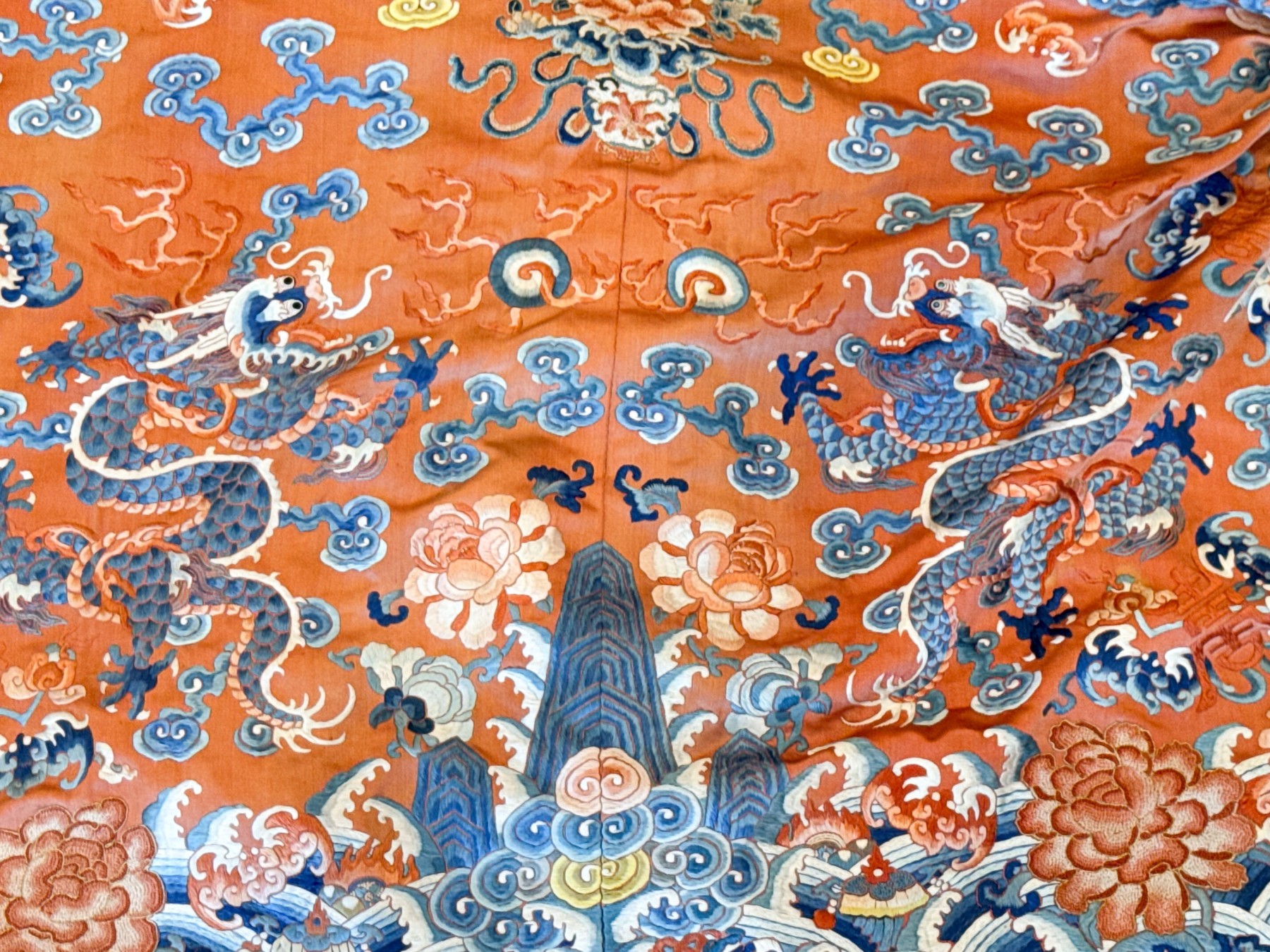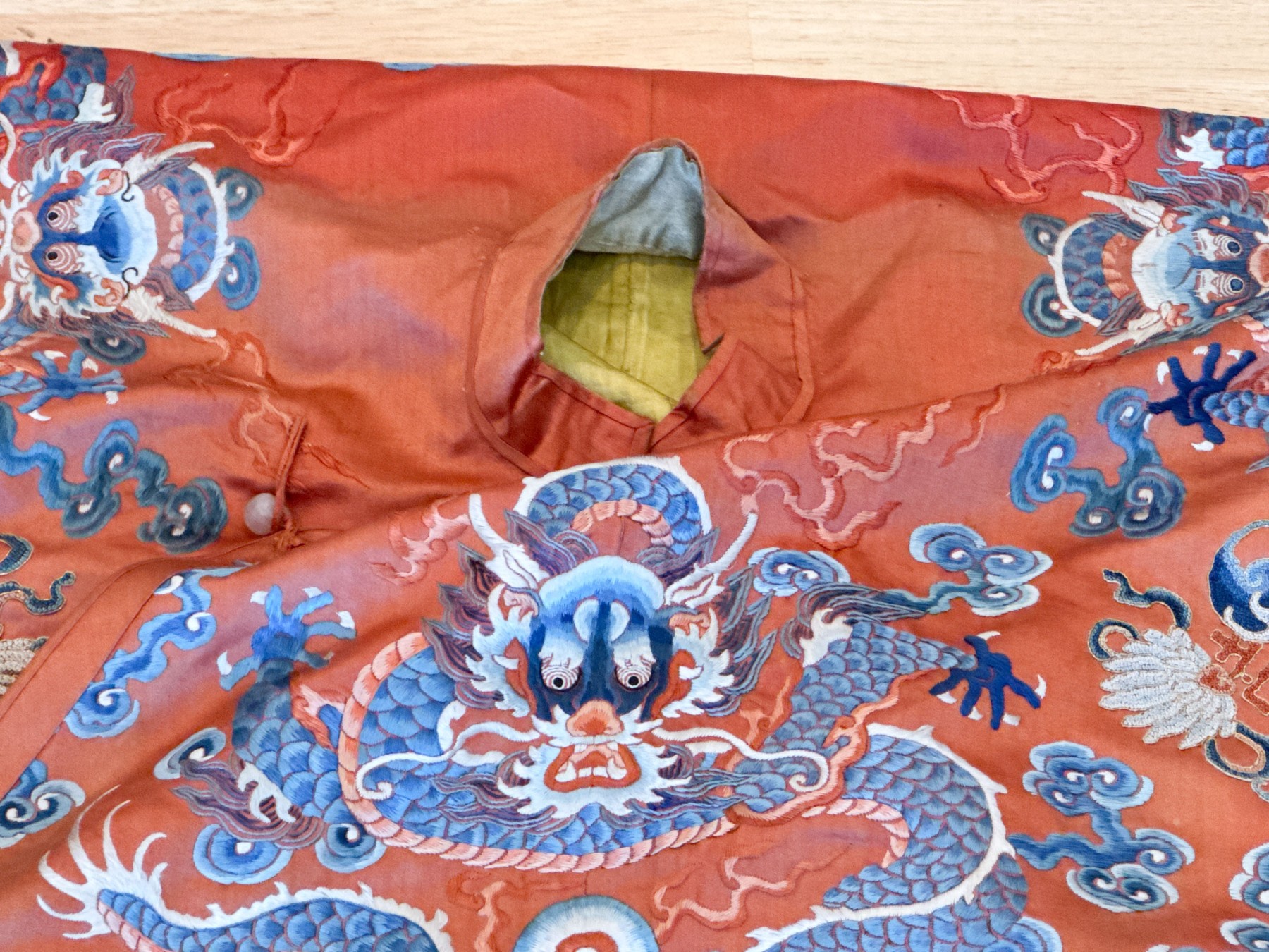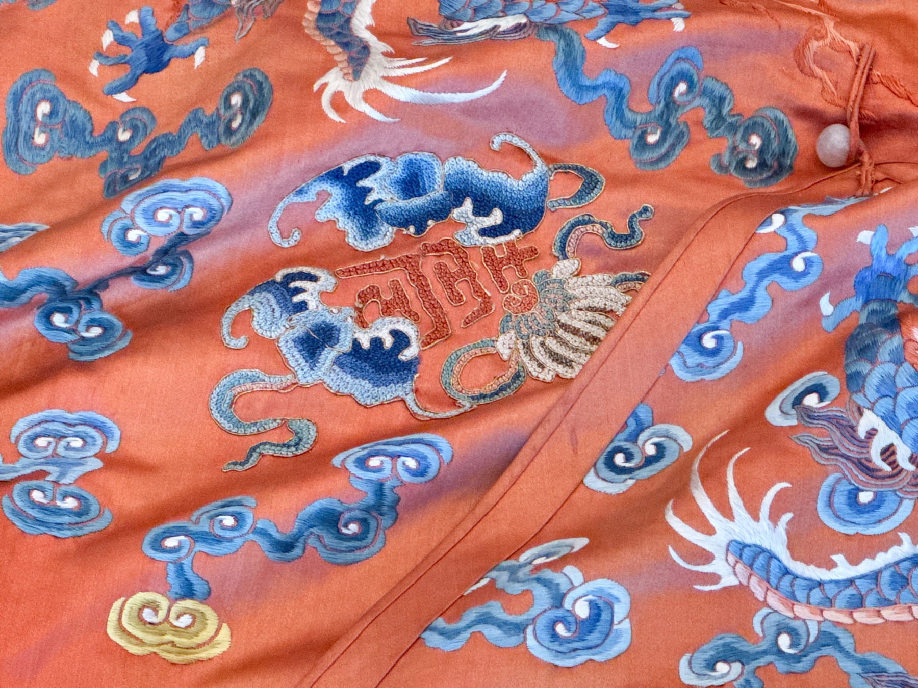 A gorgeous Han Chinese mang ao circa 1870. Beautifully made with high quality and keen attention to detail, the robe is expertly embroidered with ten dragons chasing the pearl of wisdom and truth surrounded by clouds, bats, and multiple auspicious emblems over crashing waves.