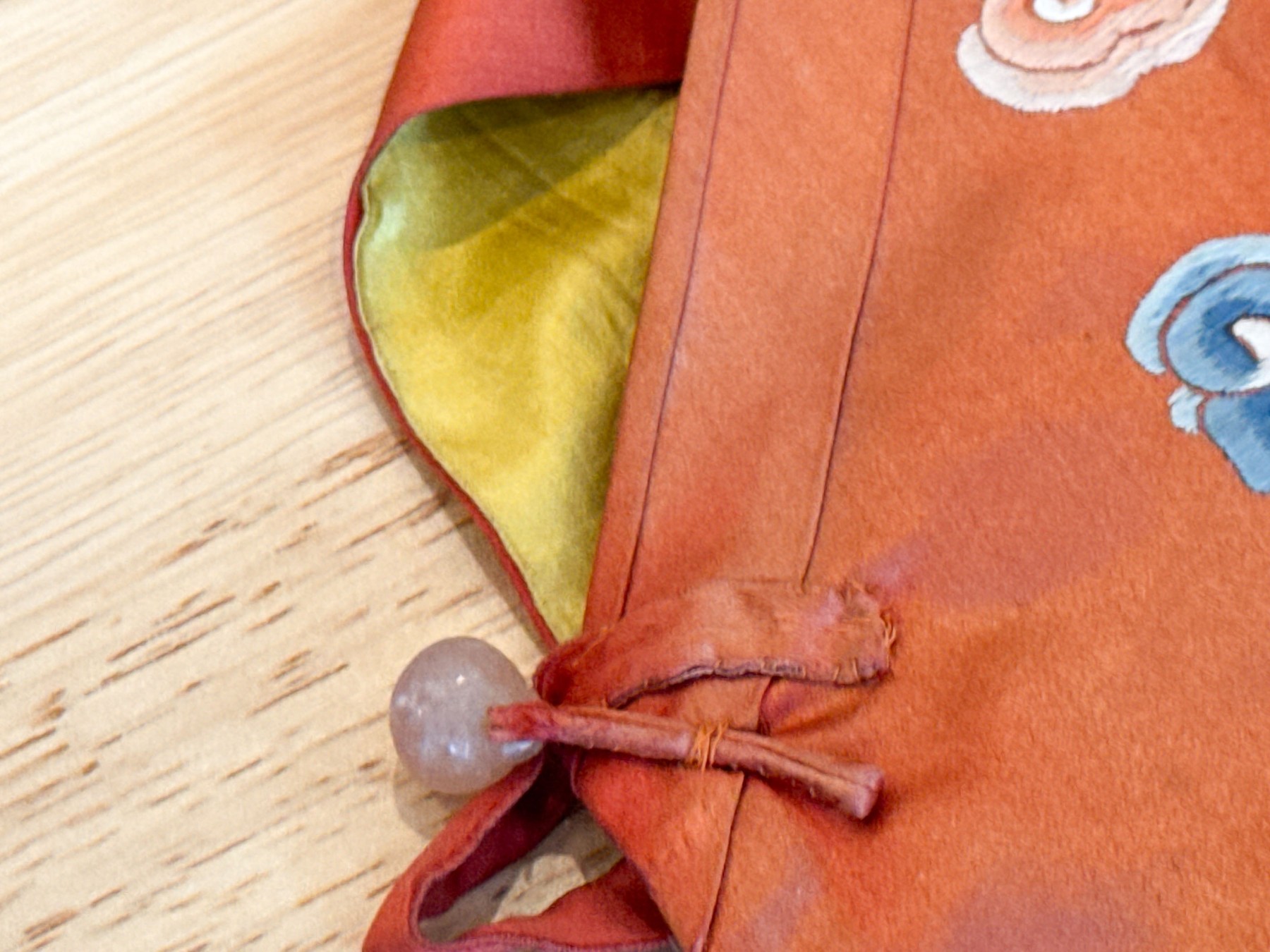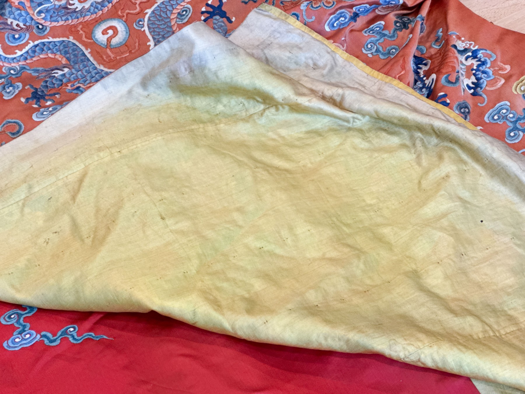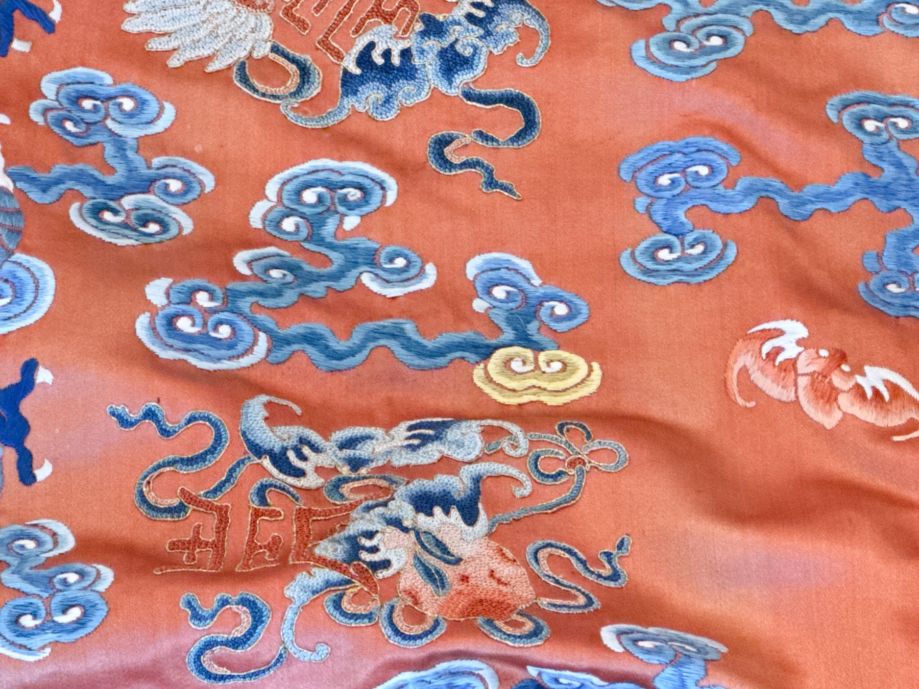 A gorgeous Han Chinese mang ao circa 1870. Beautifully made with high quality and keen attention to detail, the robe is expertly embroidered with ten dragons chasing the pearl of wisdom and truth surrounded by clouds, bats, and multiple auspicious emblems over crashing waves.