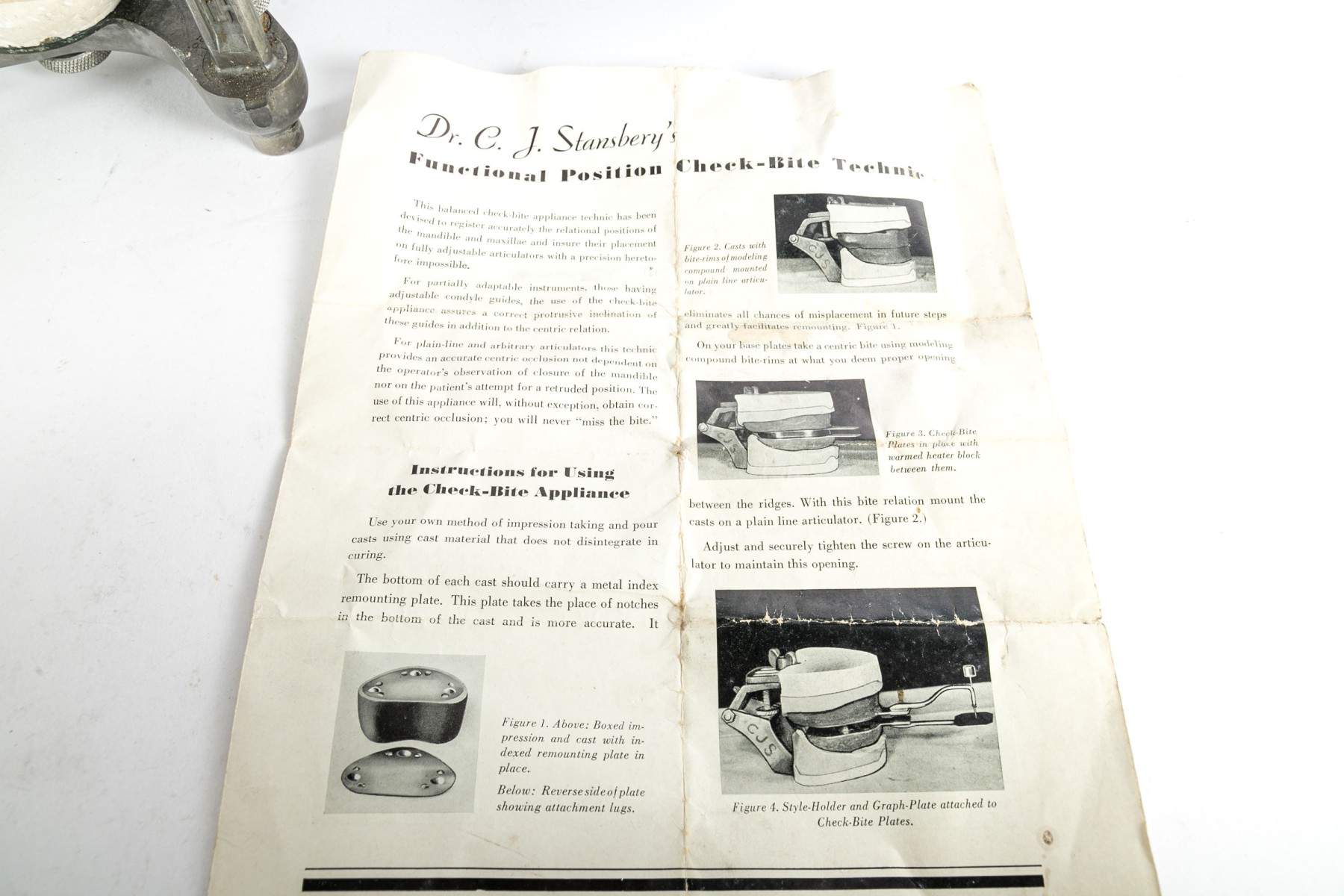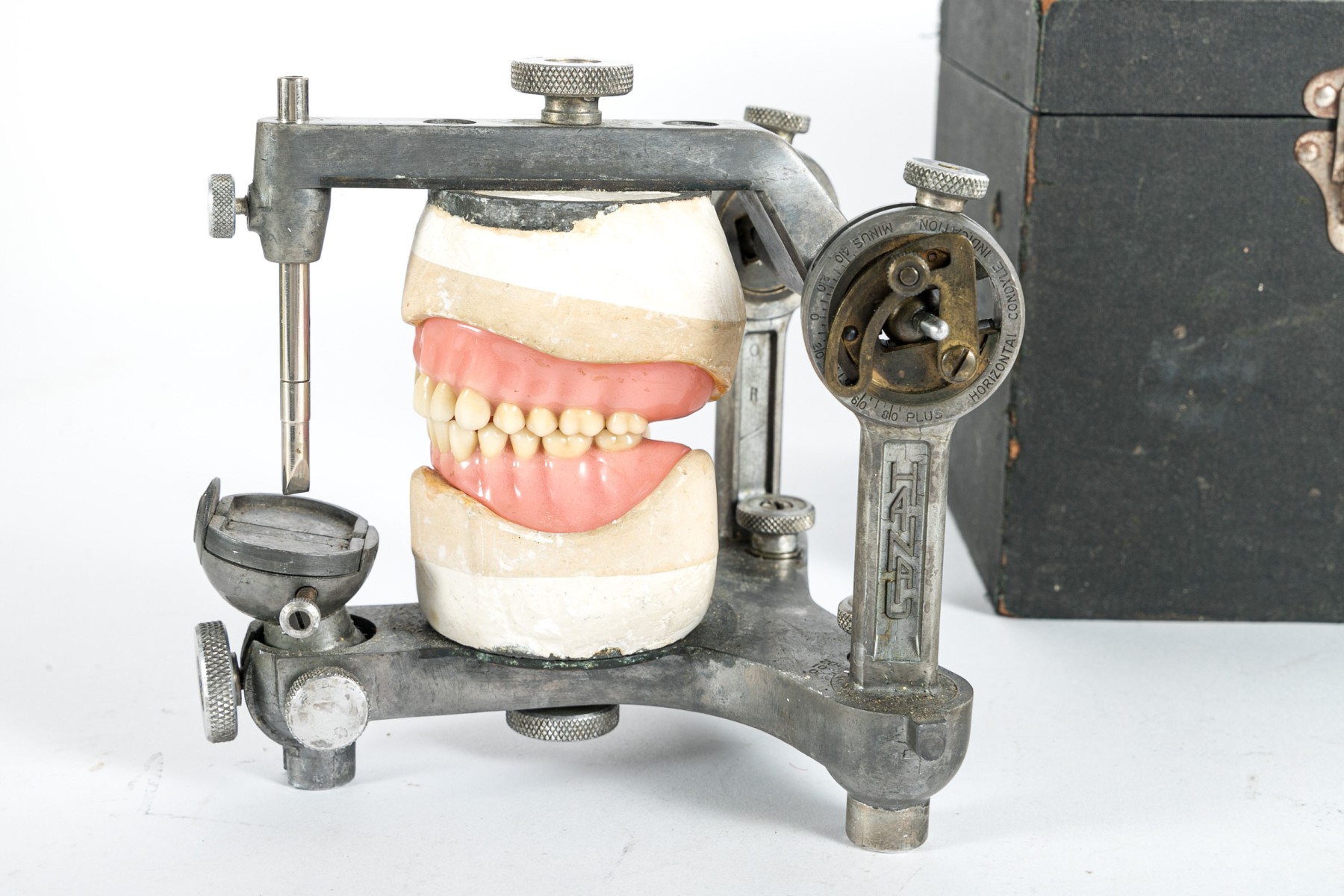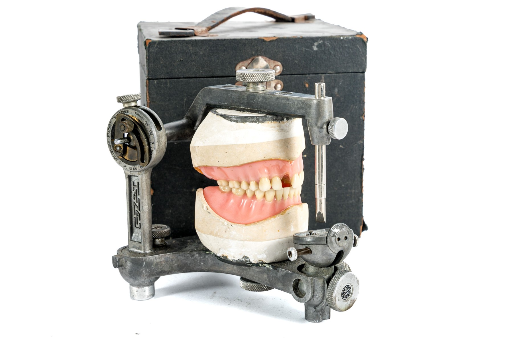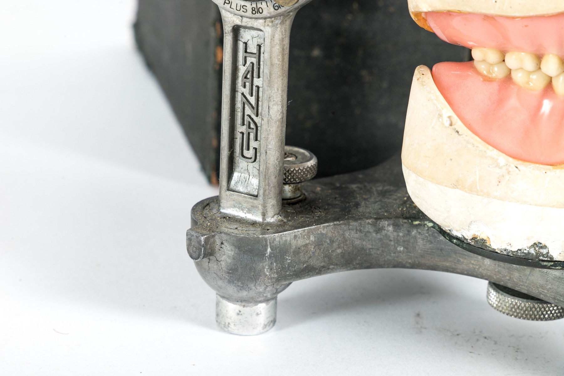 A vintage Hanau dental articular fit with plaster and removable dentures. Includes a case with a few accessories within, including some paper pamphlets for Hanau split re-mounting plates and "Dr. C.J. Stansbery's functional position check-bite technic."