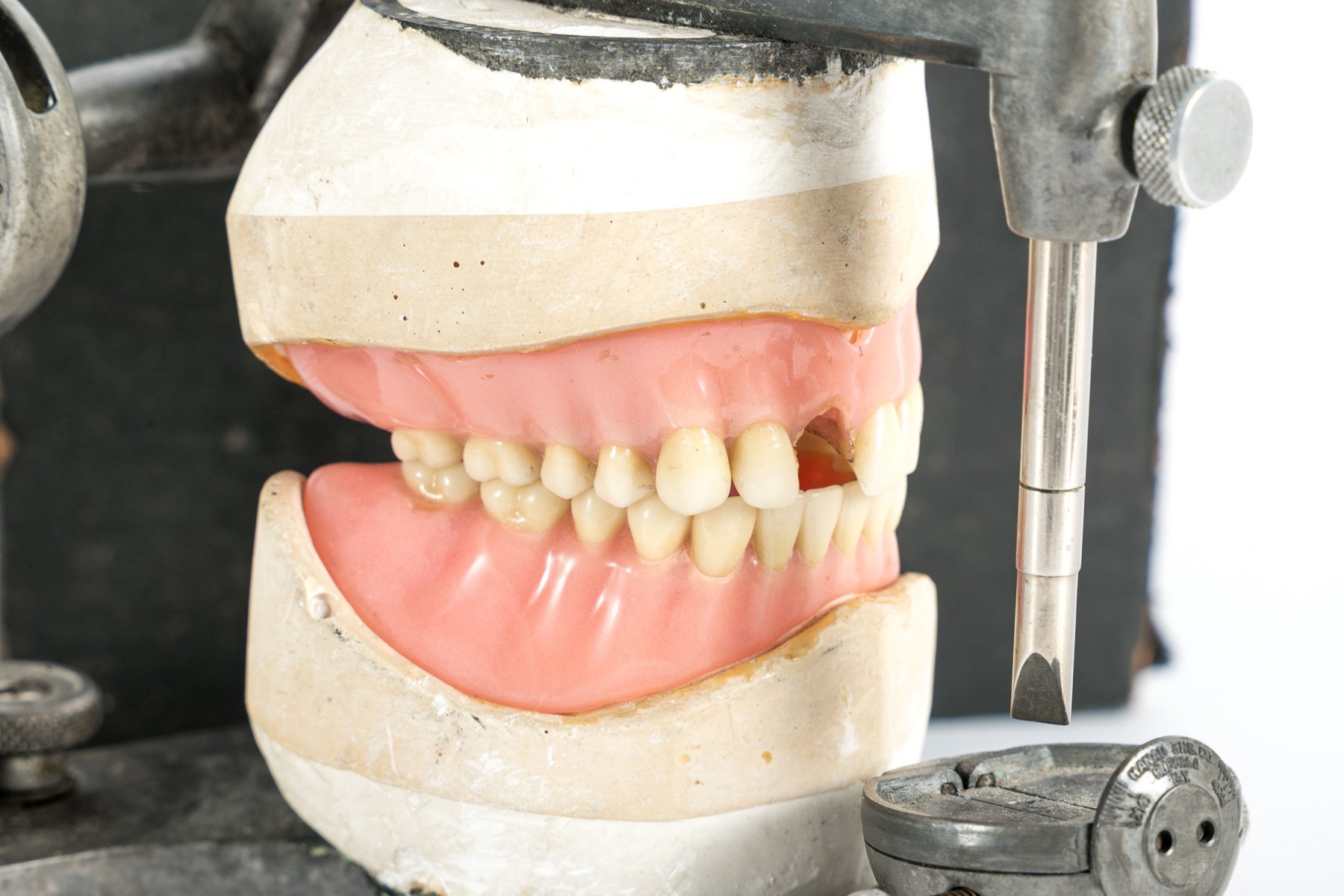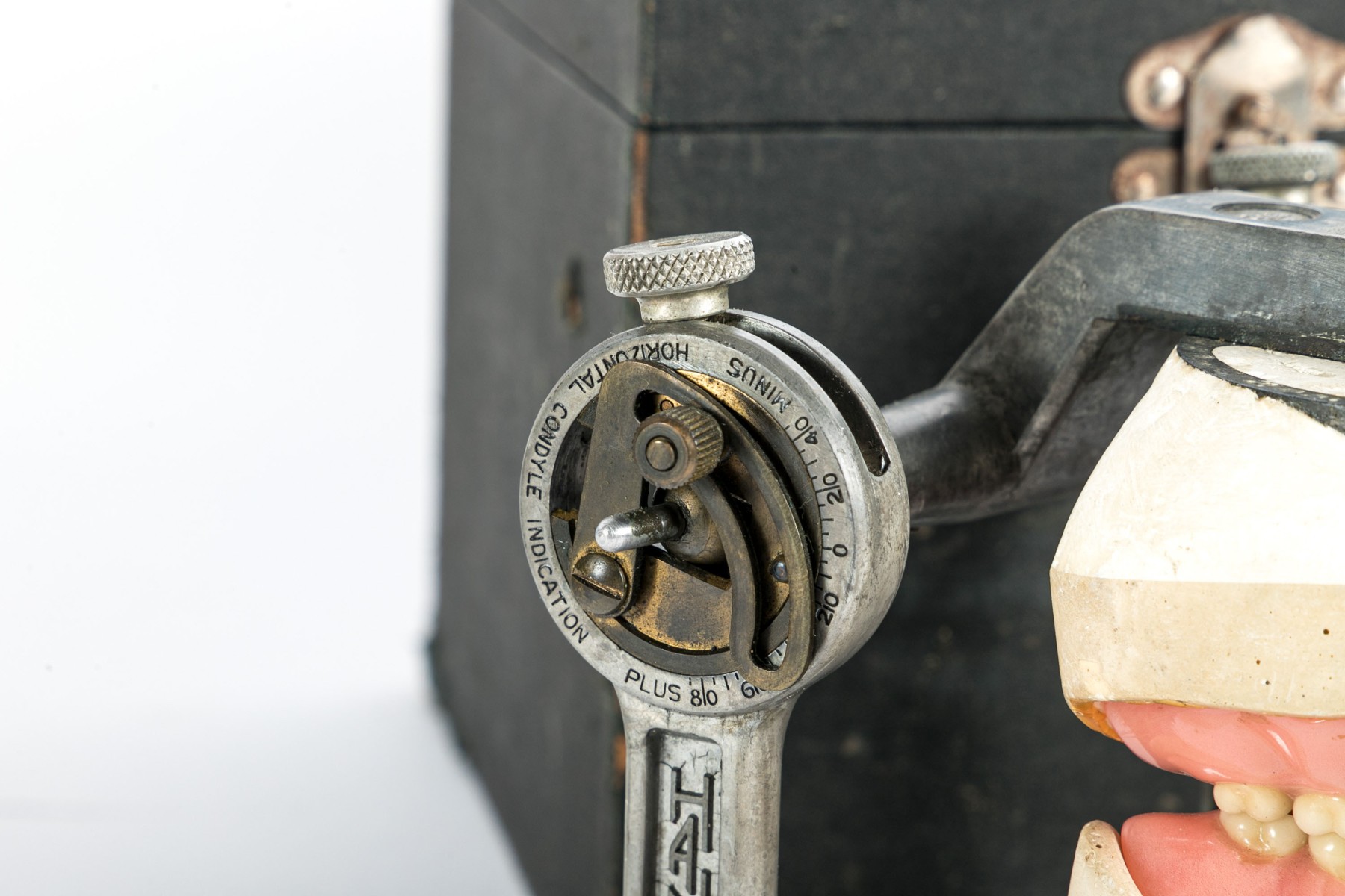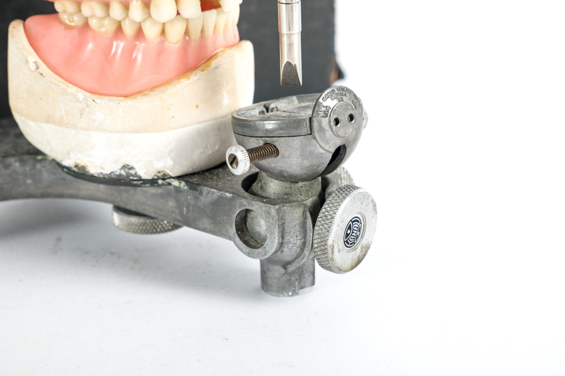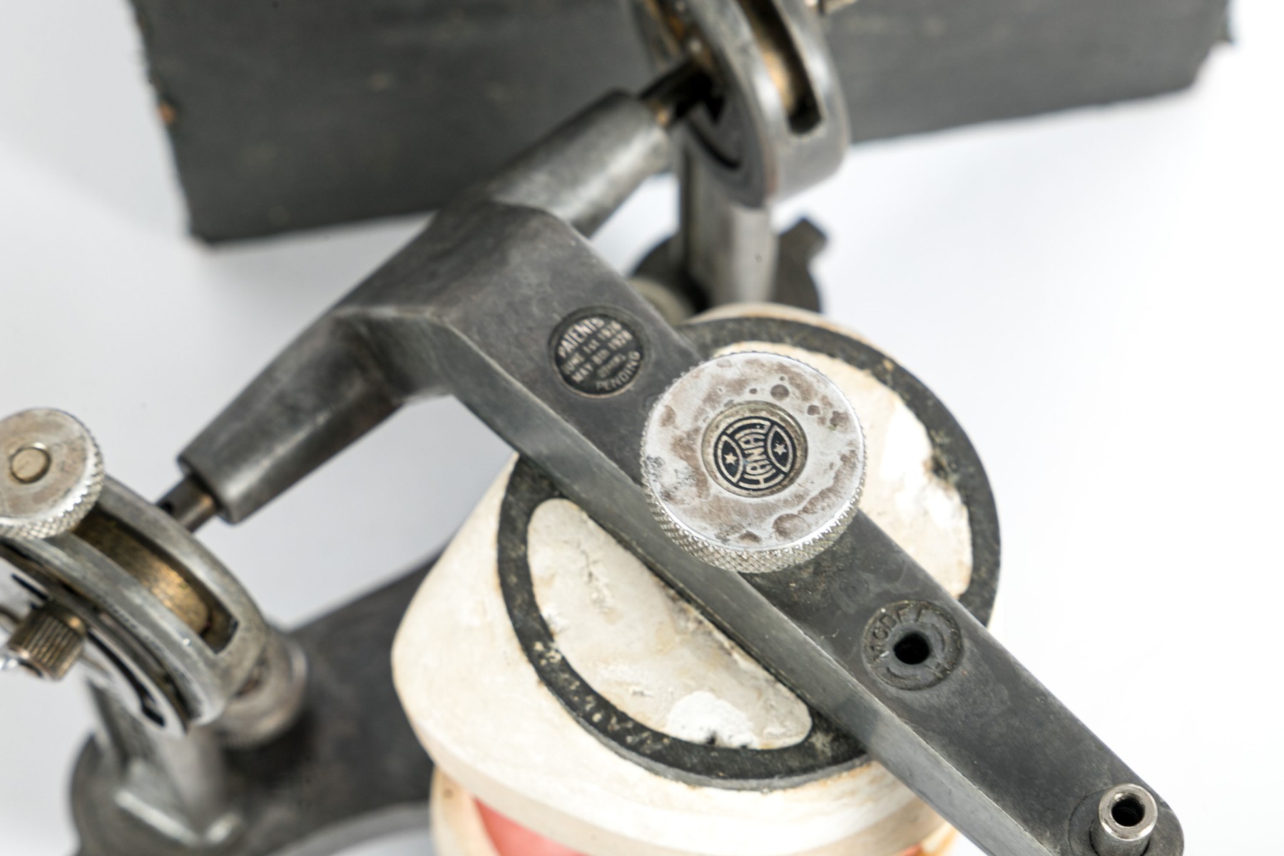 A vintage Hanau dental articular fit with plaster and removable dentures. Includes a case with a few accessories within, including some paper pamphlets for Hanau split re-mounting plates and "Dr. C.J. Stansbery's functional position check-bite technic."