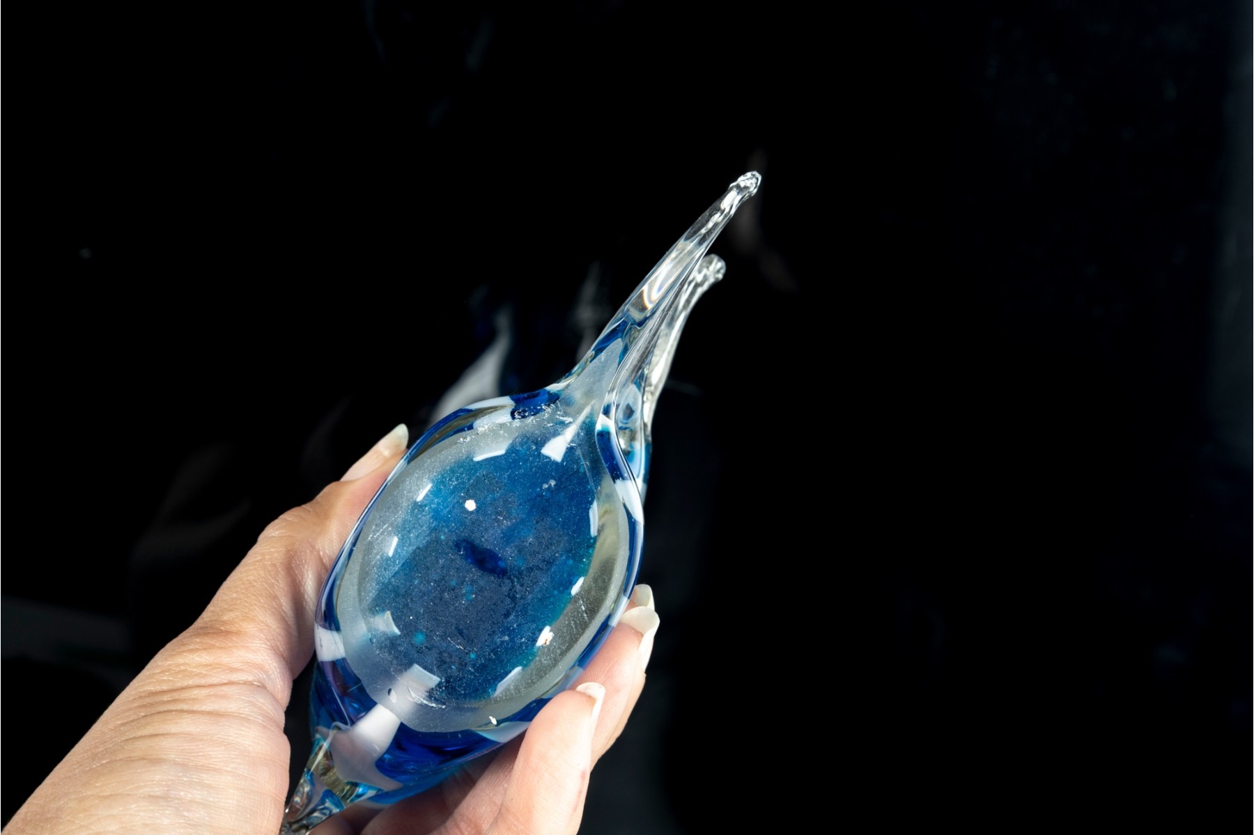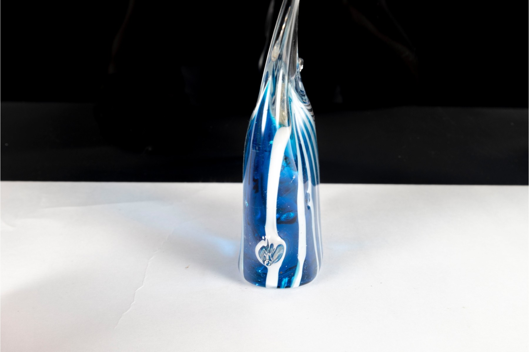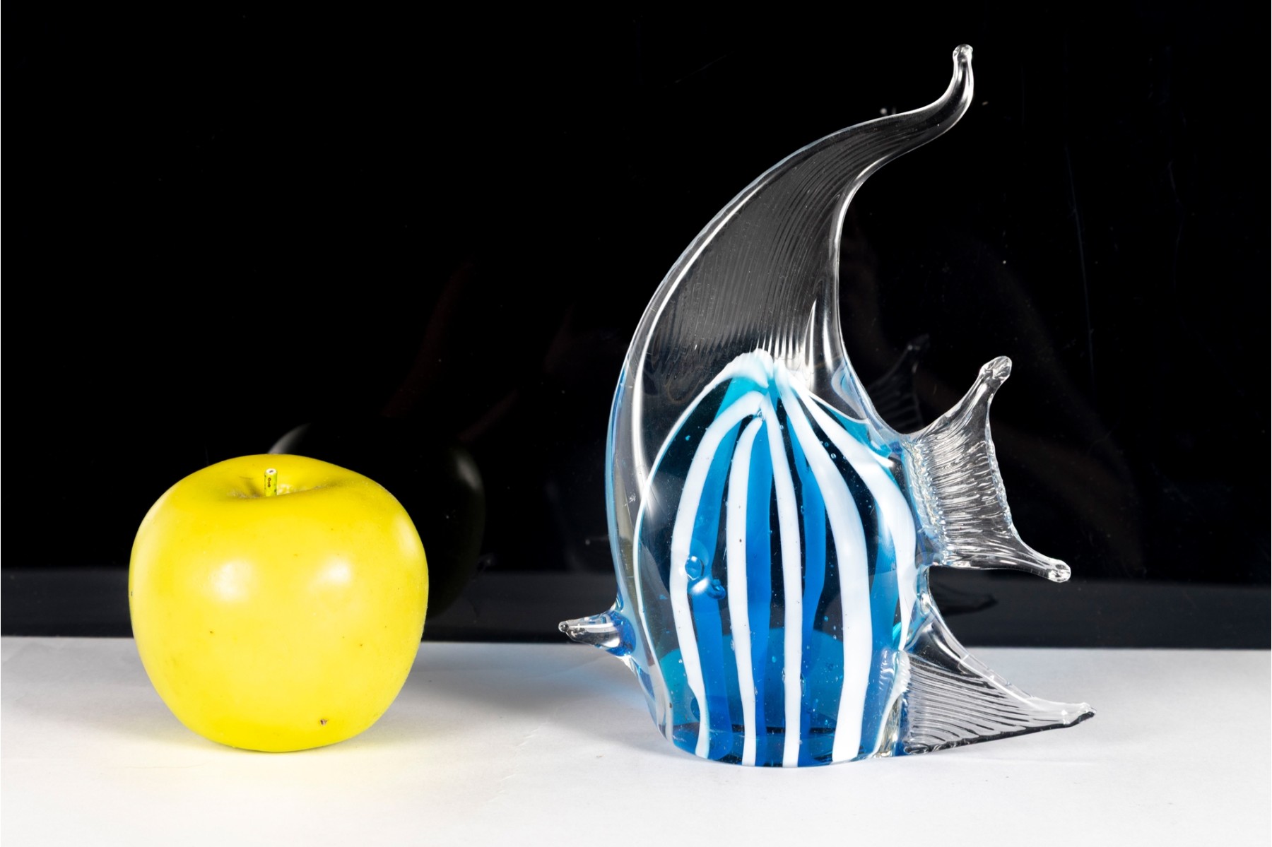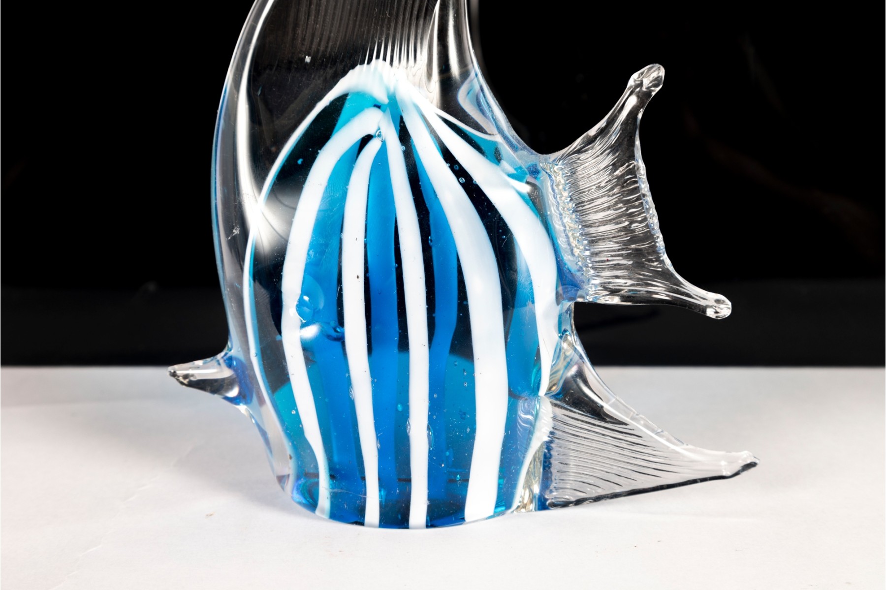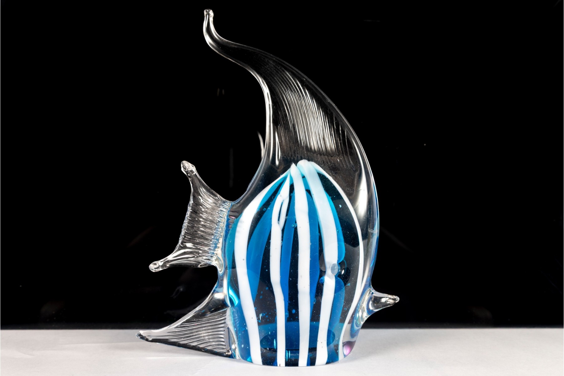 A fantastic example of artistic glassware — this hand-blown glass Angelfish sculpture features a bright and whimsical blue/white striped pattern along with textured fin details.