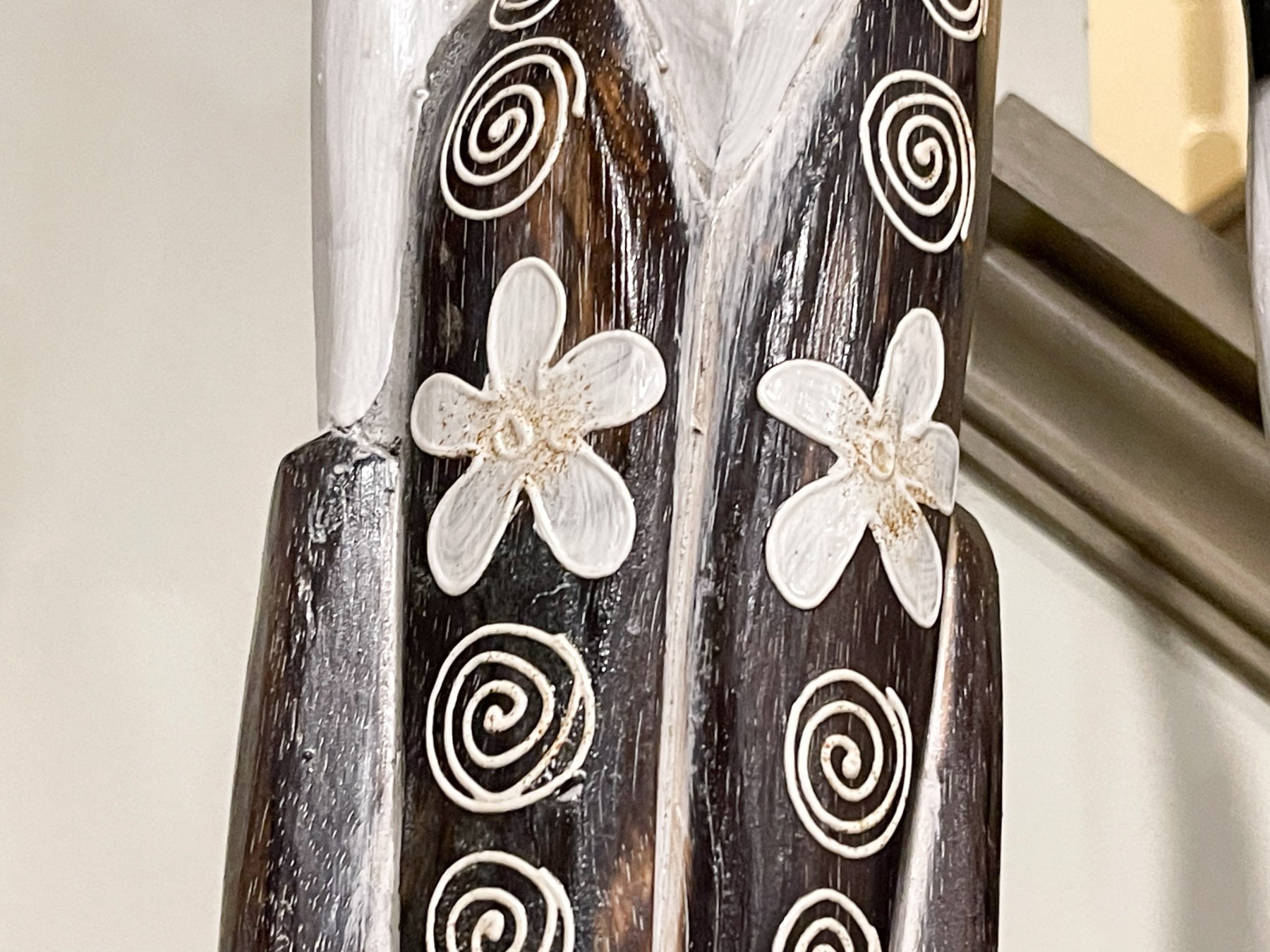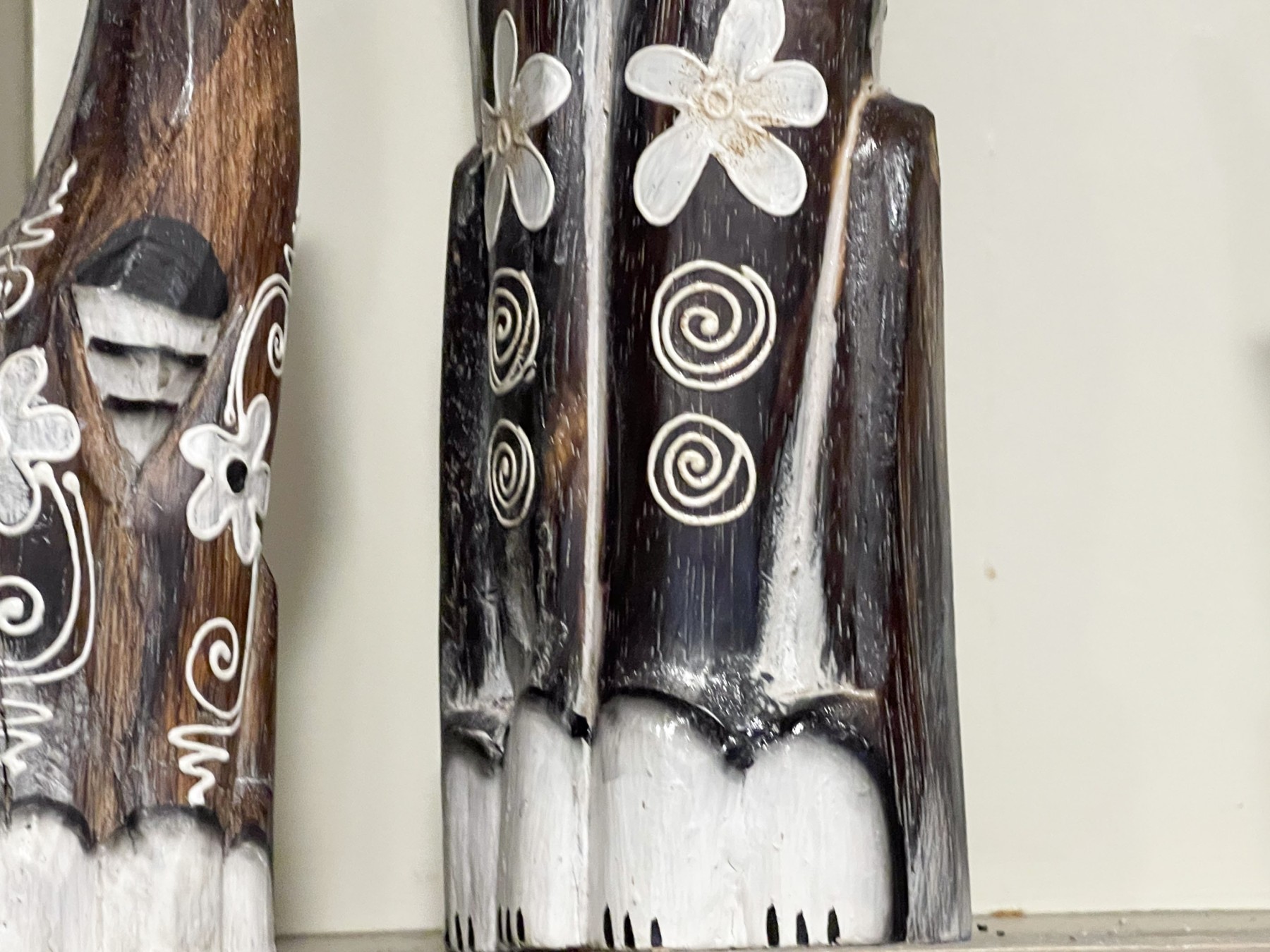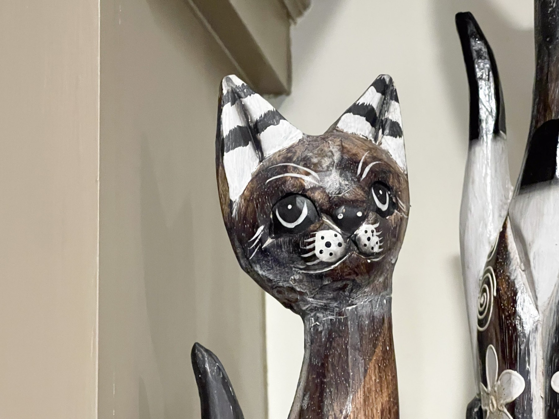 An adorable set of three cat figurines all having hand carved elements and floral painted design. A fun and whimsical set for the cat lover!