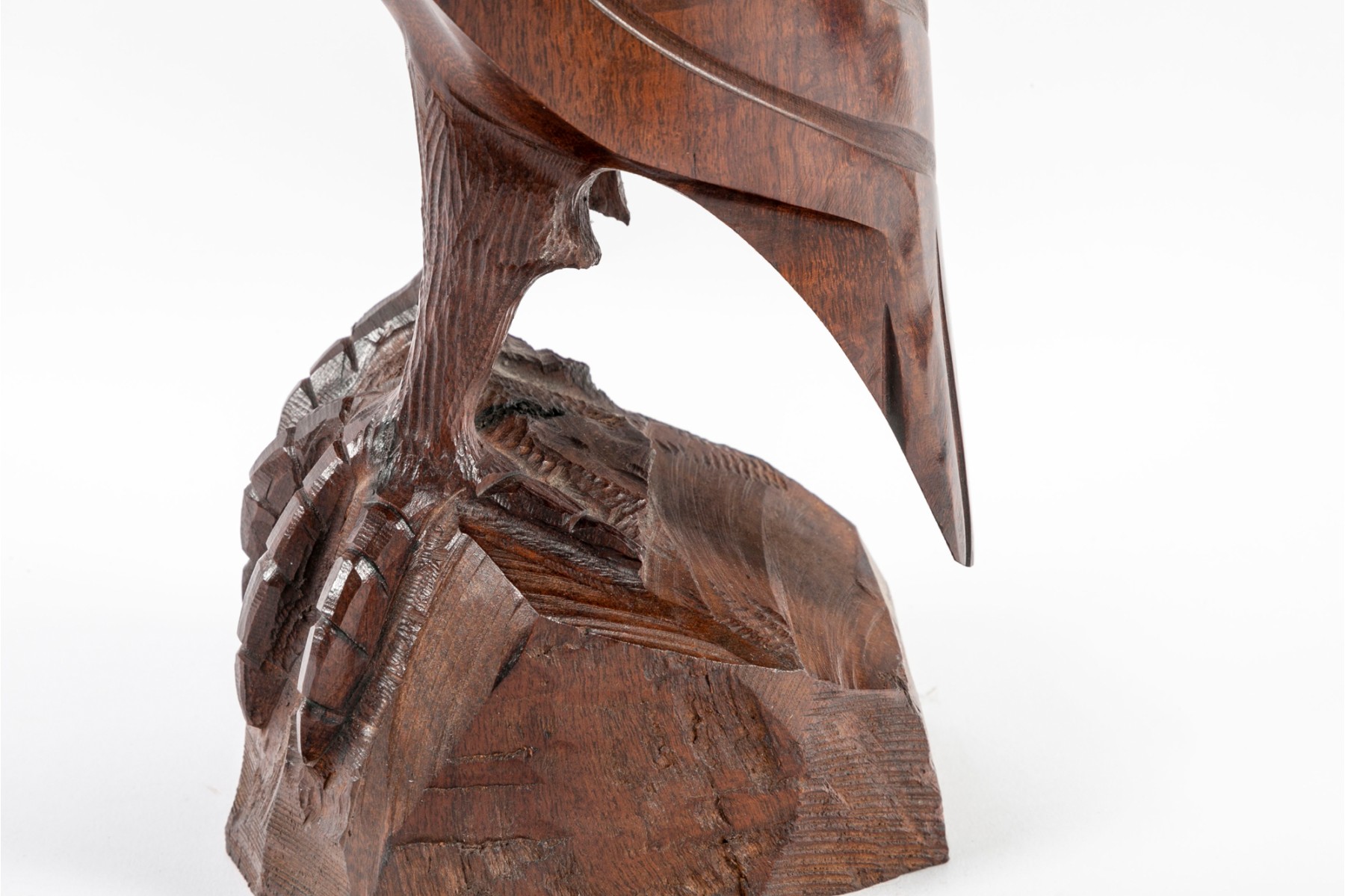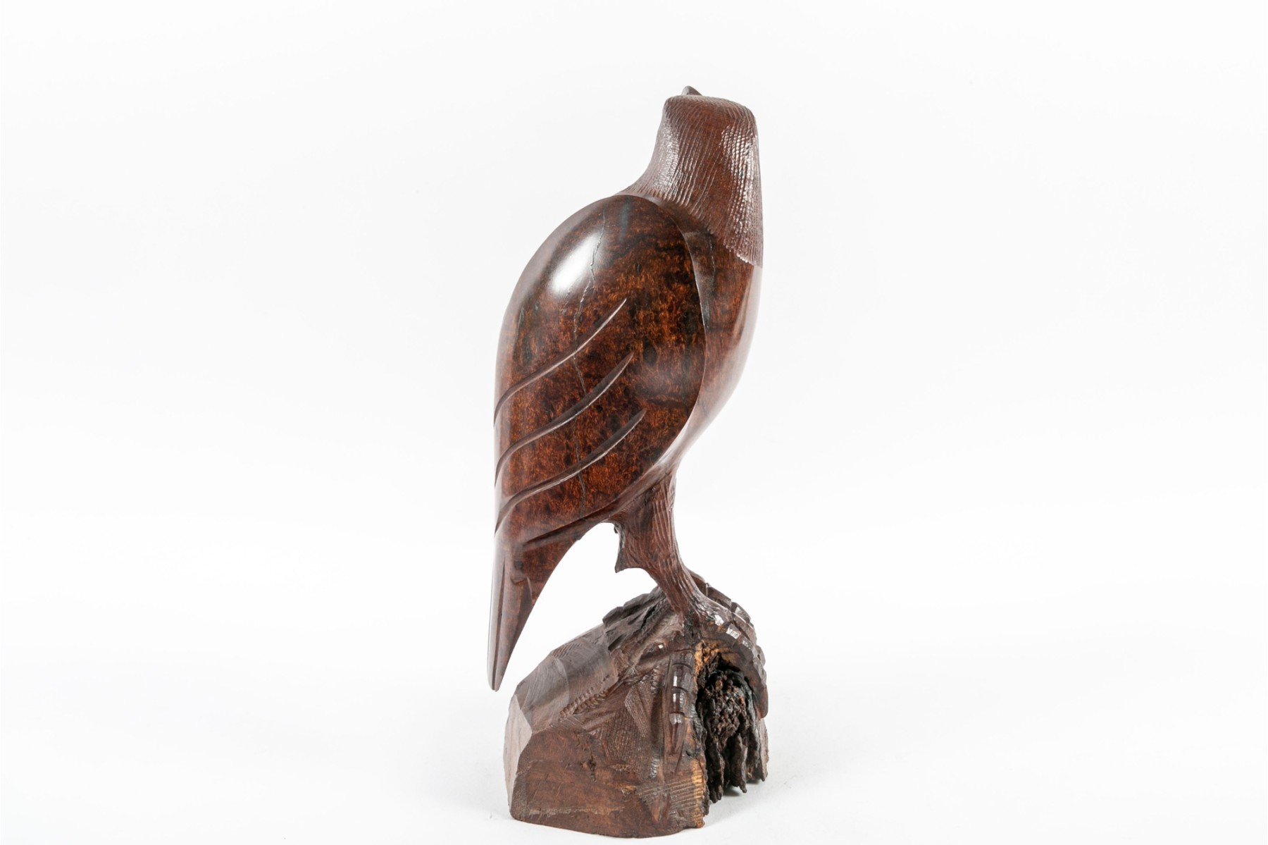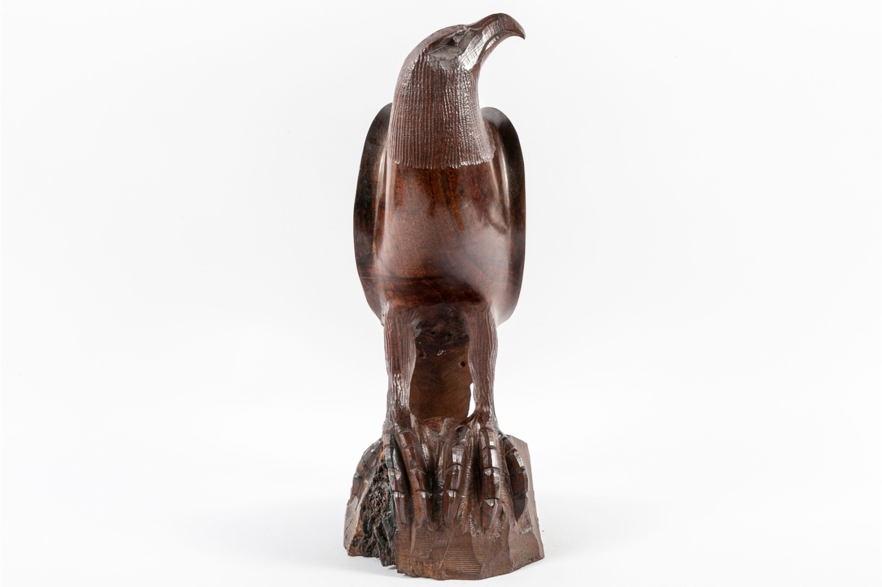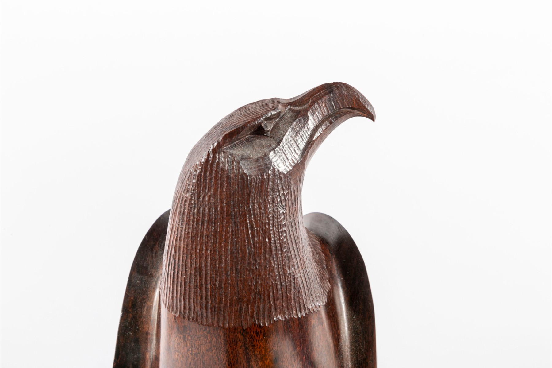 A beautiful perched eagle sculpture crafted from a single block of ironwood set in a gloss finish — unsigned and emboldened by detailed textures and facial features.